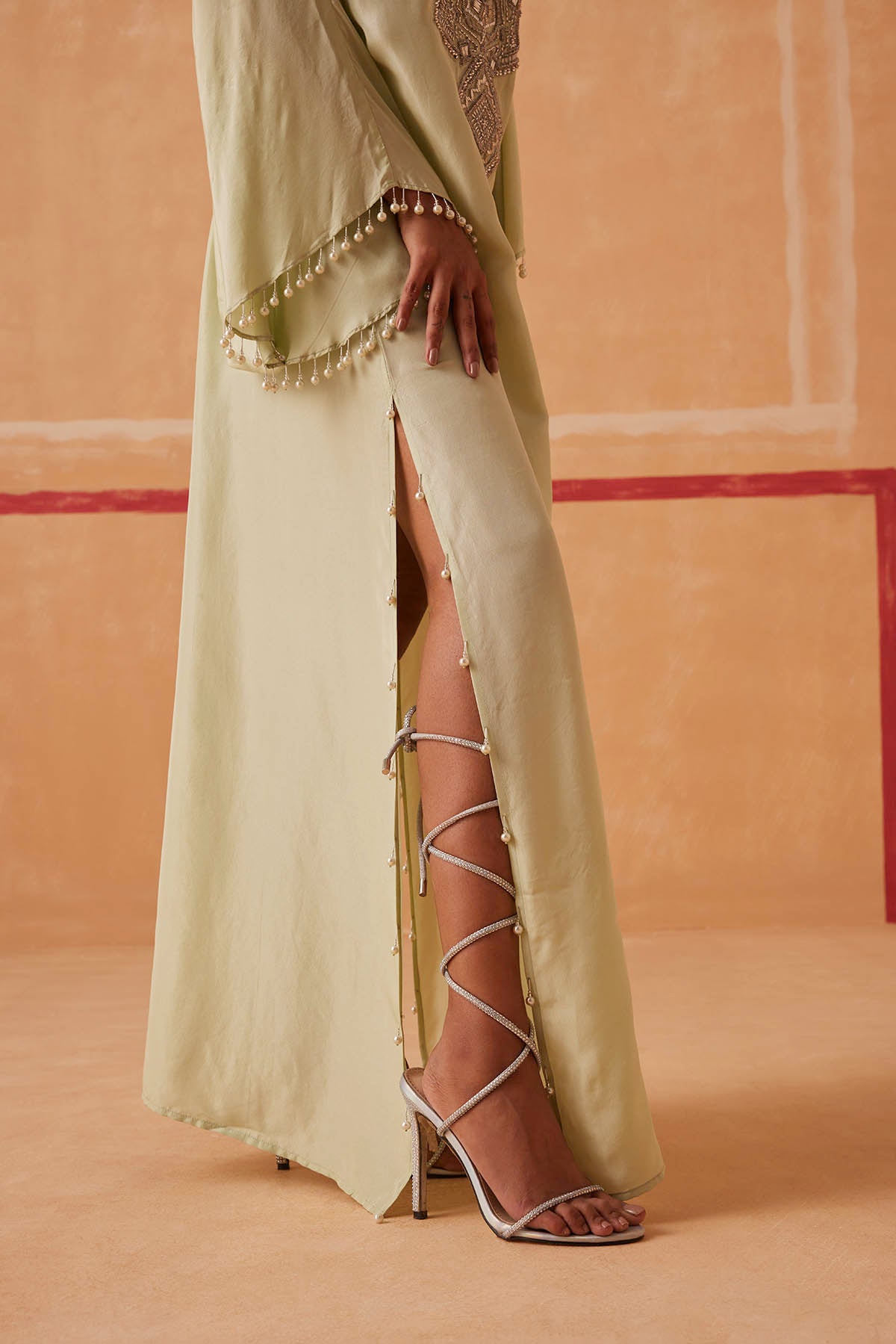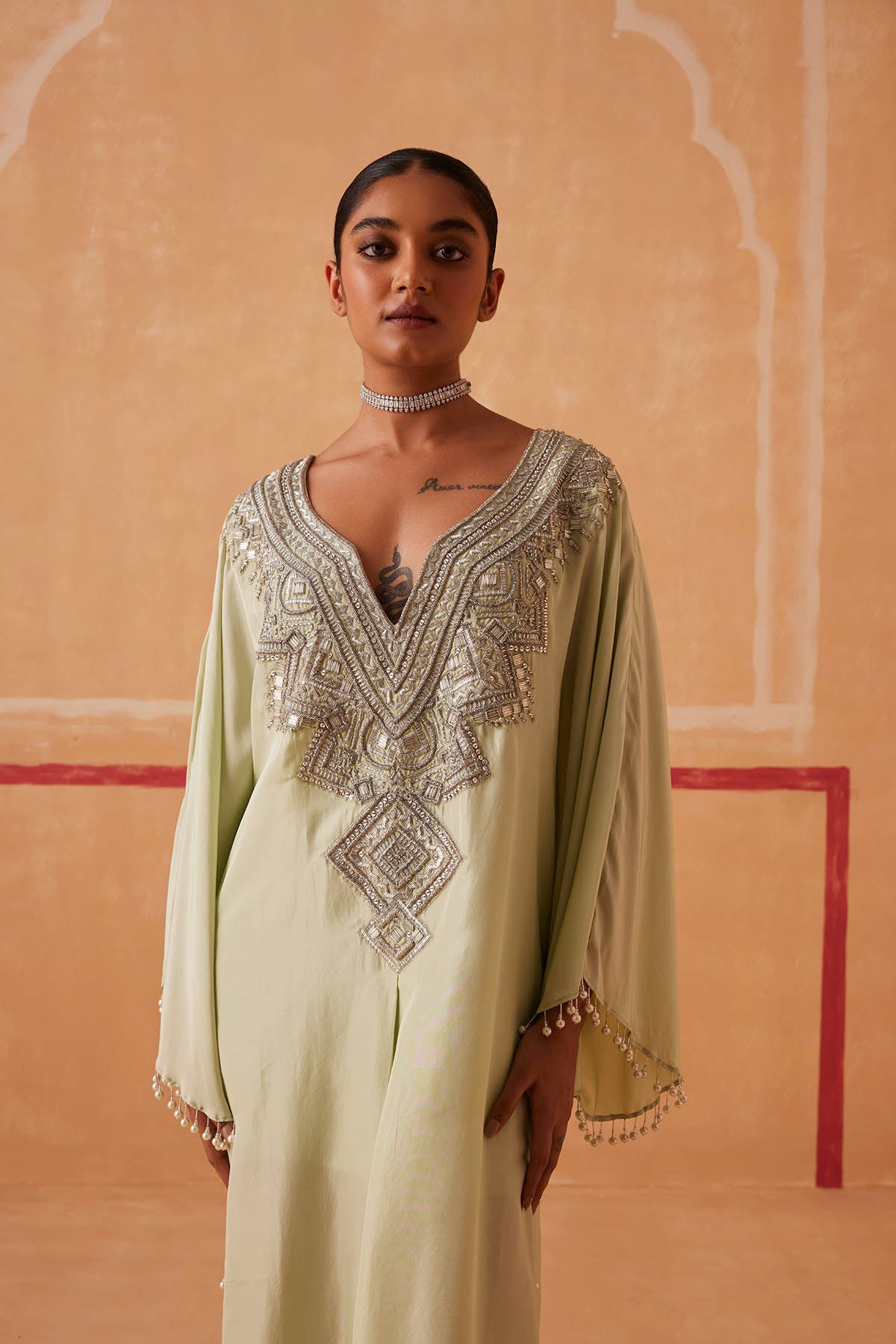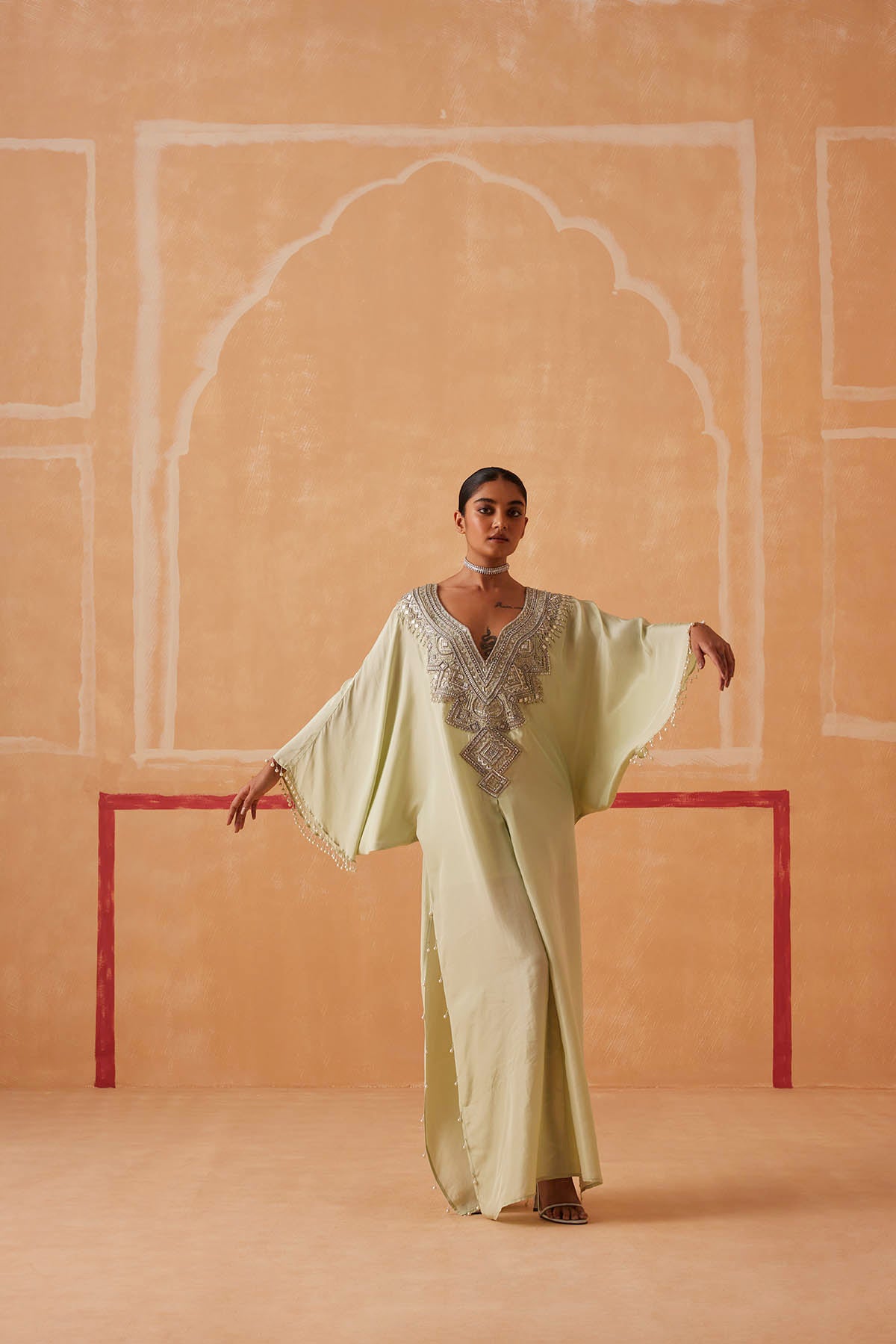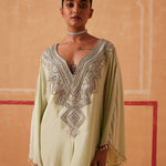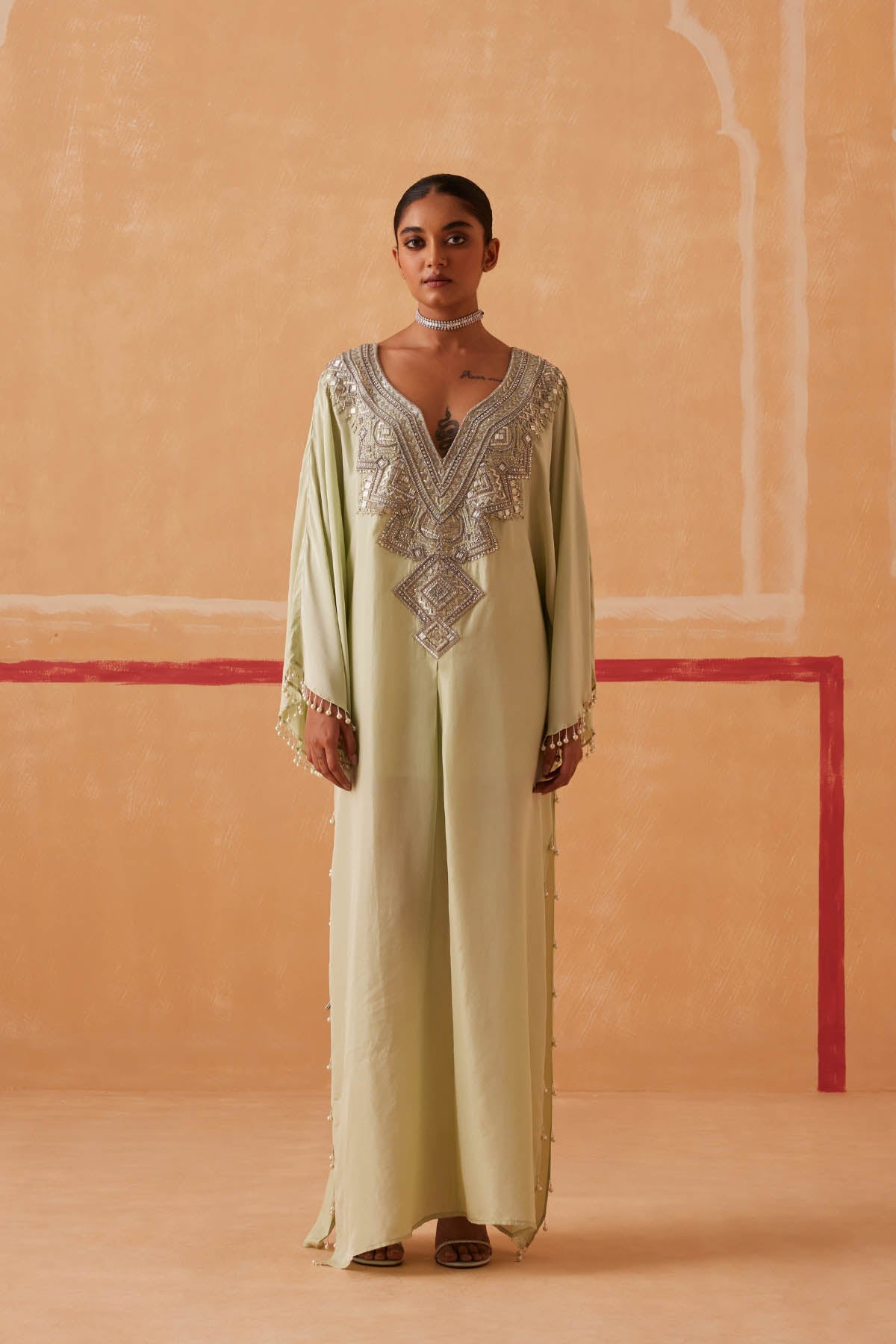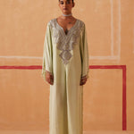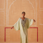 A celebration of simplicity, our Maya Kaftan creates a mesmerizing silhouette that will turn heads wherever you go. Silver piping, cutdana, and delicate beads form an exquisite neckline, while tassels add a touch of drama to the look.