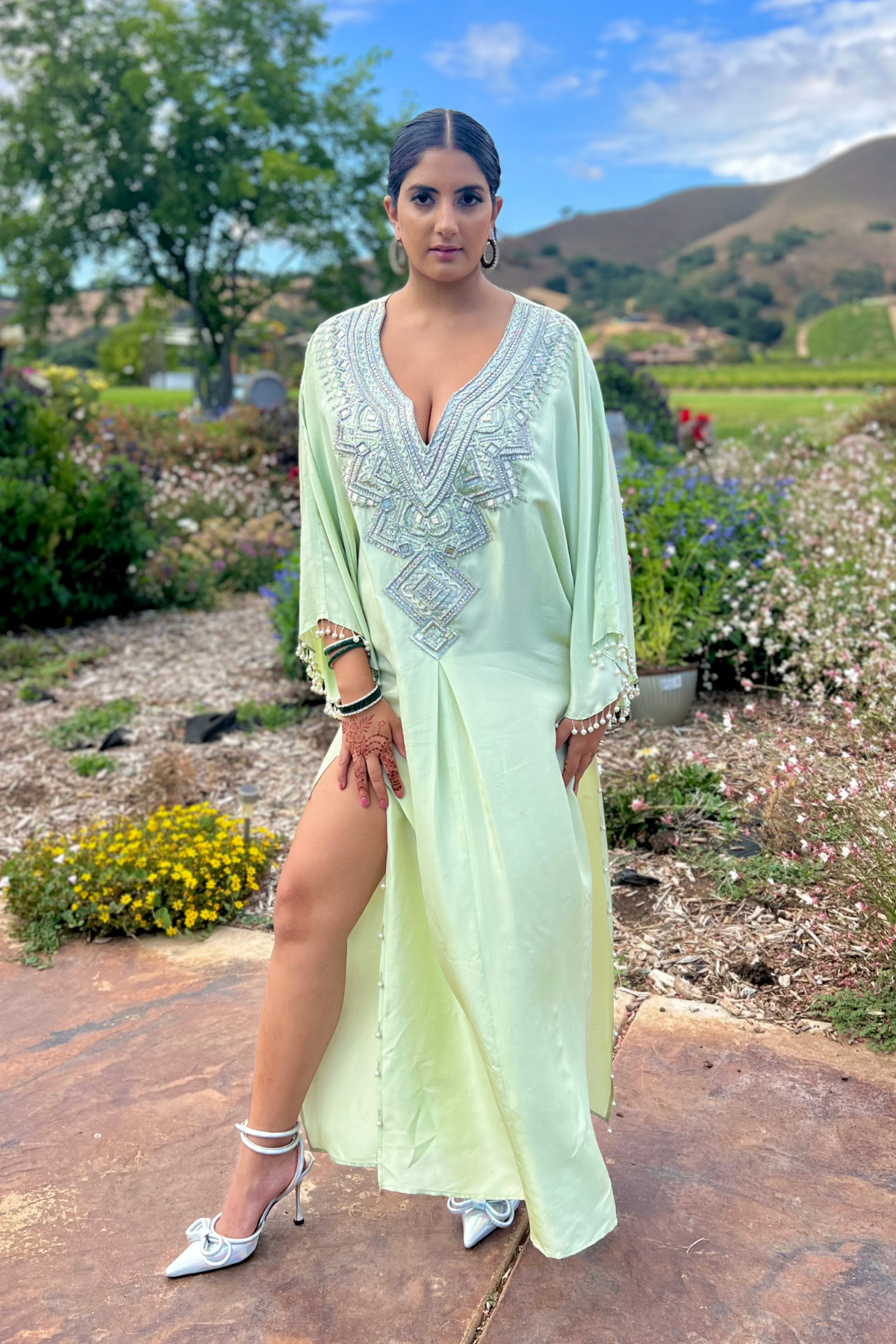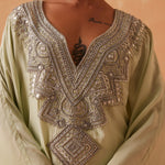 A celebration of simplicity, our Maya Kaftan creates a mesmerizing silhouette that will turn heads wherever you go. Silver piping, cutdana, and delicate beads form an exquisite neckline, while tassels add a touch of drama to the look.