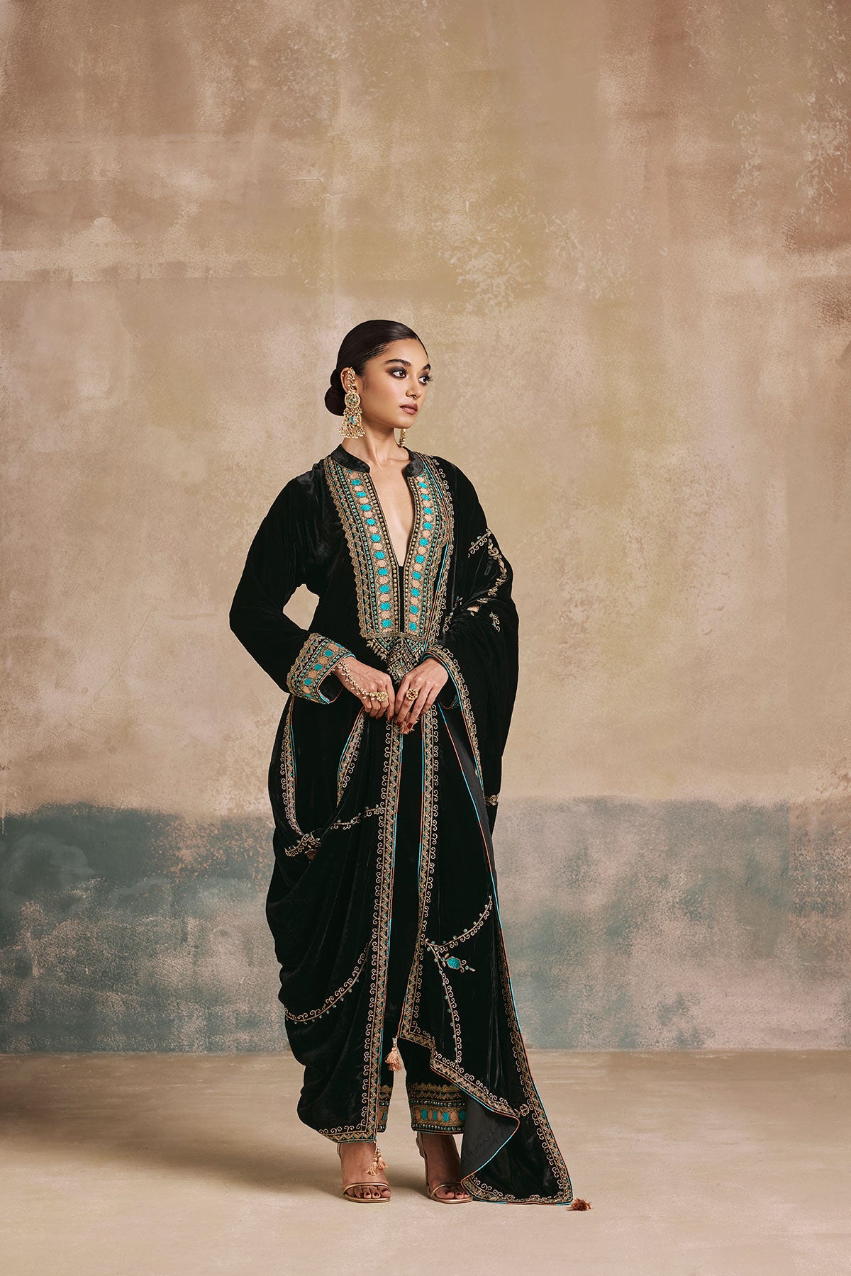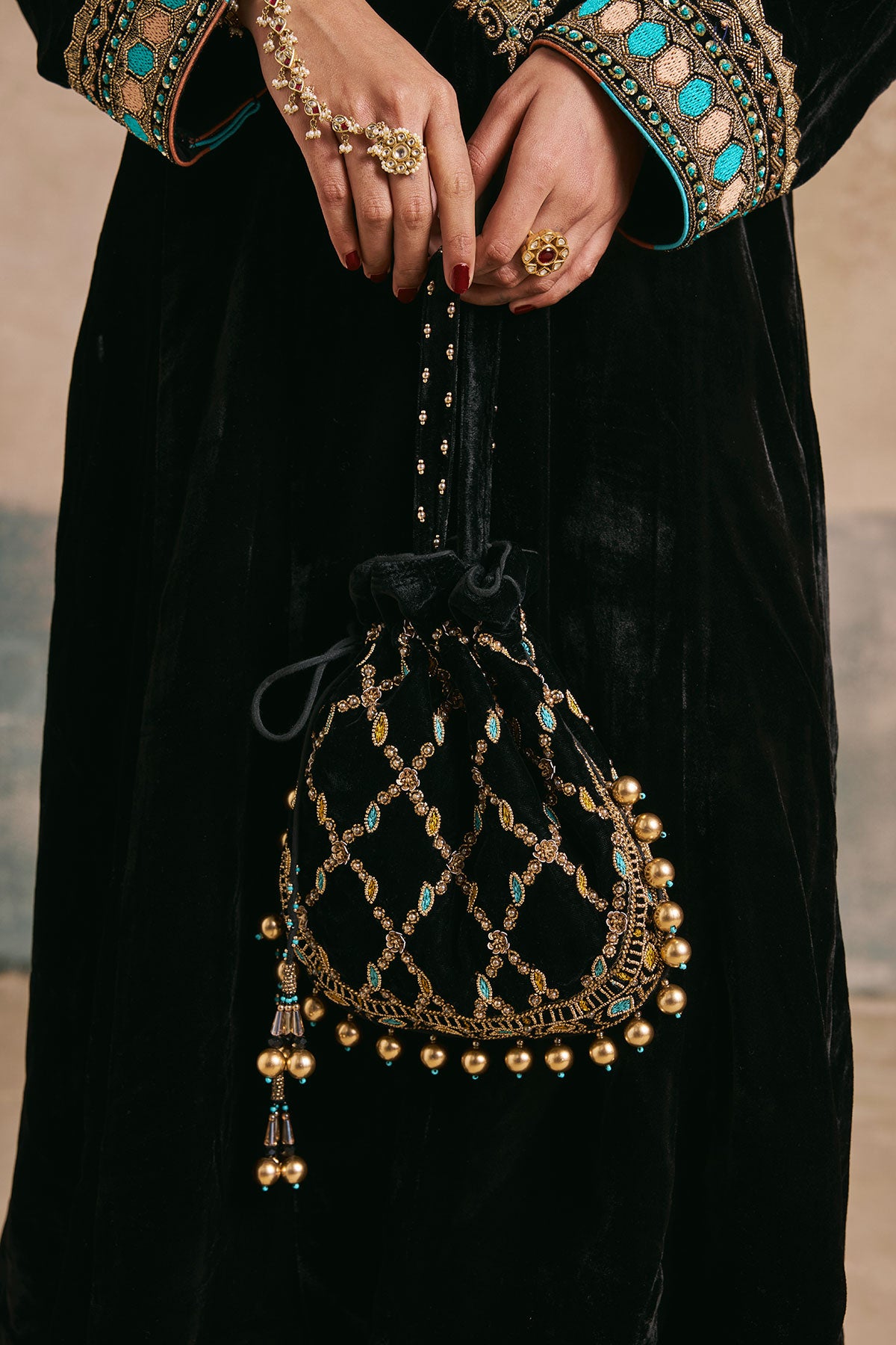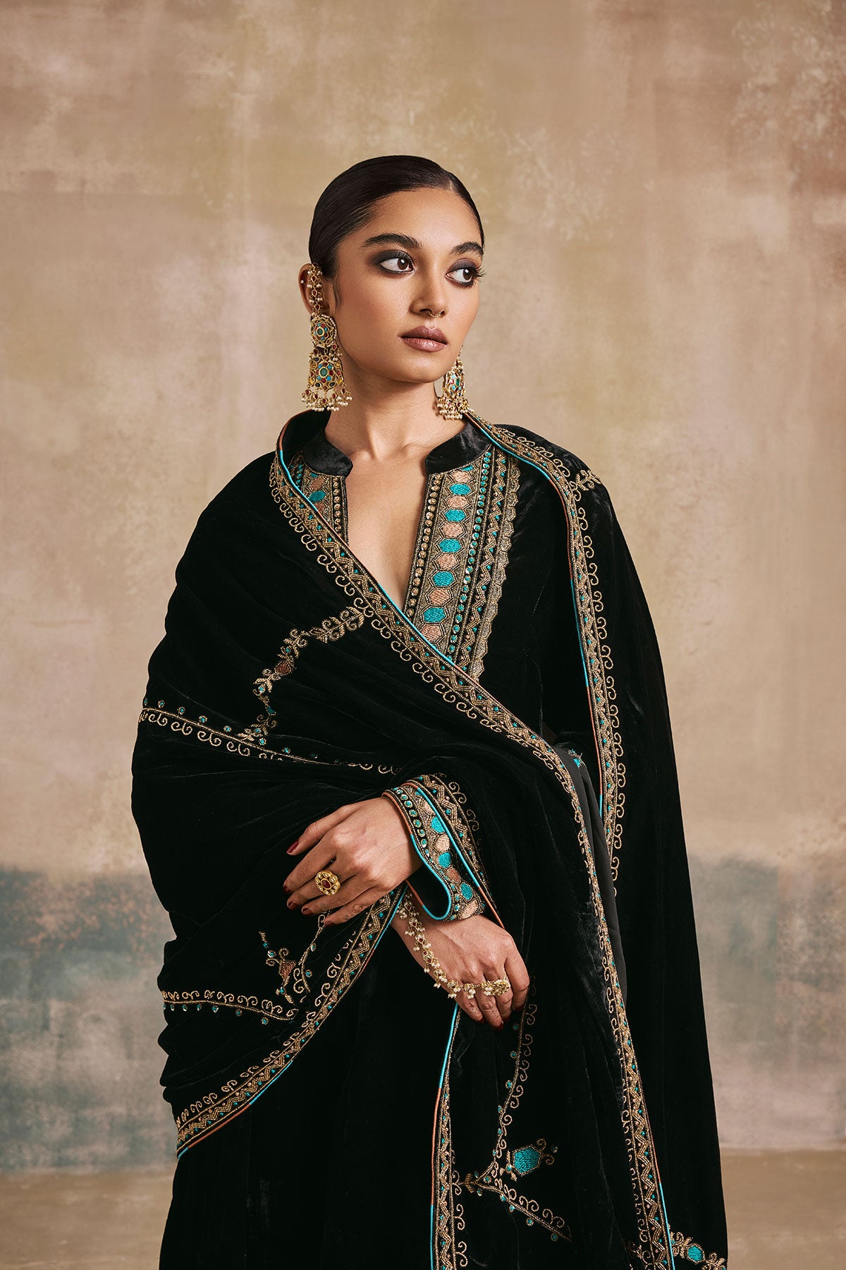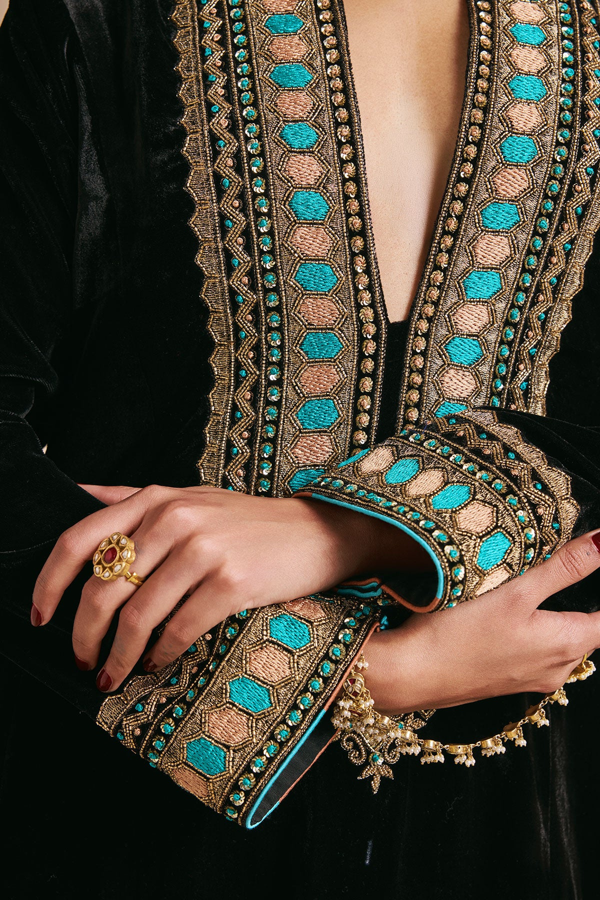 Lush black silk velvet, intricate antique gold threadwork, and eye-catching turquoise accents—this one is a showstopper in every stitch. The deep Mughal neckline and detailed finishing create a look that’s both bold and timeless. Style it with the ornate potli bag to elevate your festive wardrobe.
