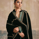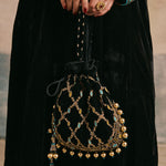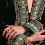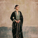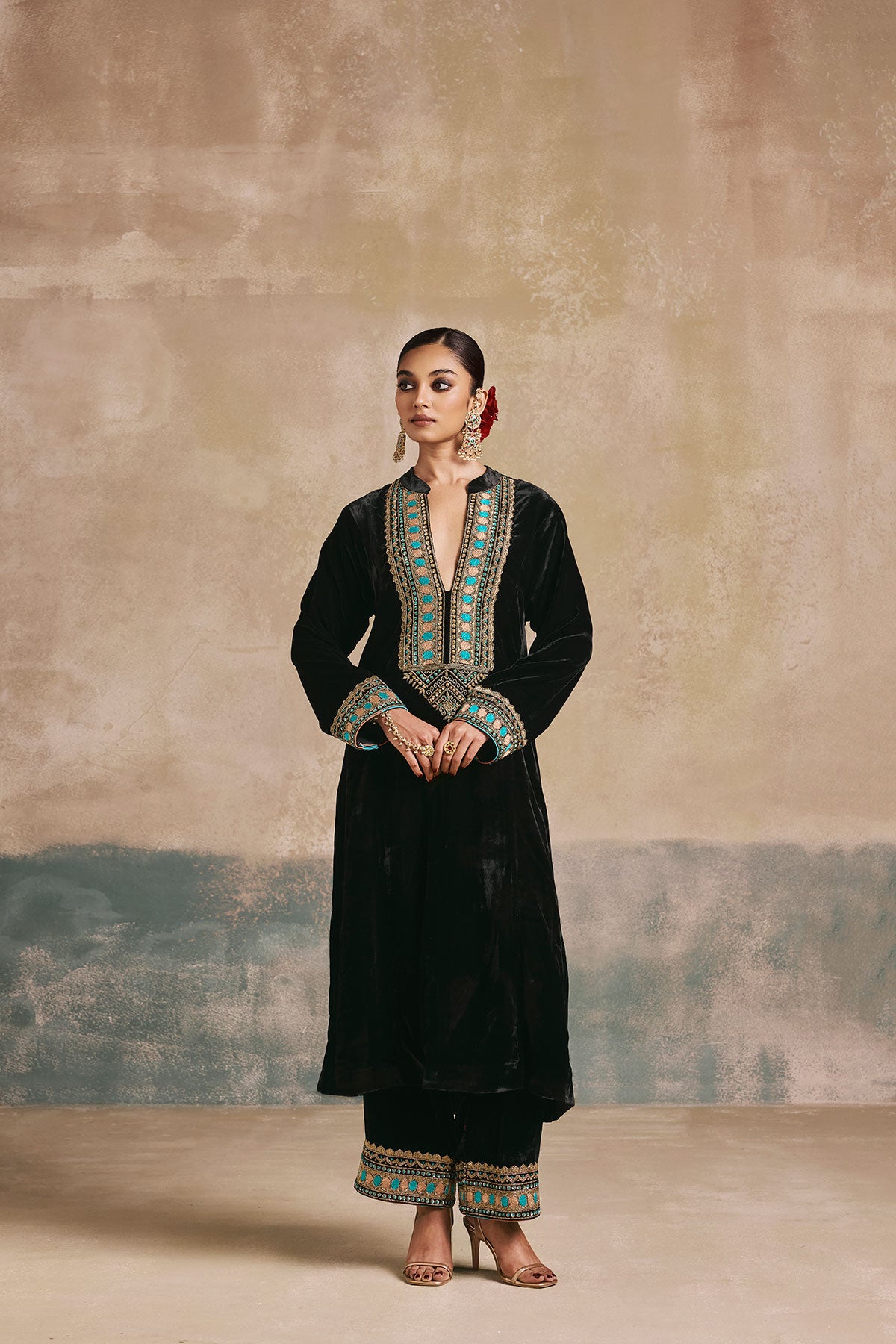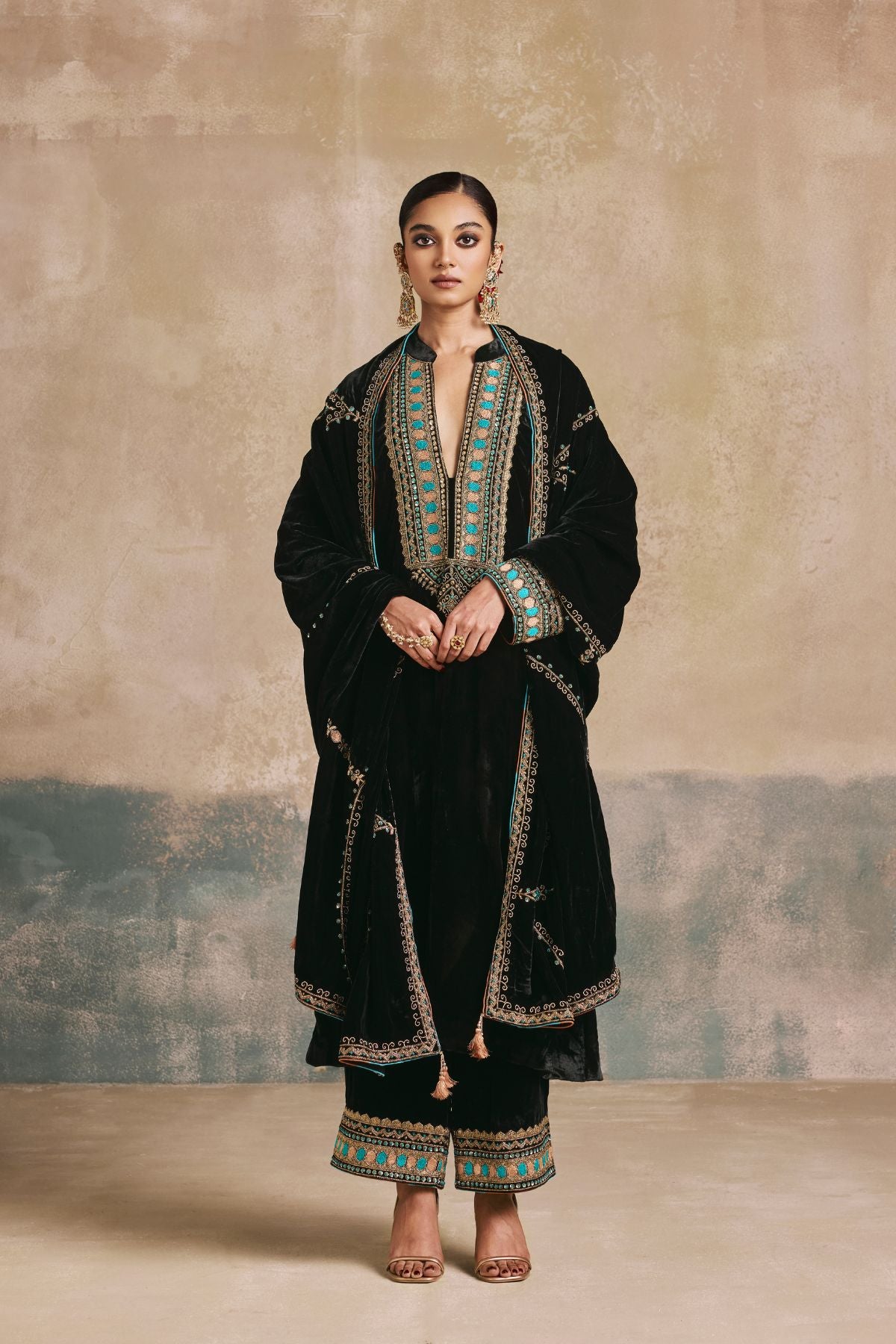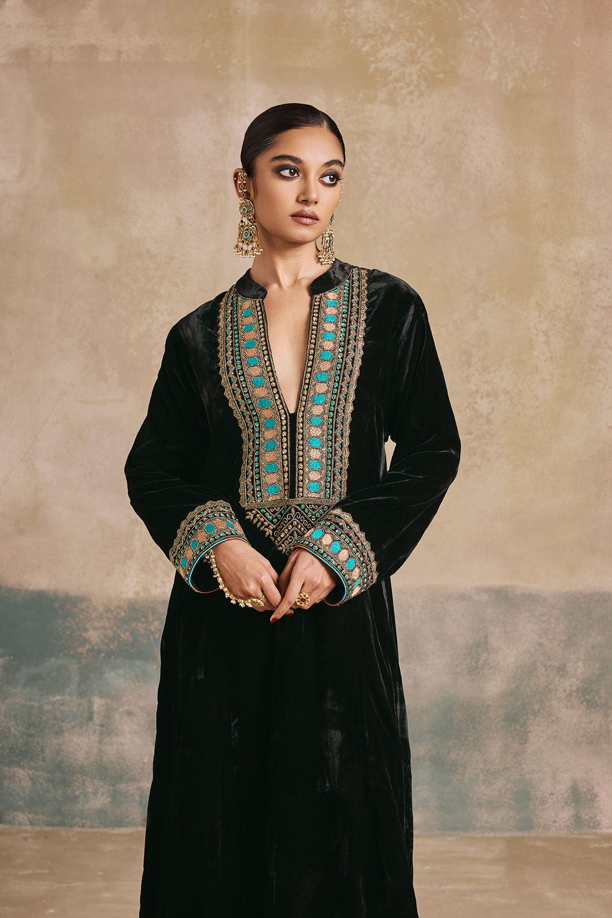 Lush black silk velvet, intricate antique gold threadwork, and eye-catching turquoise accents—this one is a showstopper in every stitch. The deep Mughal neckline and detailed finishing create a look that’s both bold and timeless. Style it with the ornate potli bag to elevate your festive wardrobe.
