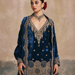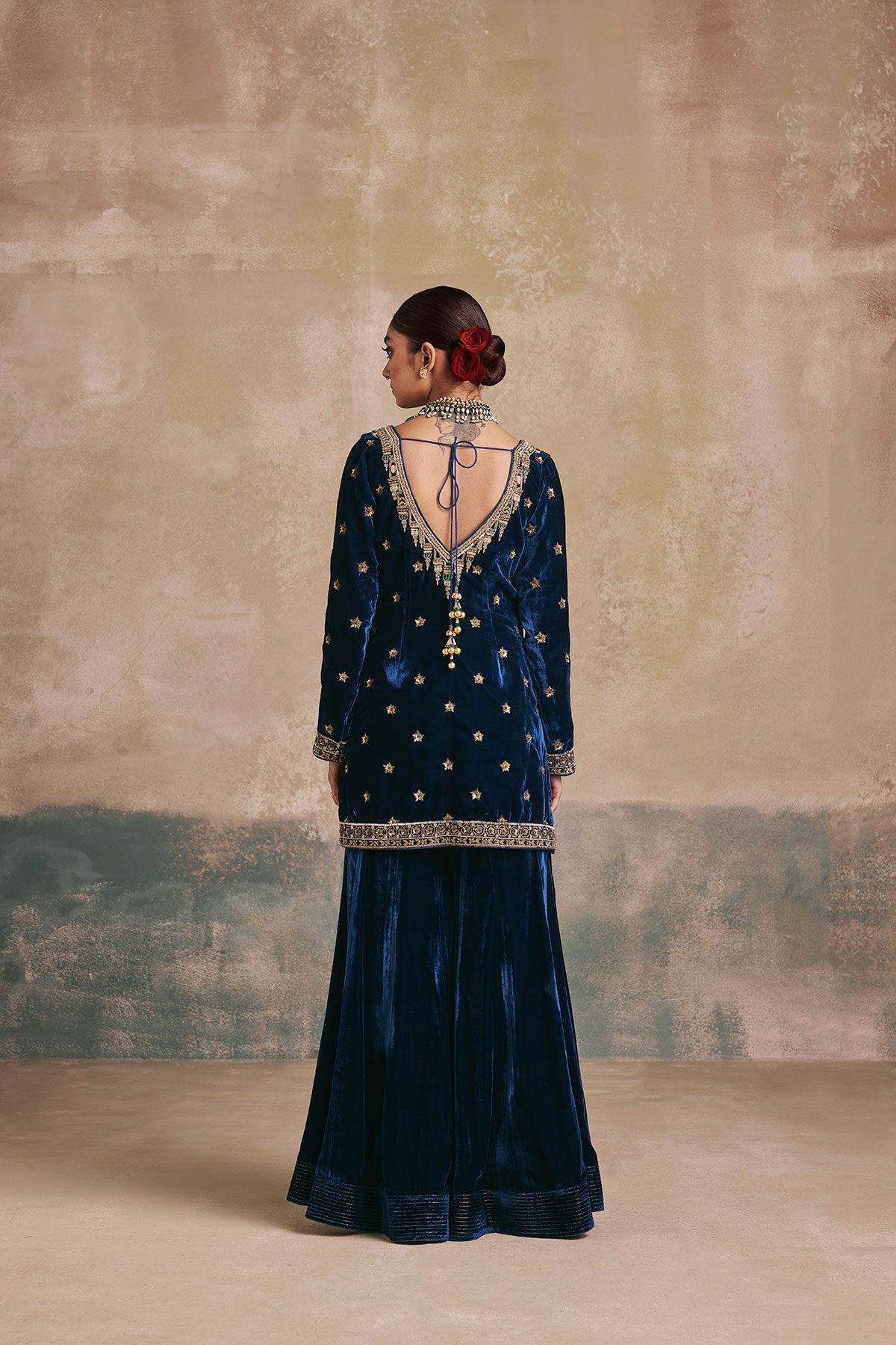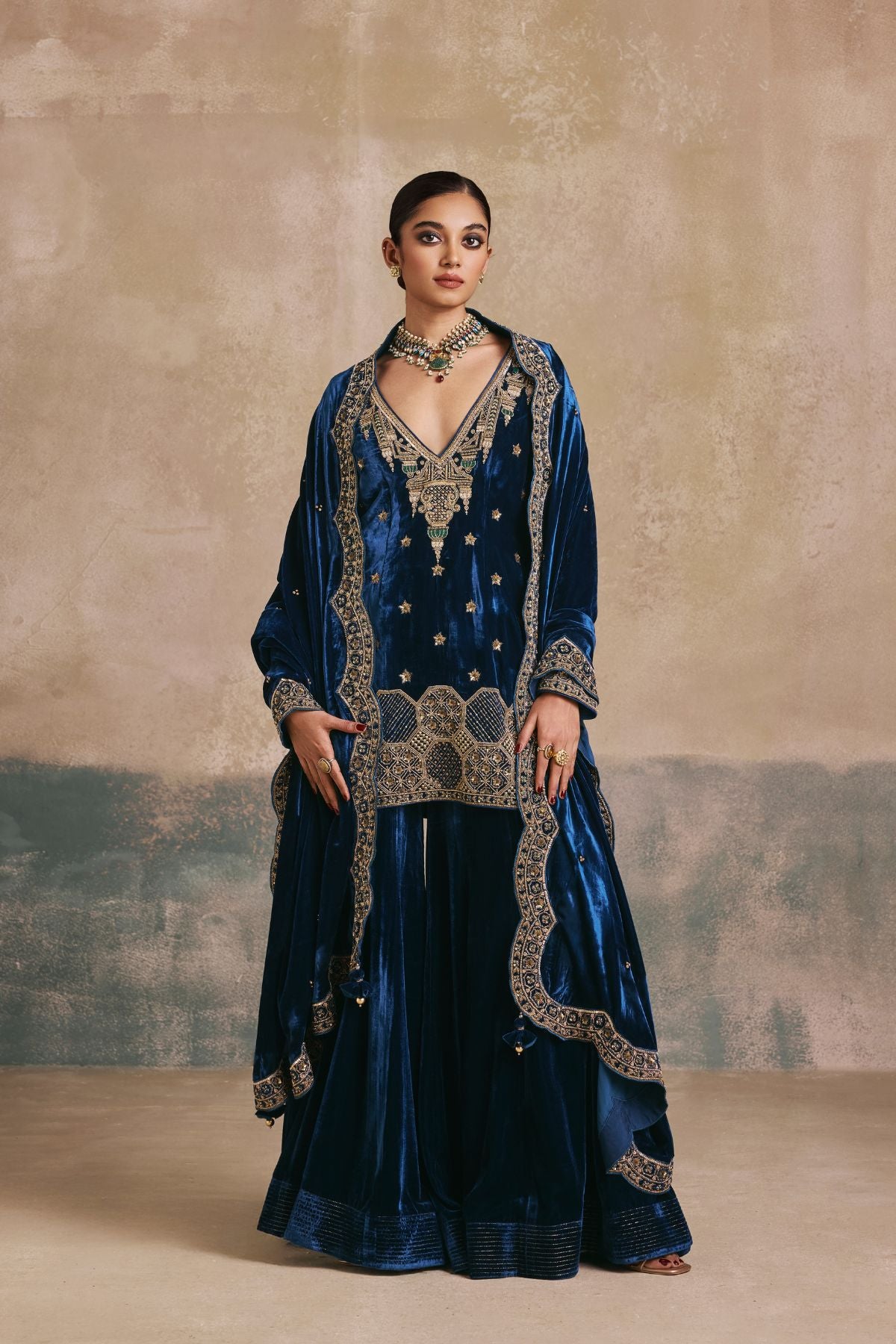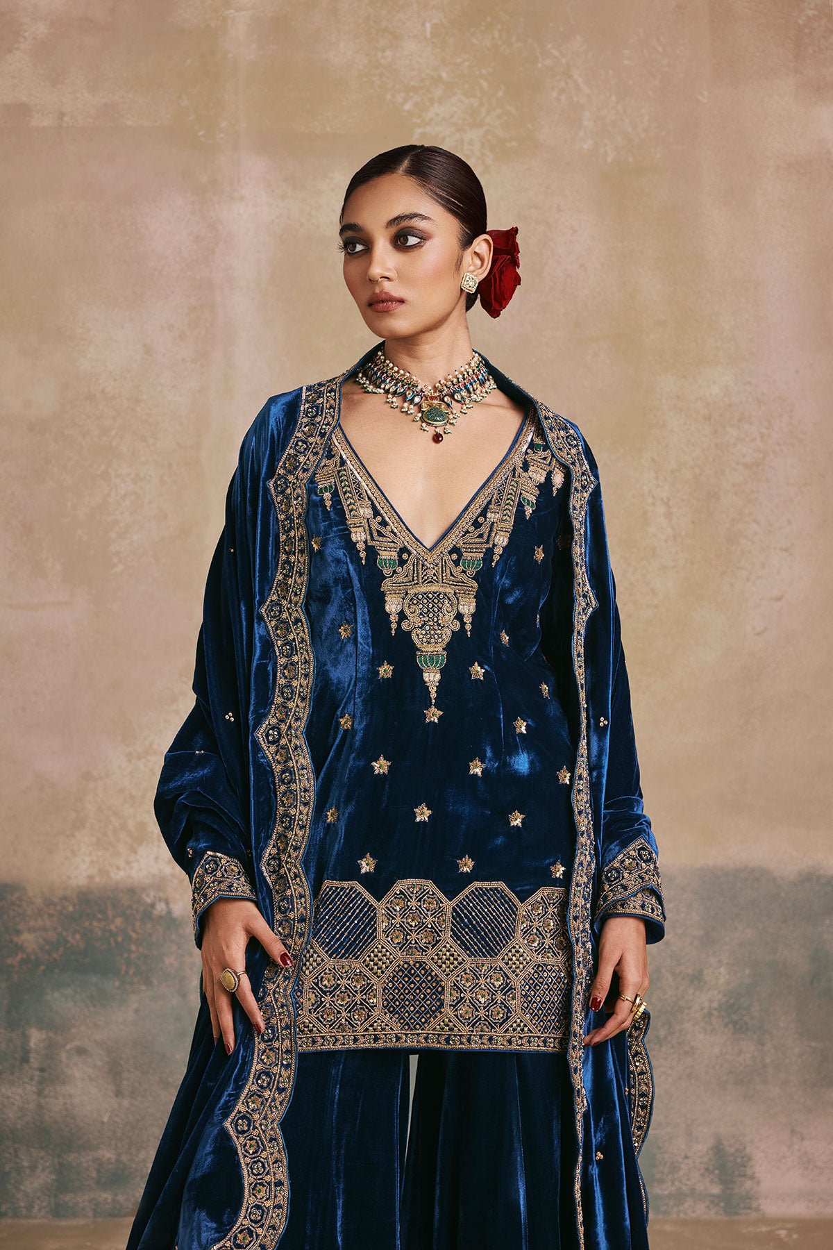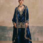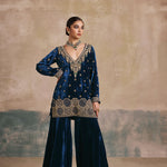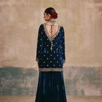 Crafted in peacock blue silk velvet, our Mehtab Gharara Set features intricate hand-embroidered motifs, antique gold detailing, and a flowy silhouette. The regal kurta comes paired with flared trousers and a scalloped dupatta, creating an effortlessly timeless look.