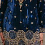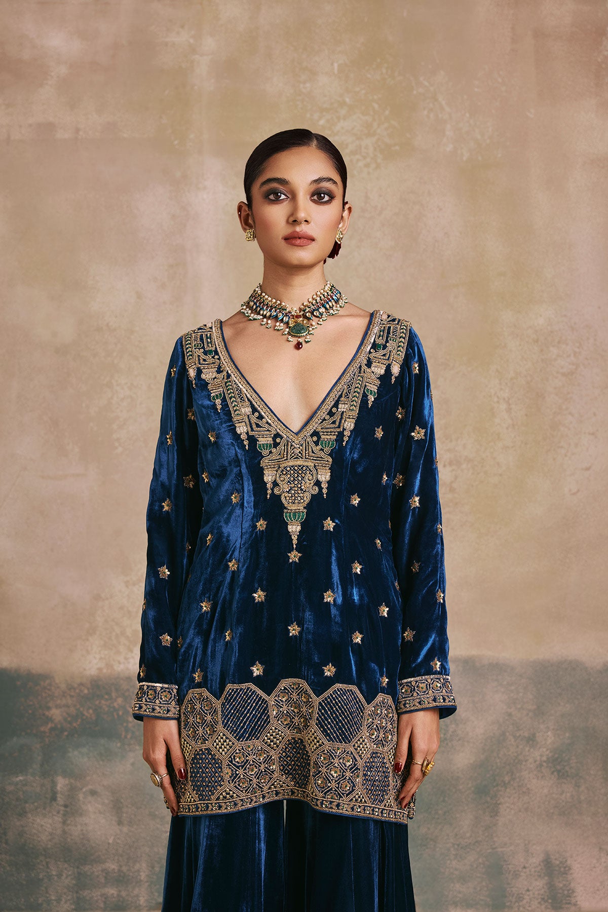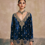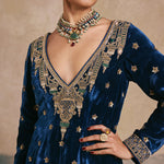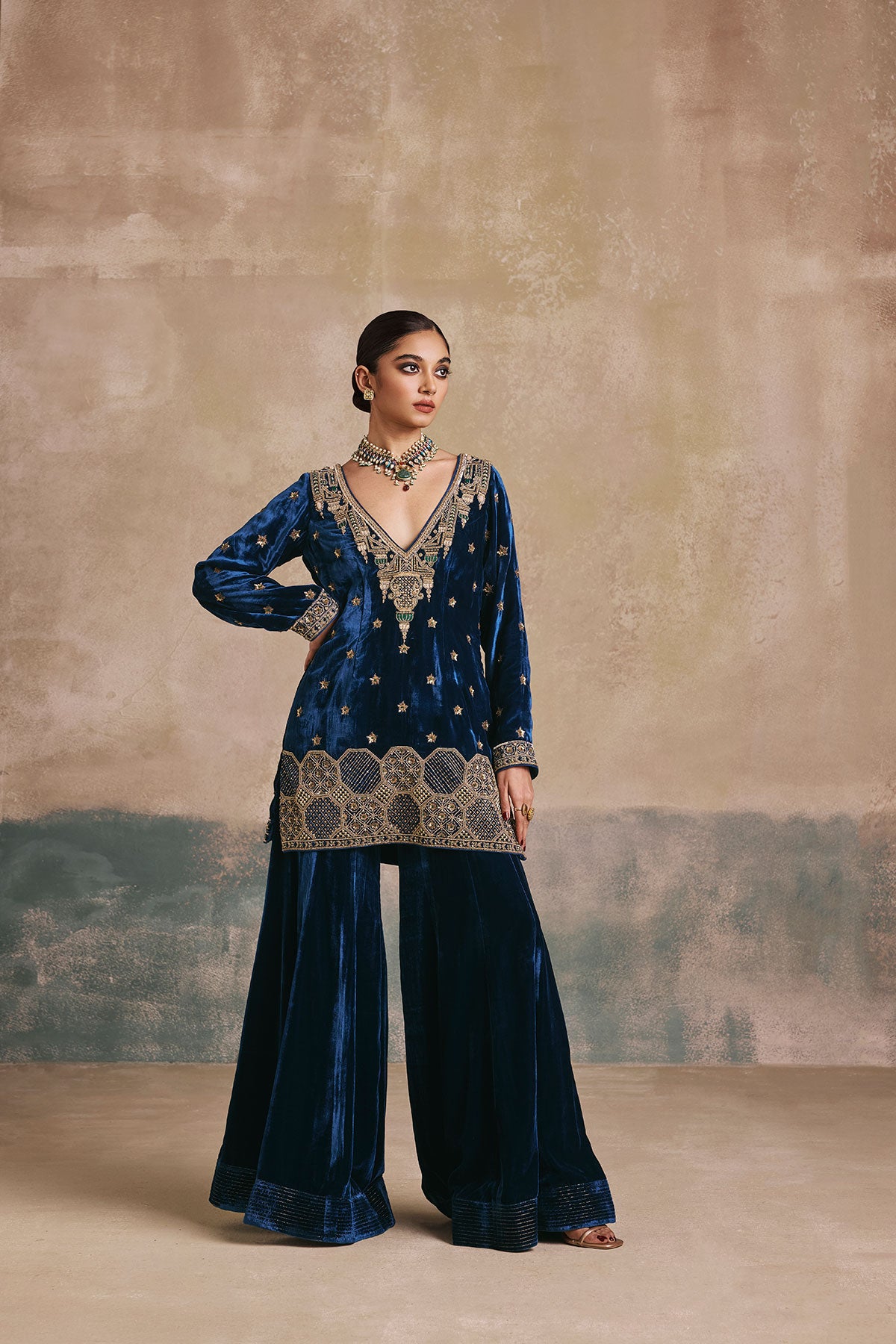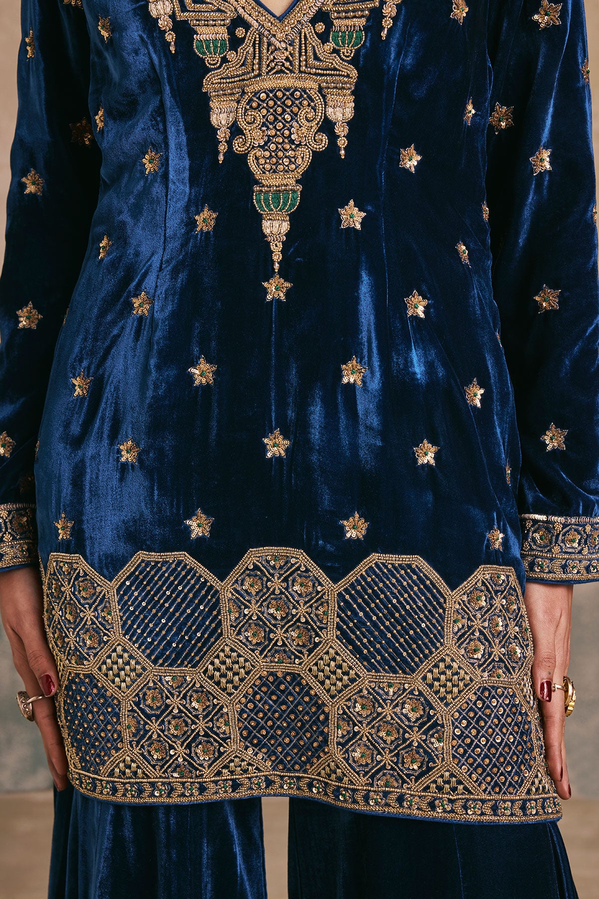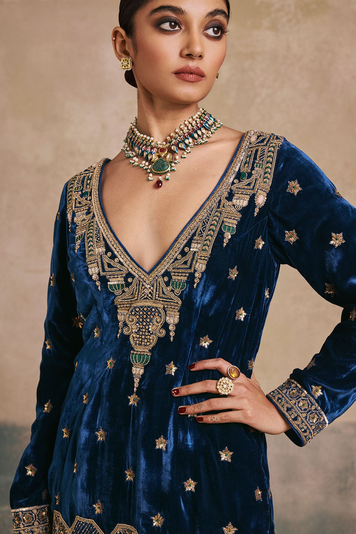 Crafted in peacock blue silk velvet, our Mehtab Gharara Set features intricate hand-embroidered motifs, antique gold detailing, and a flowy silhouette. The regal kurta comes paired with flared trousers and a scalloped dupatta, creating an effortlessly timeless look.