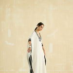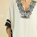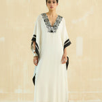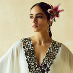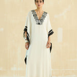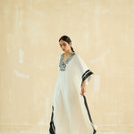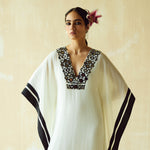 Ivory muslin drapes down the shoulder to the ankle in this floor-skimming kaftan with a plunging neckline and contrast appliqué panel hemming the sides. The yoke is embroidered with abstract mirrors that are all about easy AM to PM elegance.