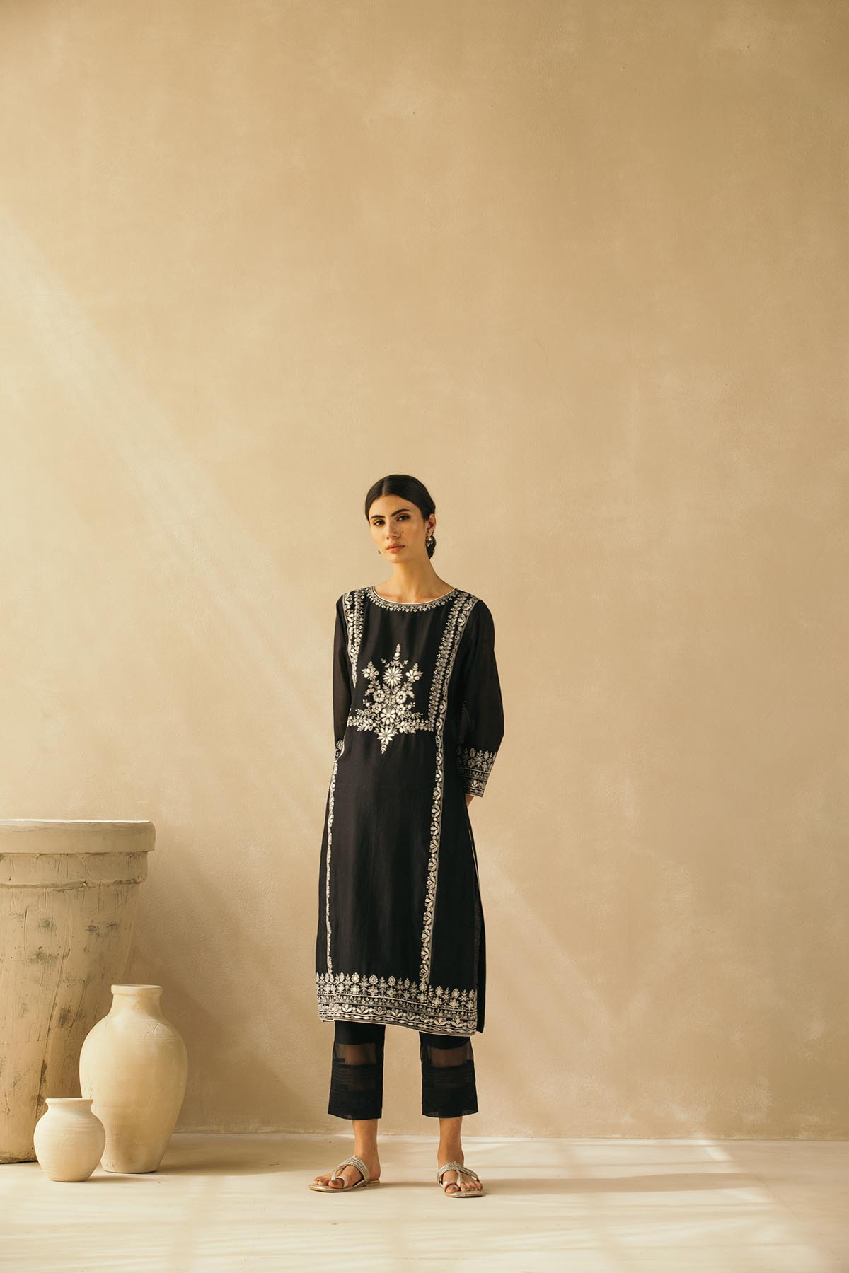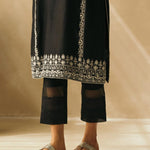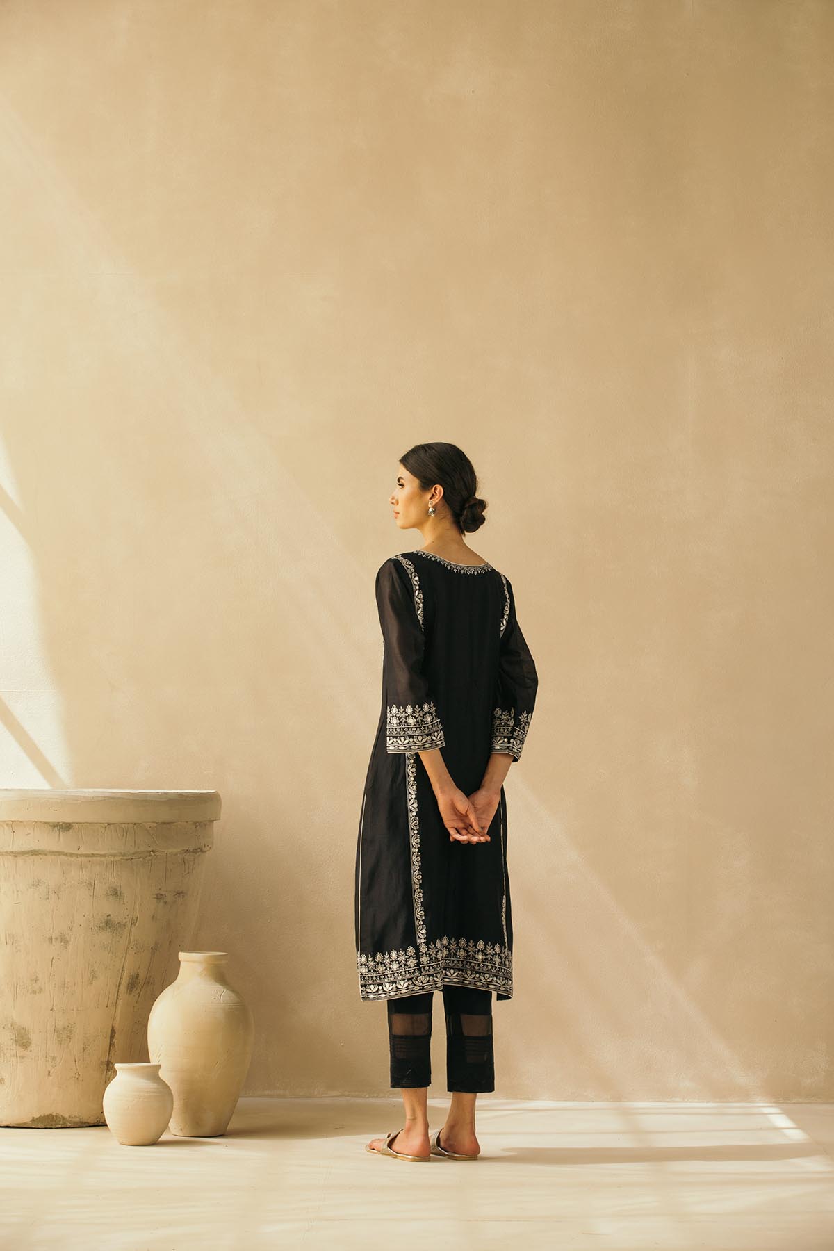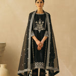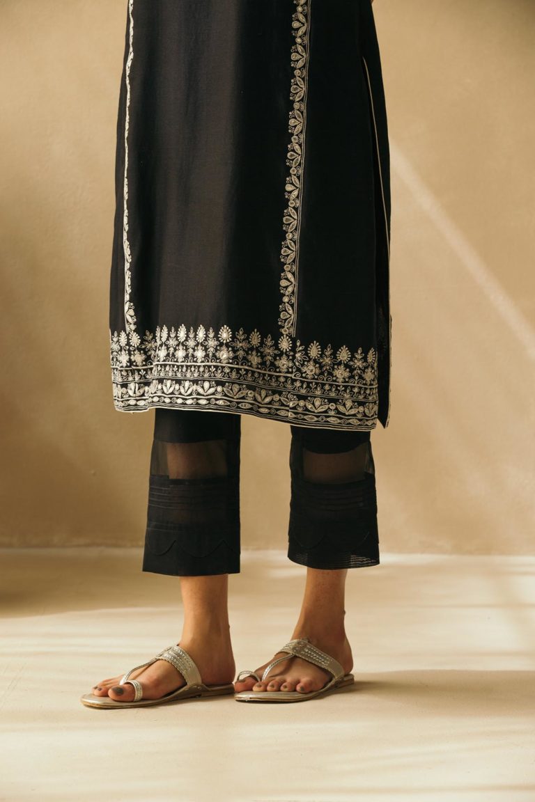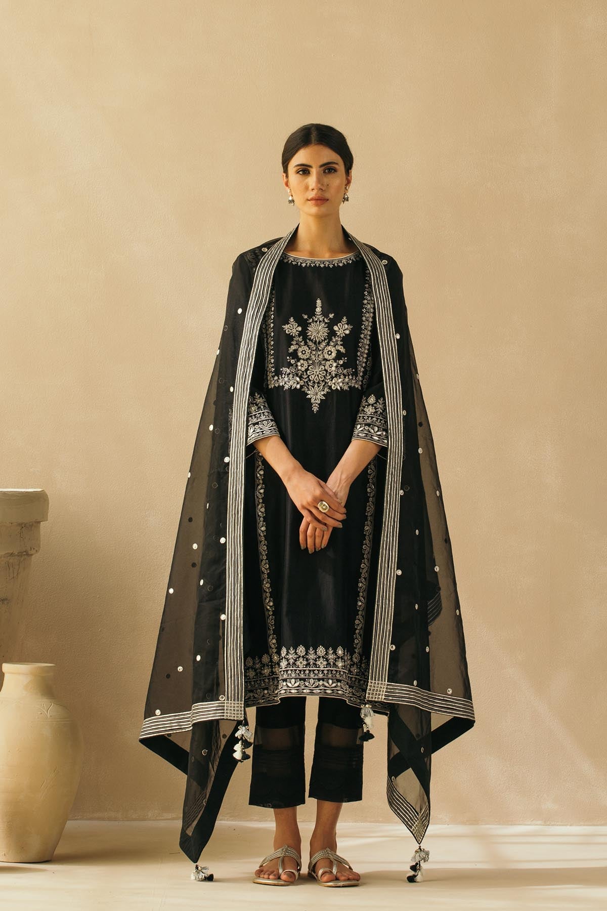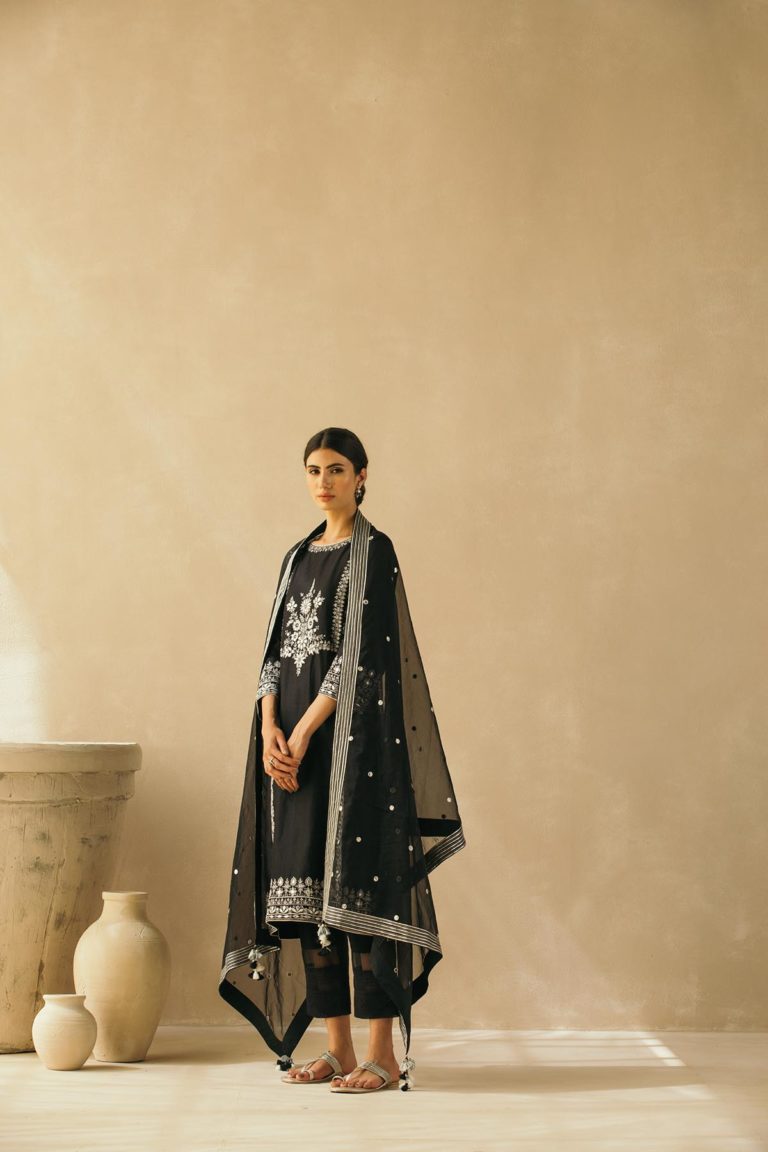 Gota work on midnight silk chanderi, organza panelled pin-tucked silk chanderi pants, and an organza dupatta edged and dotted with gota and hand-finished tassels—textures, techniques, and timeless elegance.
