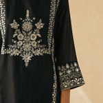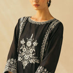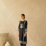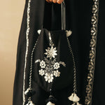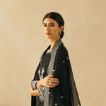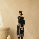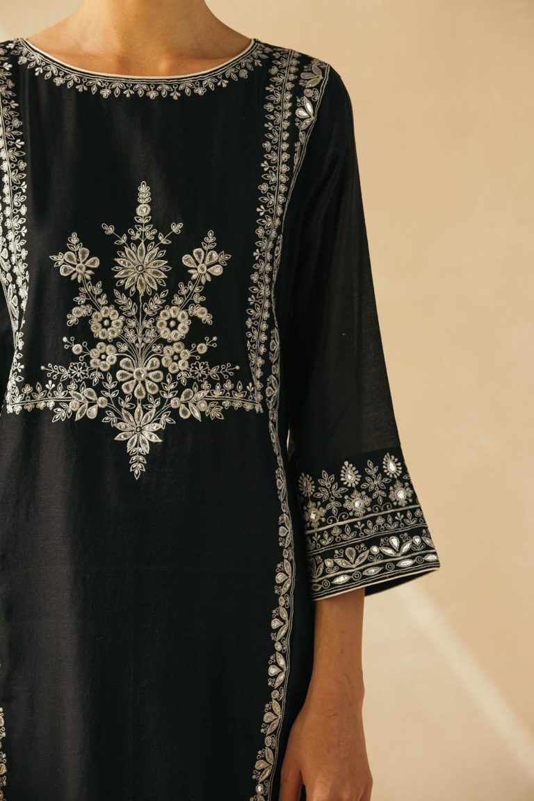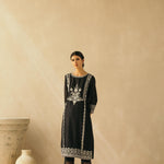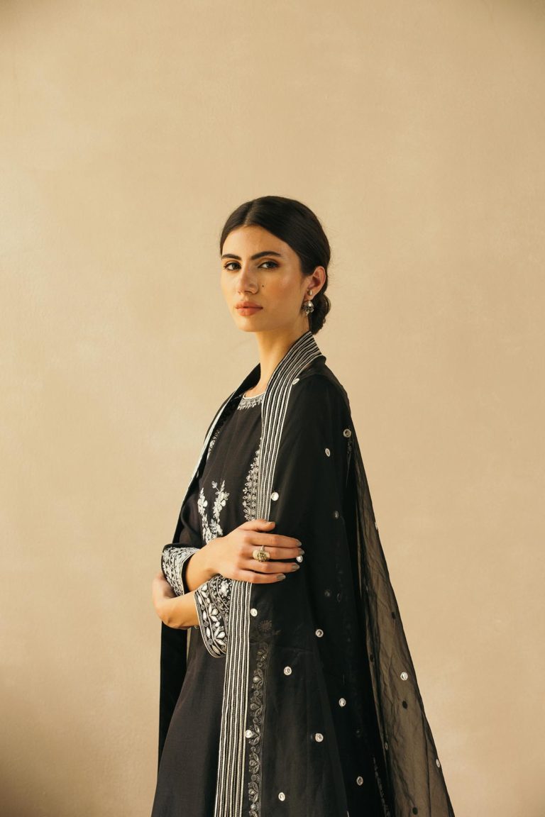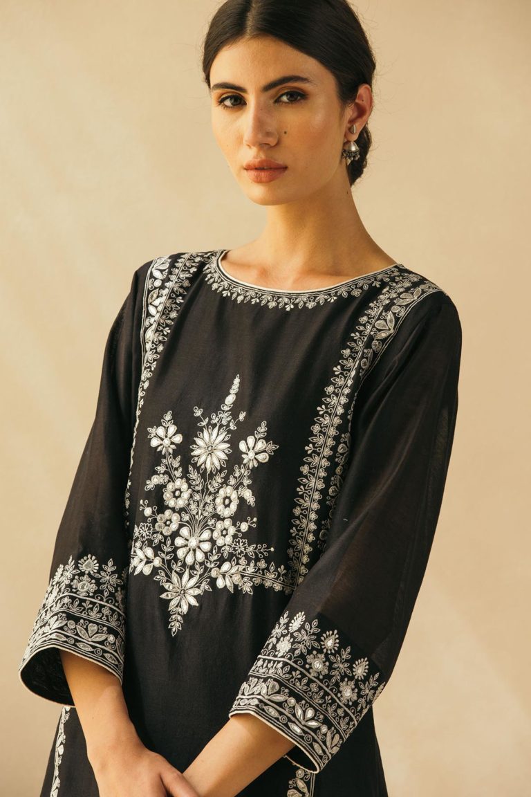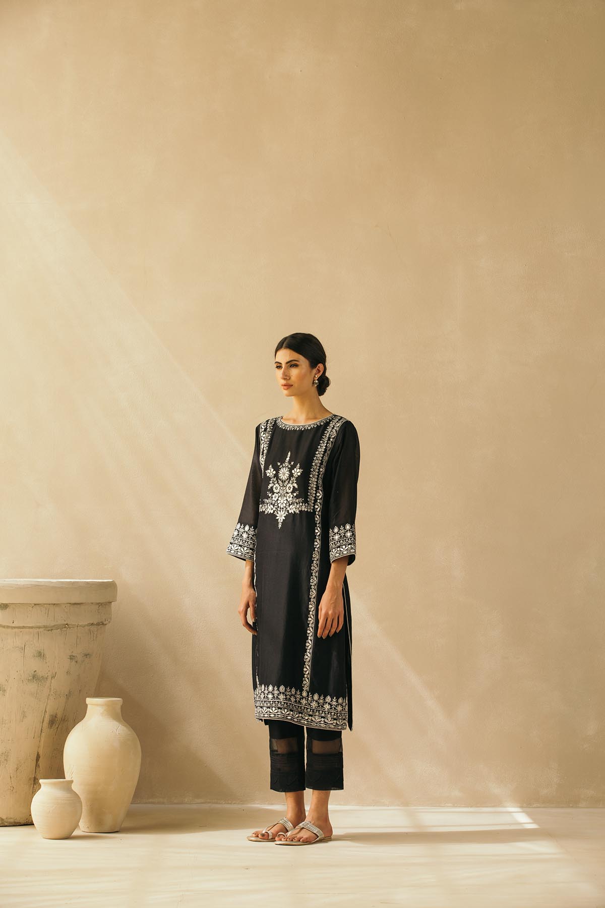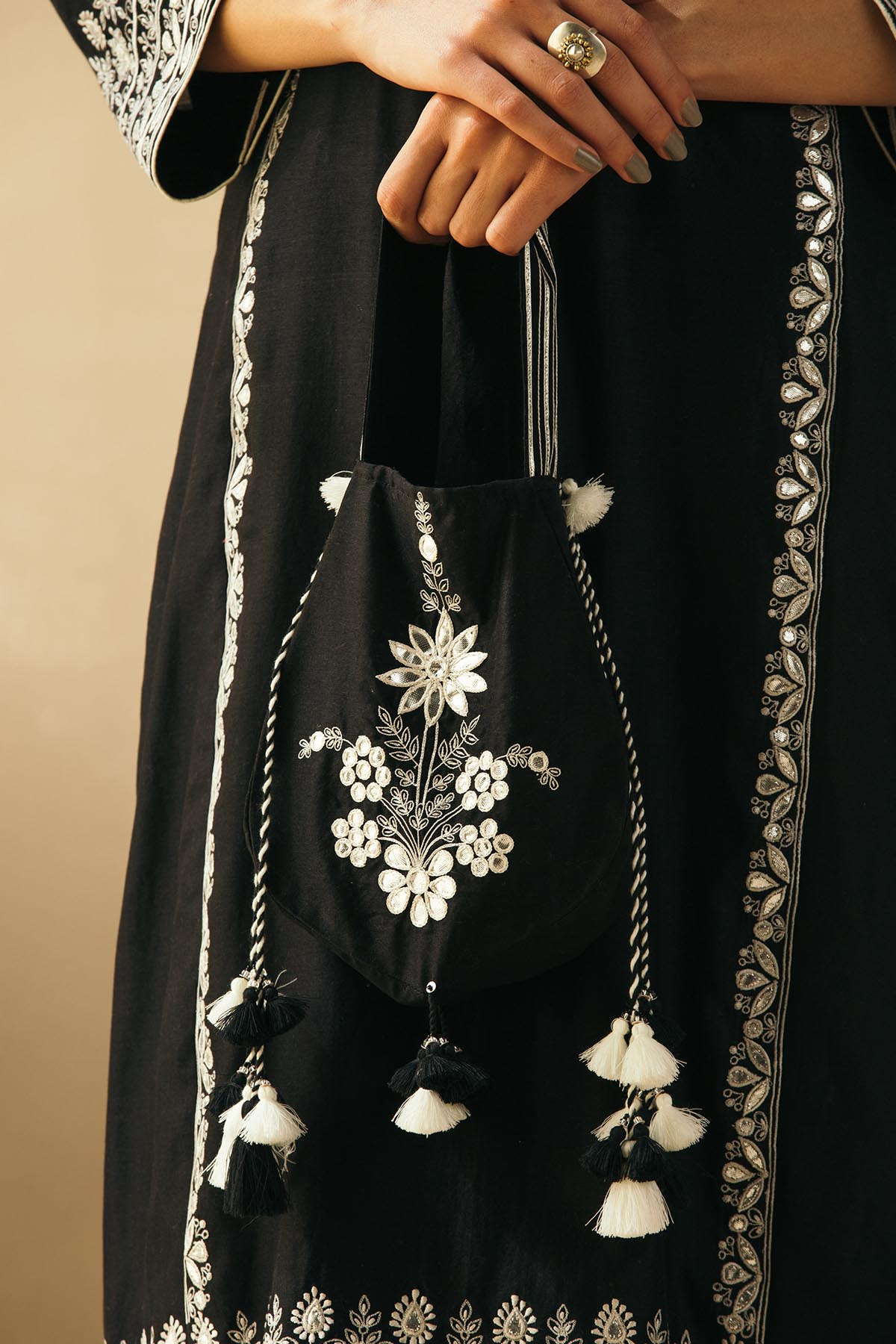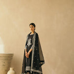 Gota work on midnight silk chanderi, organza panelled pin-tucked silk chanderi pants, and an organza dupatta edged and dotted with gota and hand-finished tassels—textures, techniques, and timeless elegance.