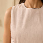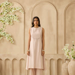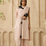 Perfect for balmy summer nights, this sleeveless silk chanderi set is a house favourite. The yoke of the kurta is highlighted with intricate narrow pin tucks while the bottoms are masterfully scalloped into geometric shapes. Complete the look with a sheer organza dupatta that comes with abstract placements of 3D floral patchwork.