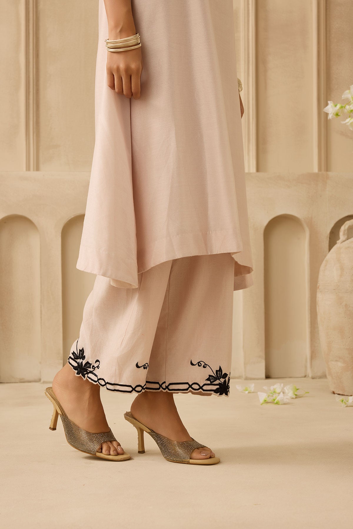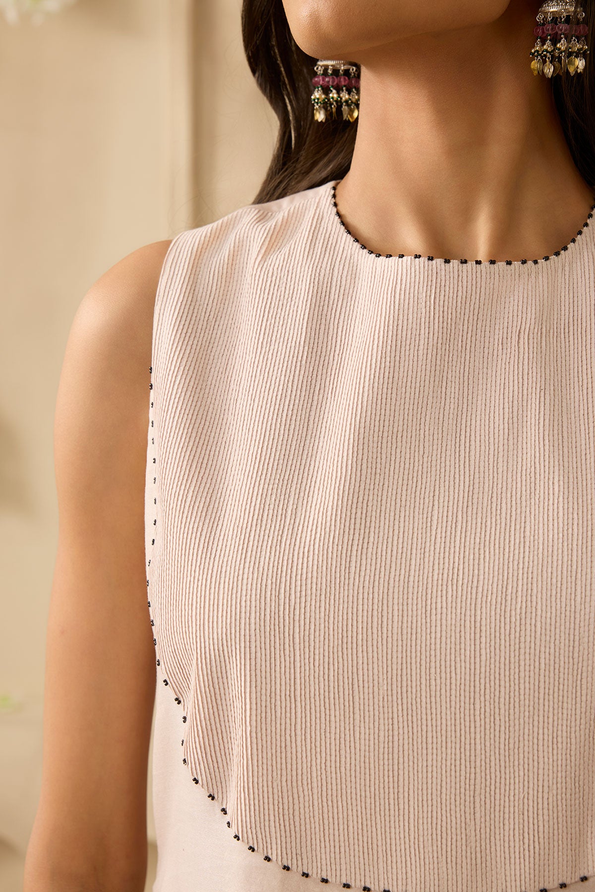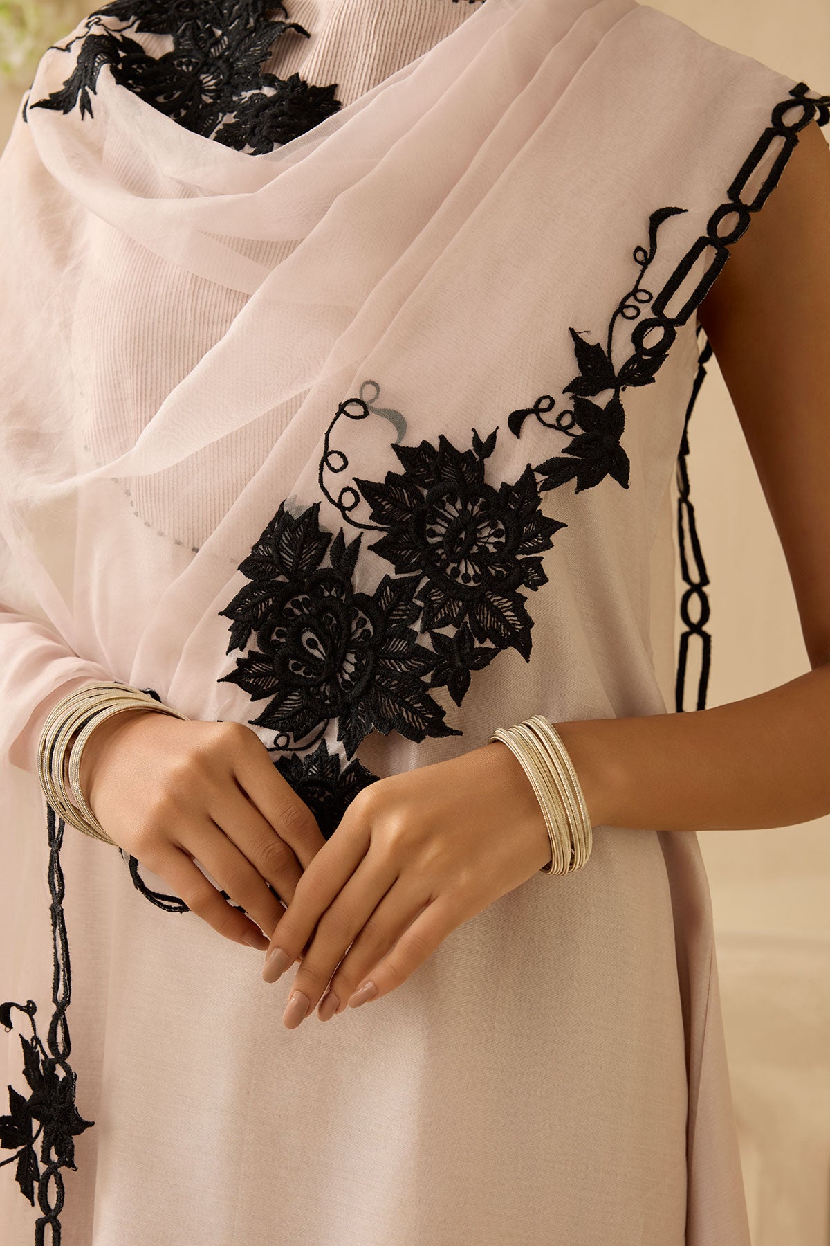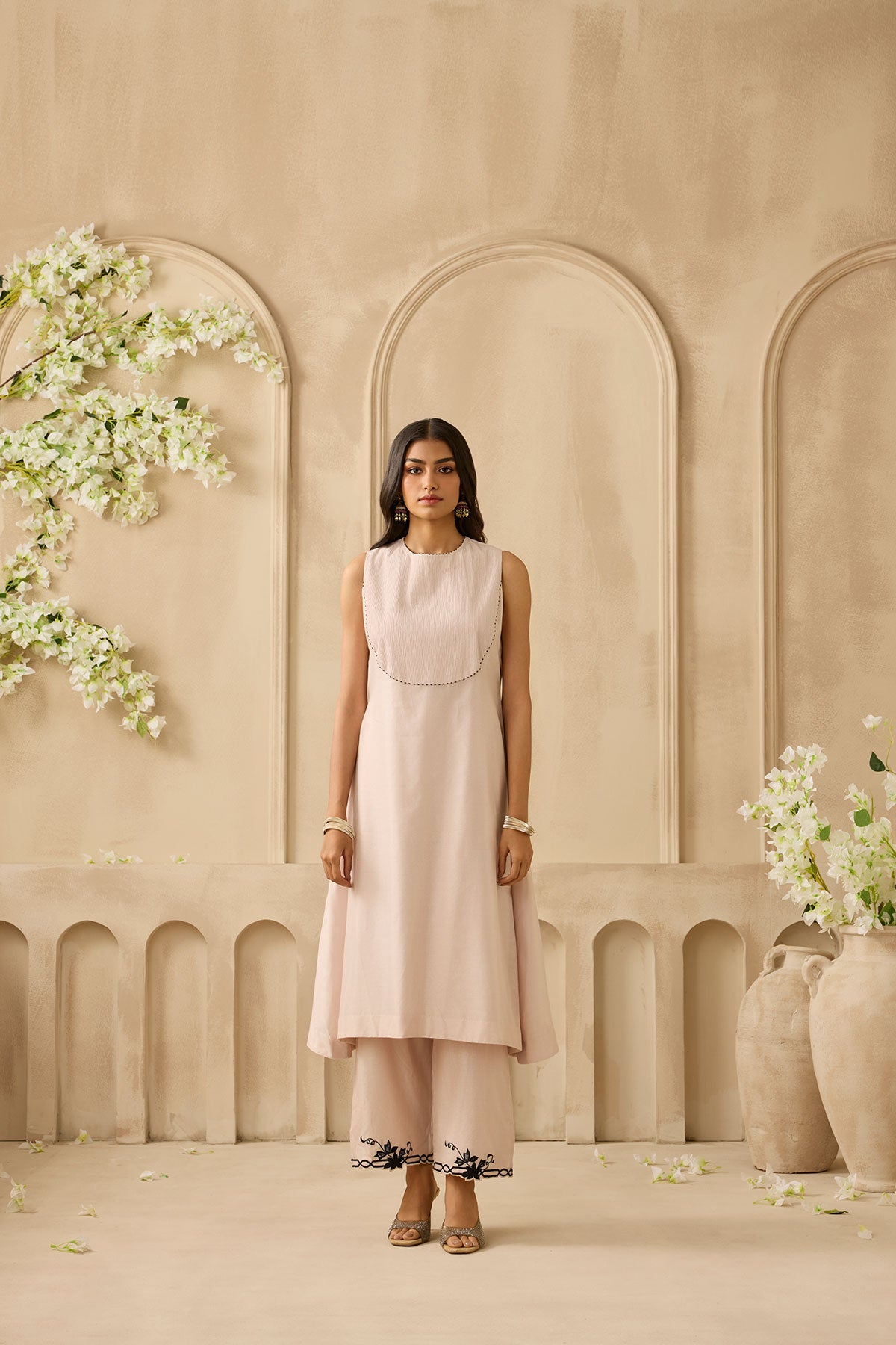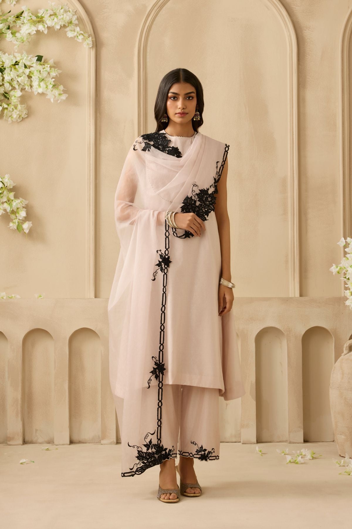 Perfect for balmy summer nights, this sleeveless silk chanderi set is a house favourite. The yoke of the kurta is highlighted with intricate narrow pin tucks while the bottoms are masterfully scalloped into geometric shapes. Complete the look with a sheer organza dupatta that comes with abstract placements of 3D floral patchwork.