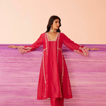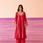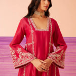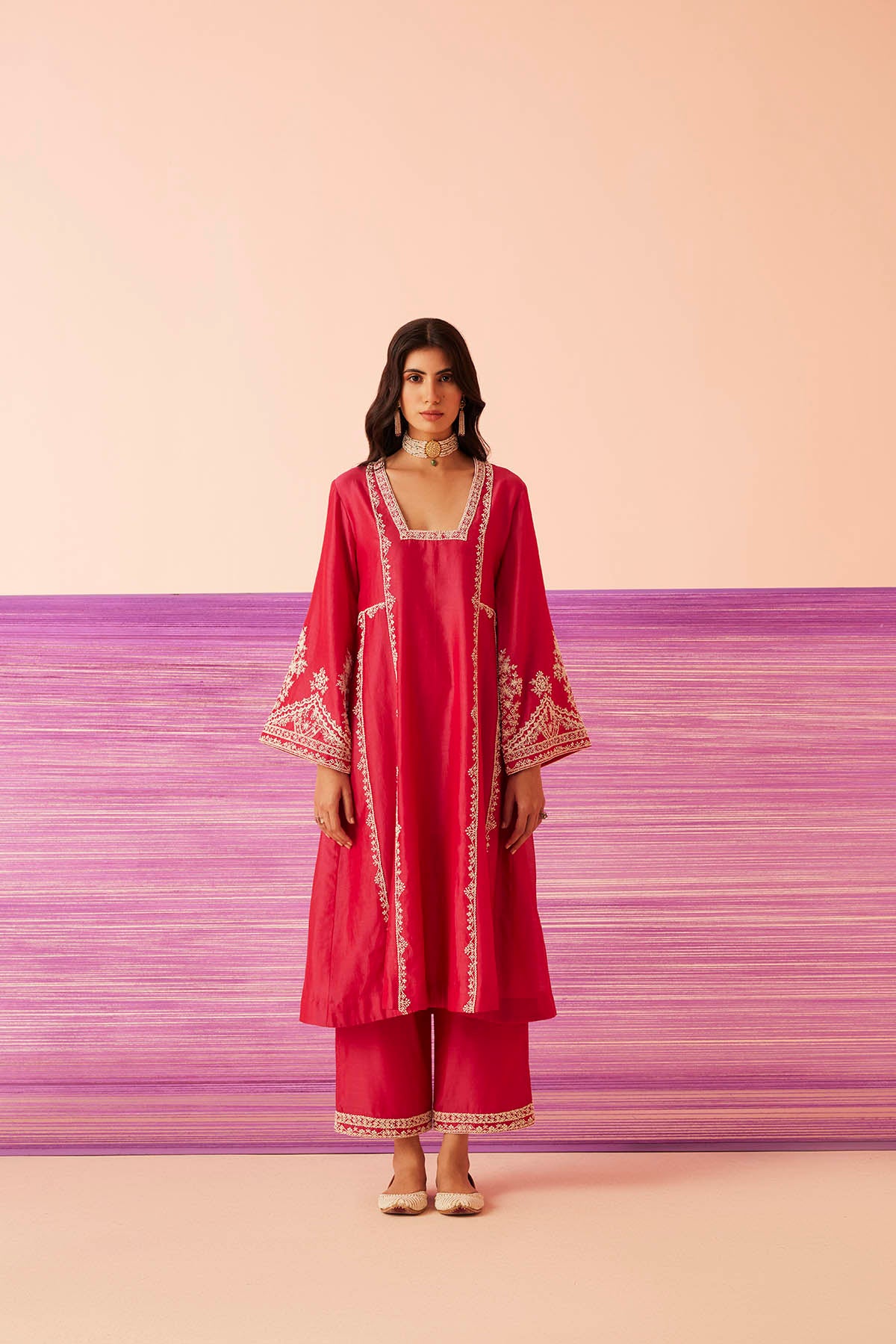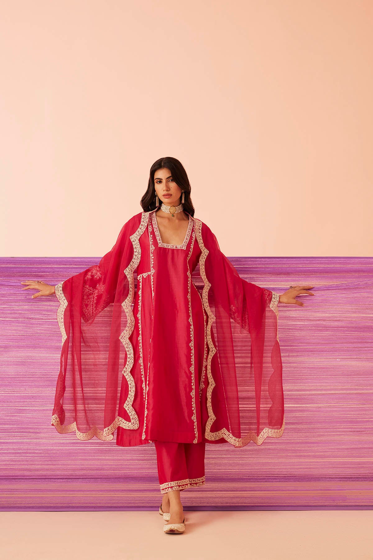 This crimson kurta set is fit for royalty. The intricate dori embroidery and pearl, bead, and sequin accents make it a true showstopper. Paired with a minimal embroidered palazzo and a sheer organza dupatta with embroidered scalloped edges, this look is all about that old world charm.