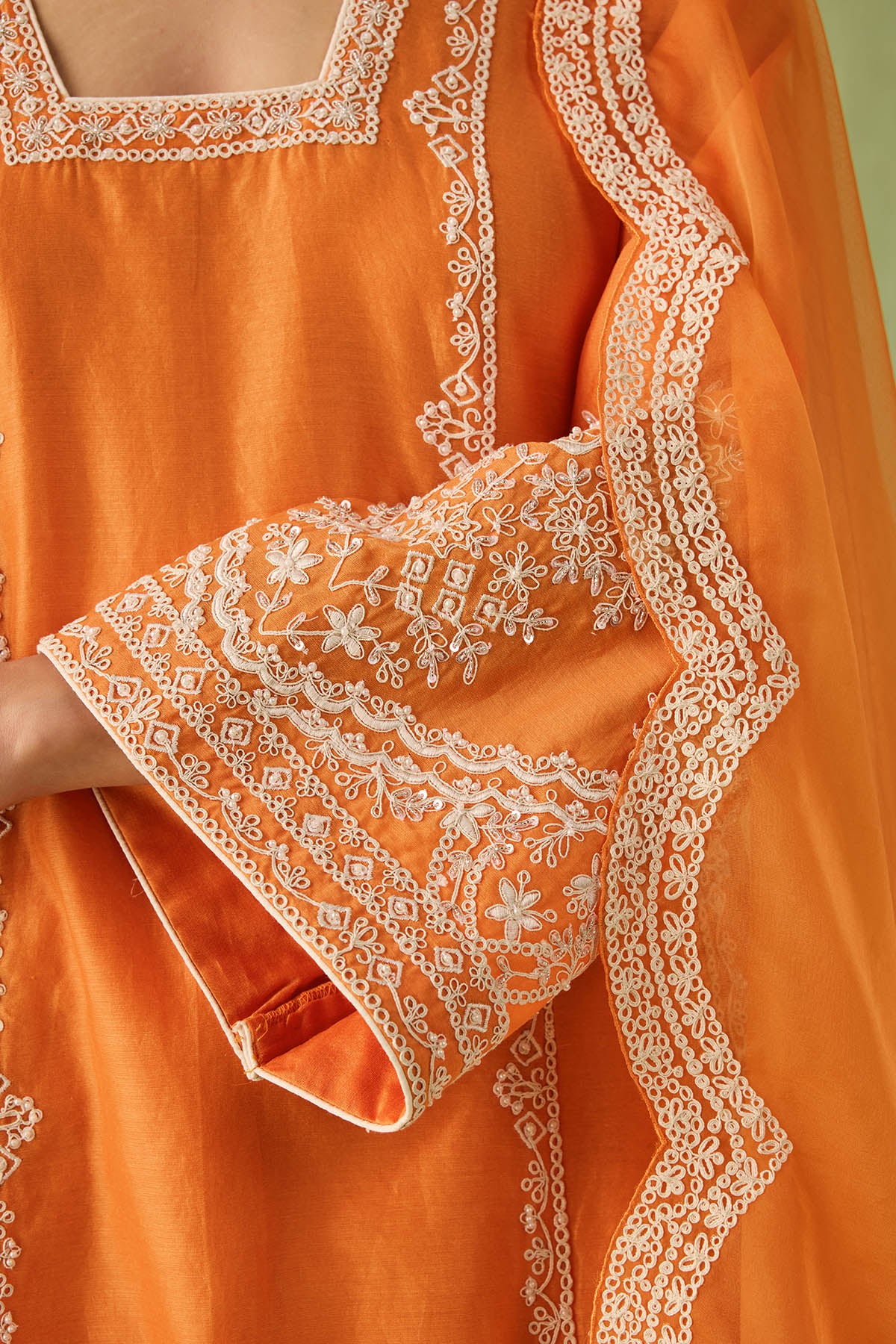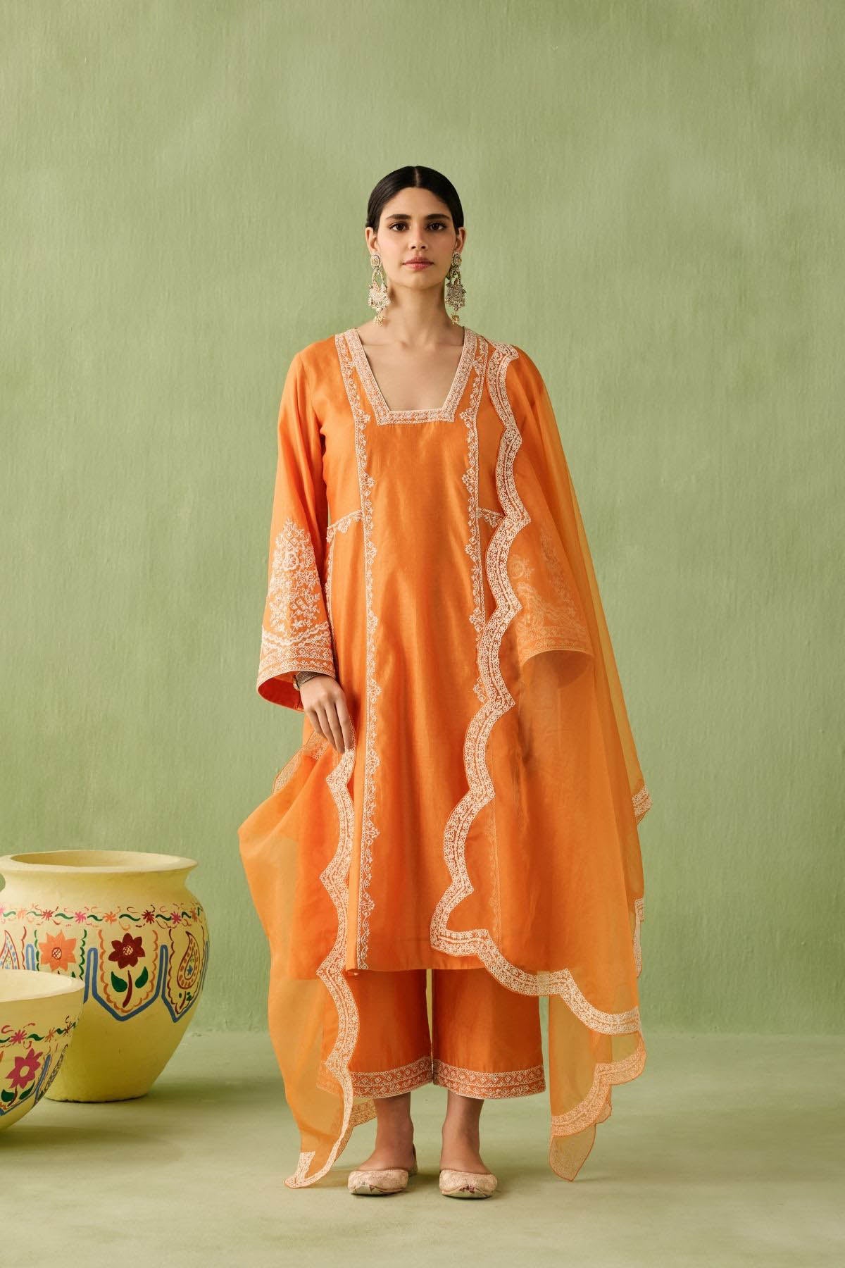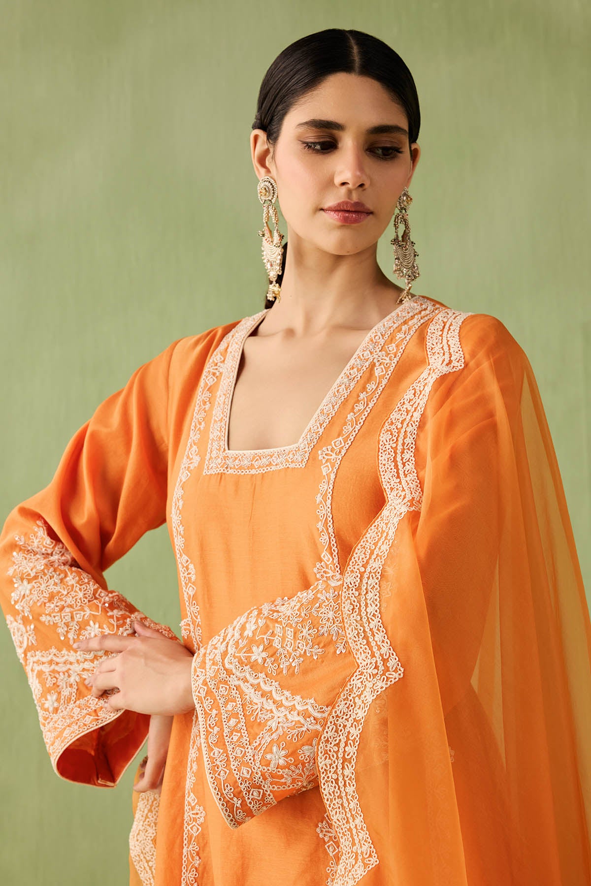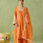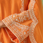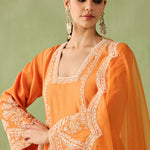 This orange kurta set is your go to morning to evening look. The intricate dori embroidery and pearl, bead, and sequin accents make it a true showstopper. Paired with a minimal embroidered palazzo and a sheer organza dupatta with embroidered scalloped edges, this look is all about that old world charm.