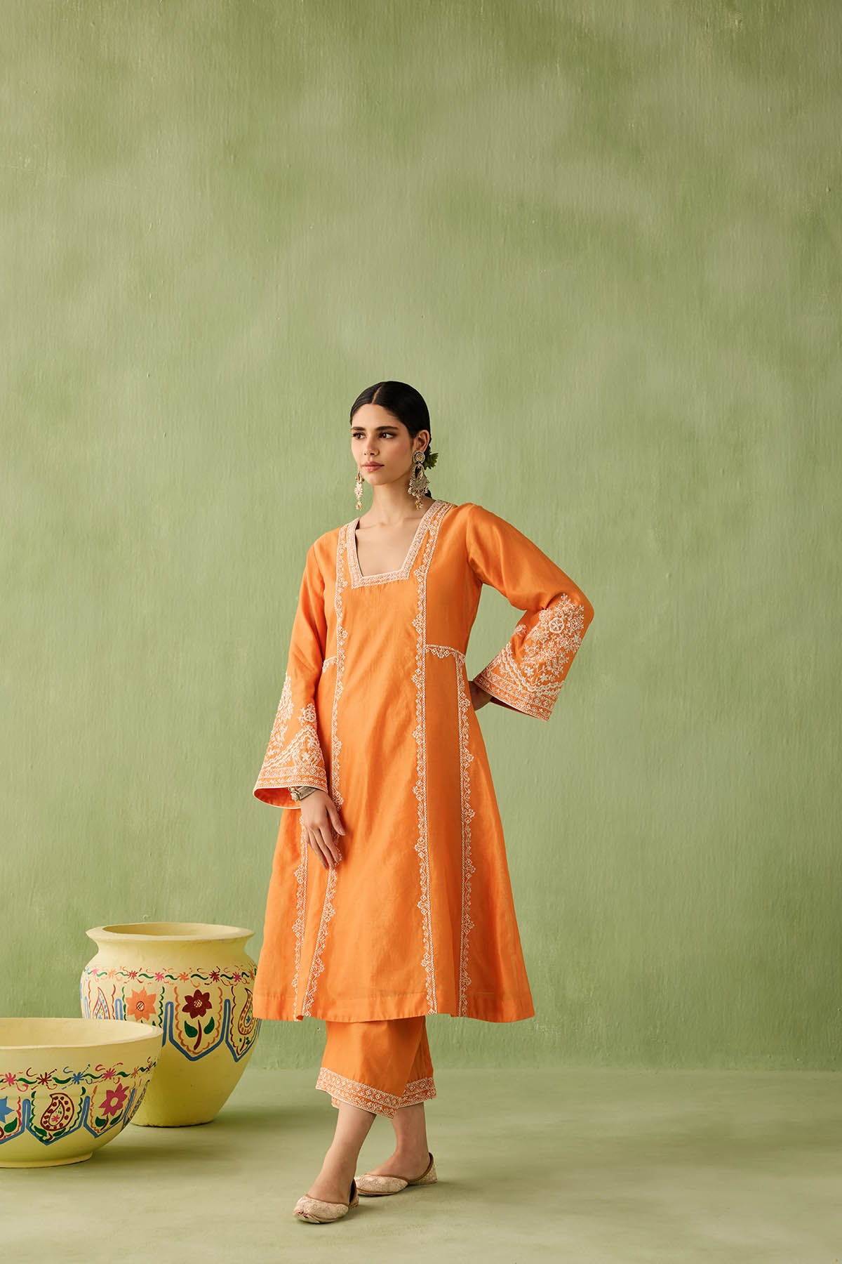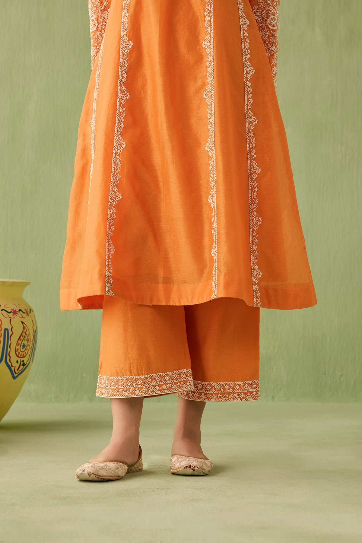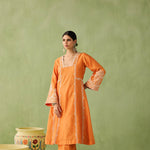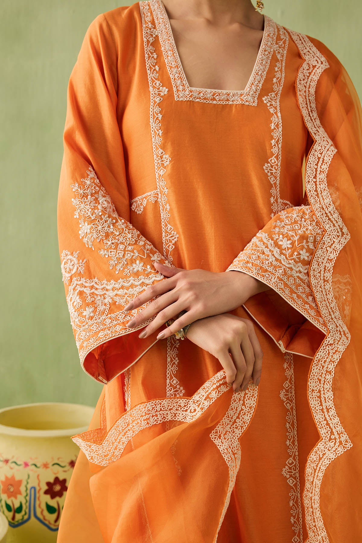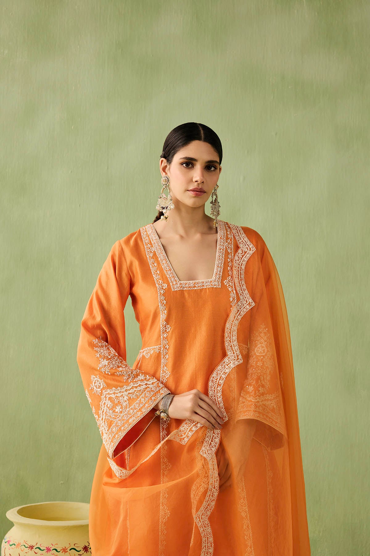 This orange kurta set is your go to morning to evening look. The intricate dori embroidery and pearl, bead, and sequin accents make it a true showstopper. Paired with a minimal embroidered palazzo and a sheer organza dupatta with embroidered scalloped edges, this look is all about that old world charm.