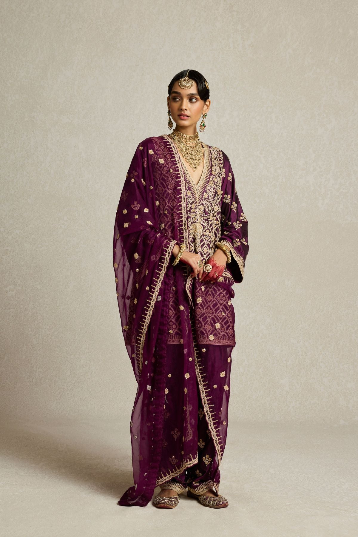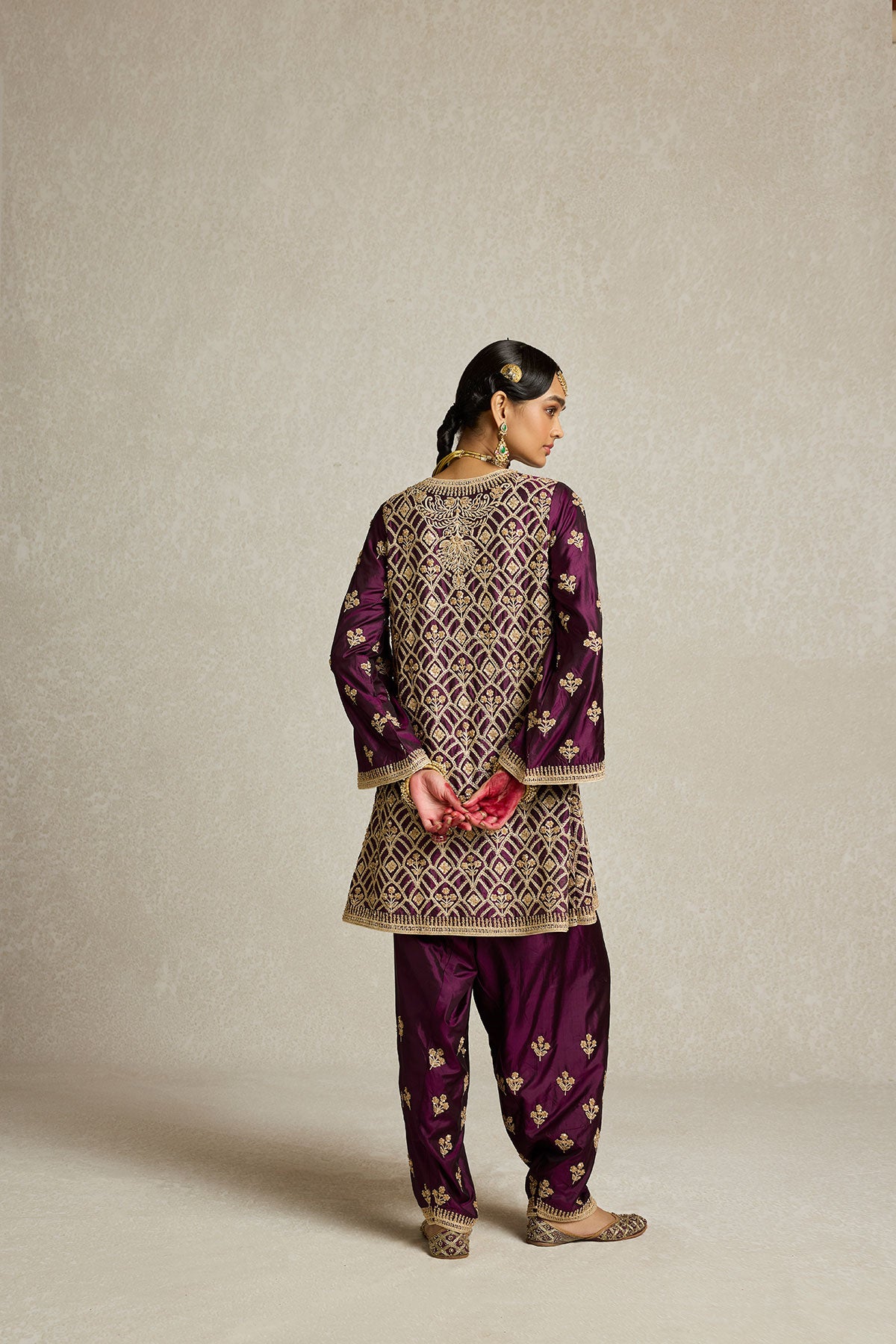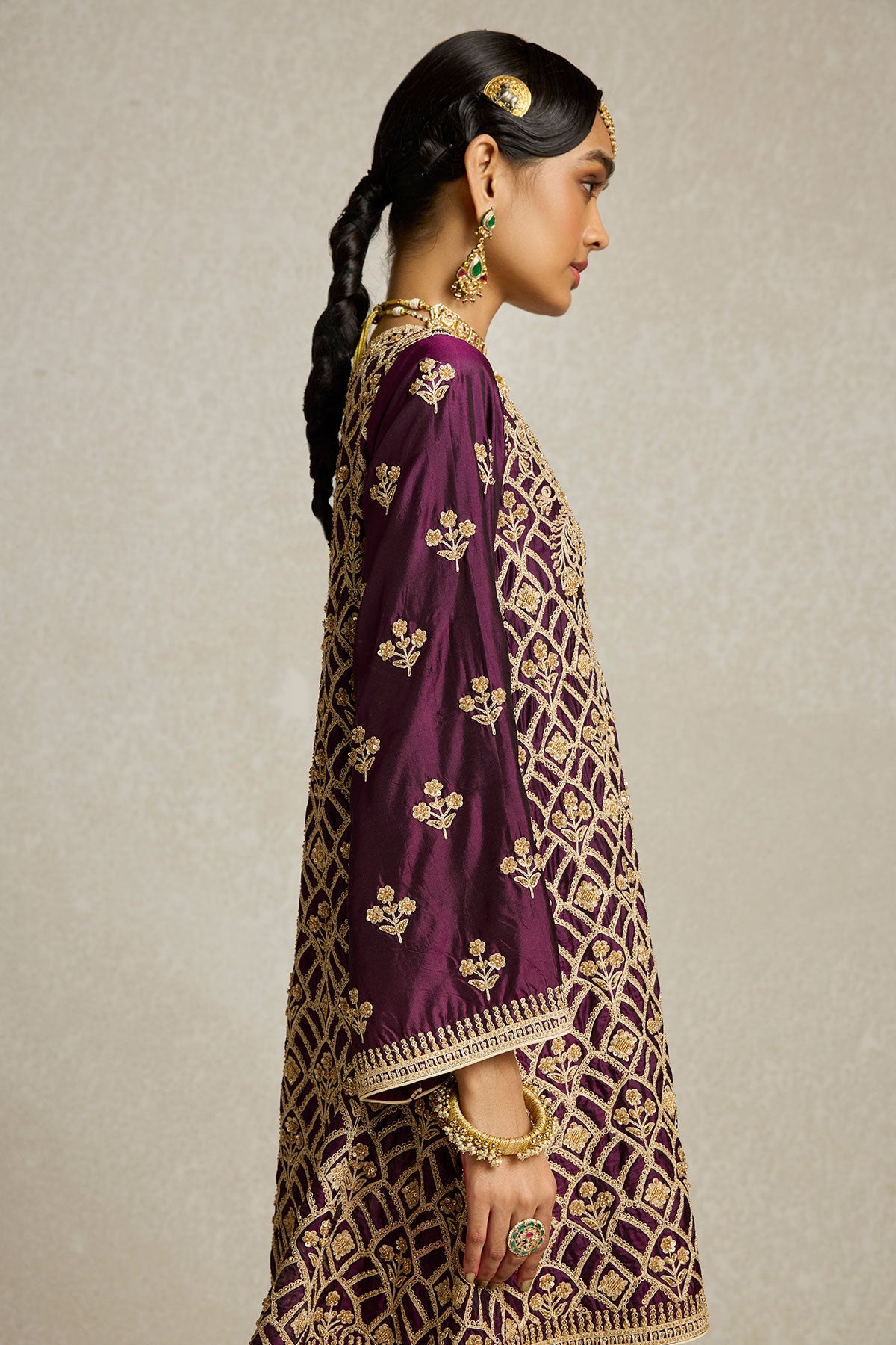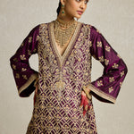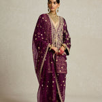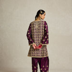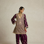This short kurta and salwar set in wine captures the essence of 1980s Punjab with its lively and rich embroidery. Kiran dori, sitara, and beadwork embellish the surface of the kurta and salwar, creating a vibrant yet traditional look that’s perfect for the spirited woman who lights up every celebration.