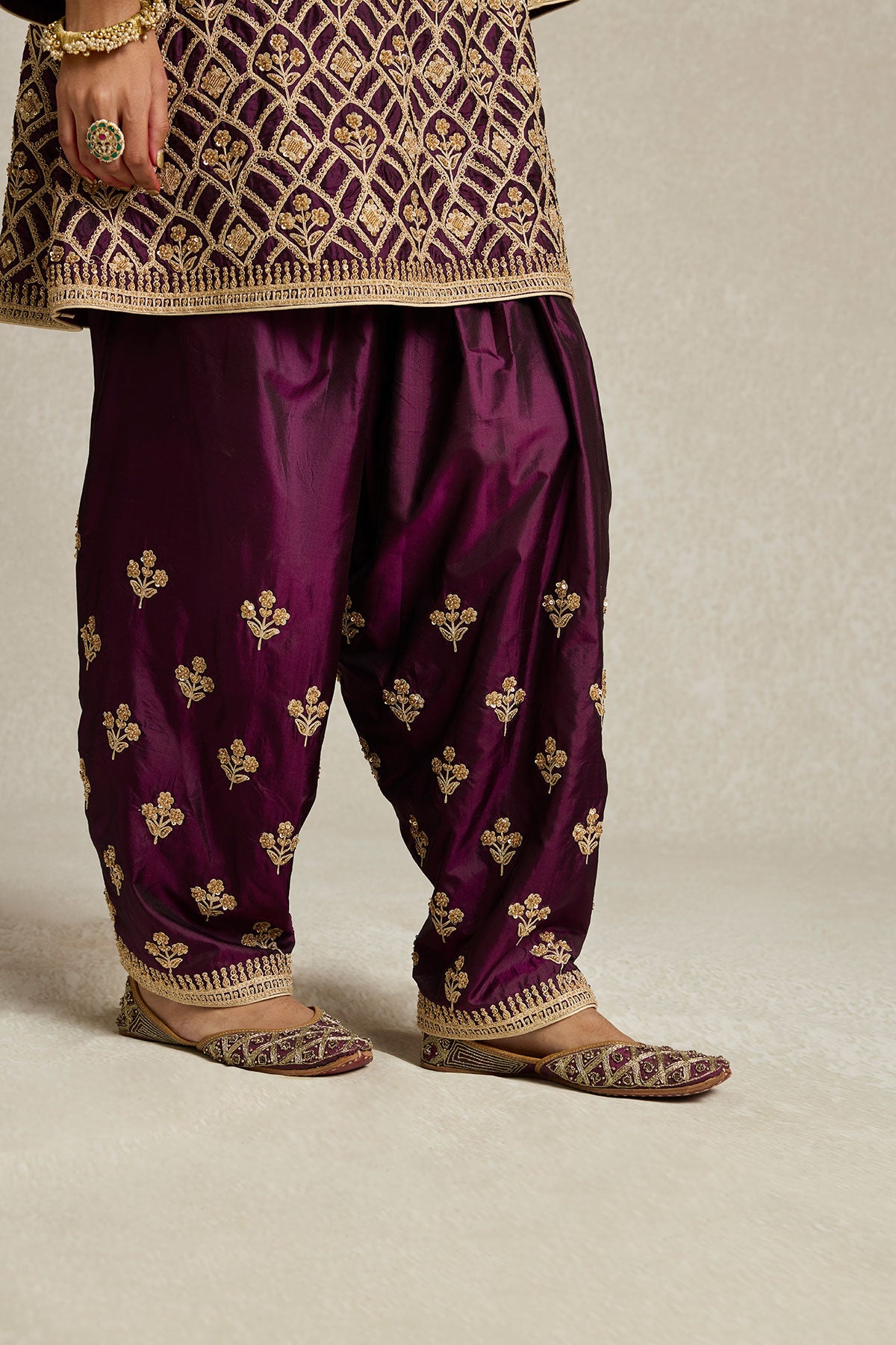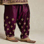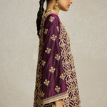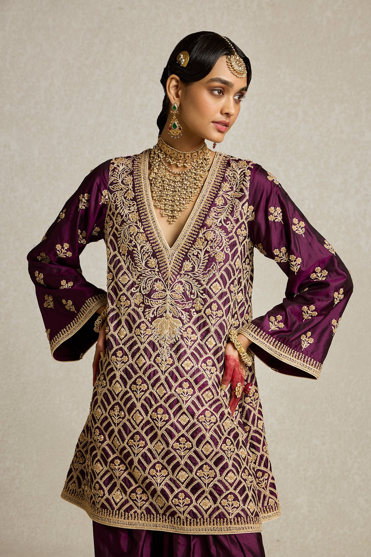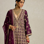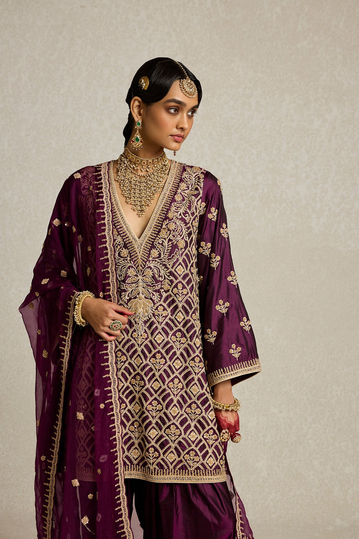 This short kurta and salwar set in wine captures the essence of 1980s Punjab with its lively and rich embroidery. Kiran dori, sitara, and beadwork embellish the surface of the kurta and salwar, creating a vibrant yet traditional look that’s perfect for the spirited woman who lights up every celebration.