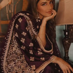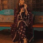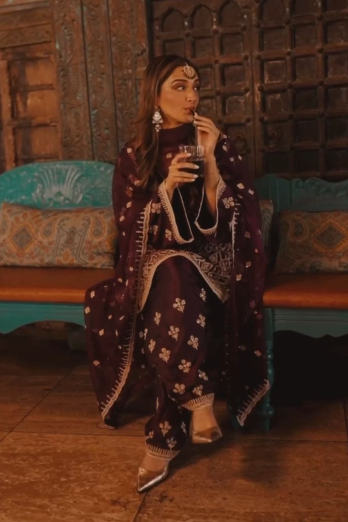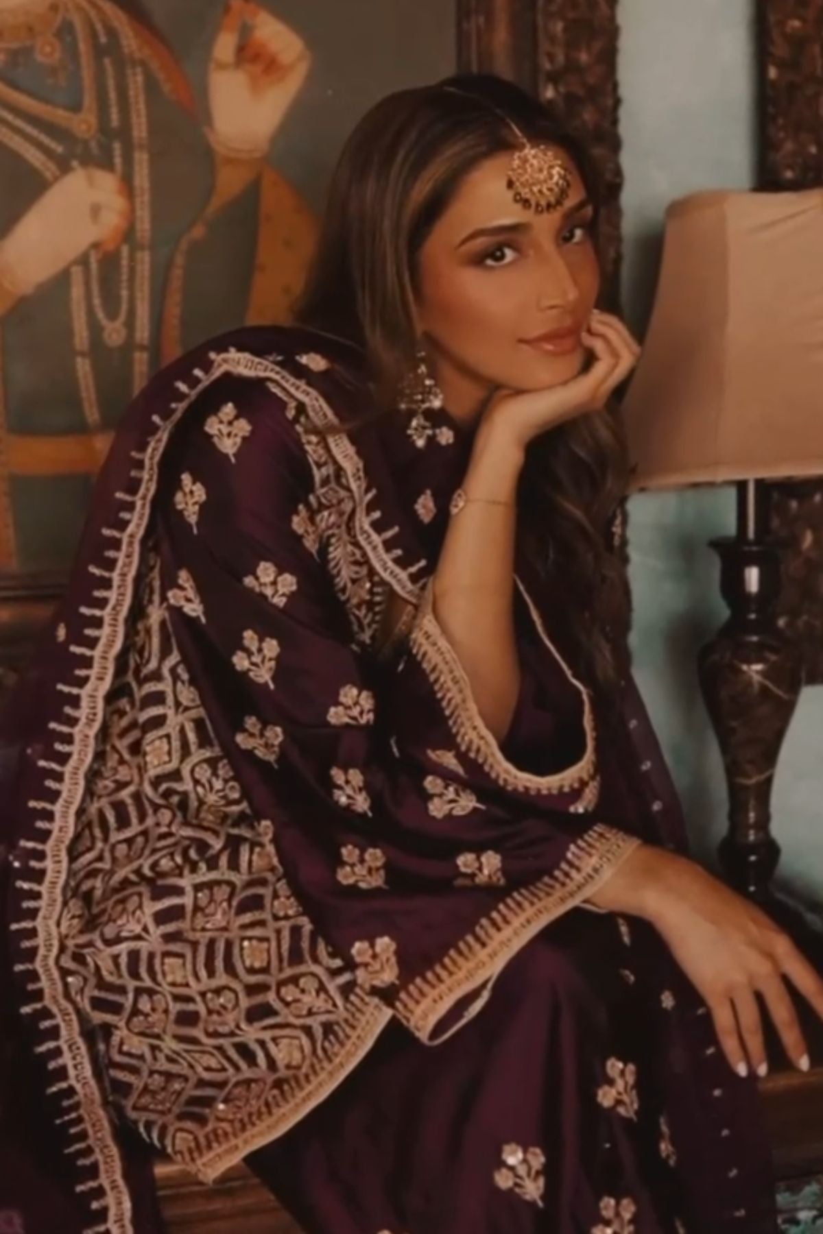 This short kurta and salwar set in wine captures the essence of 1980s Punjab with its lively and rich embroidery. Kiran dori, sitara, and beadwork embellish the surface of the kurta and salwar, creating a vibrant yet traditional look that’s perfect for the spirited woman who lights up every celebration.