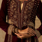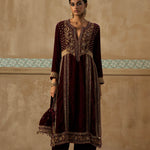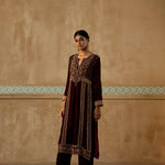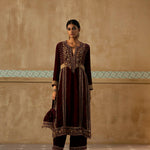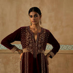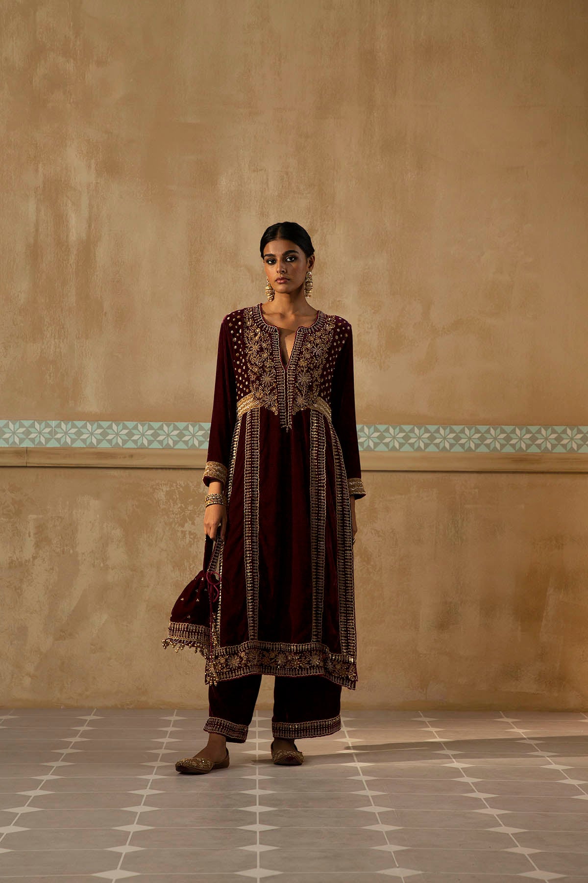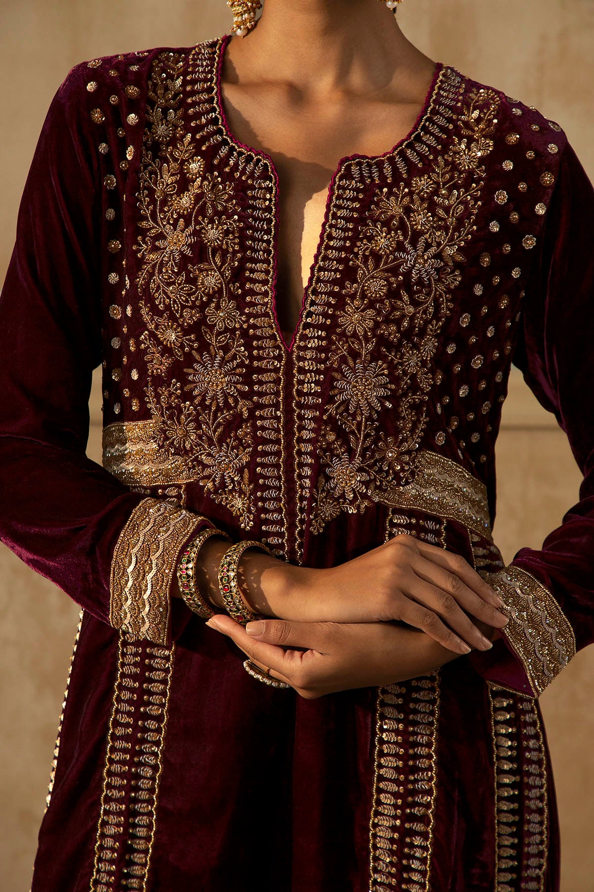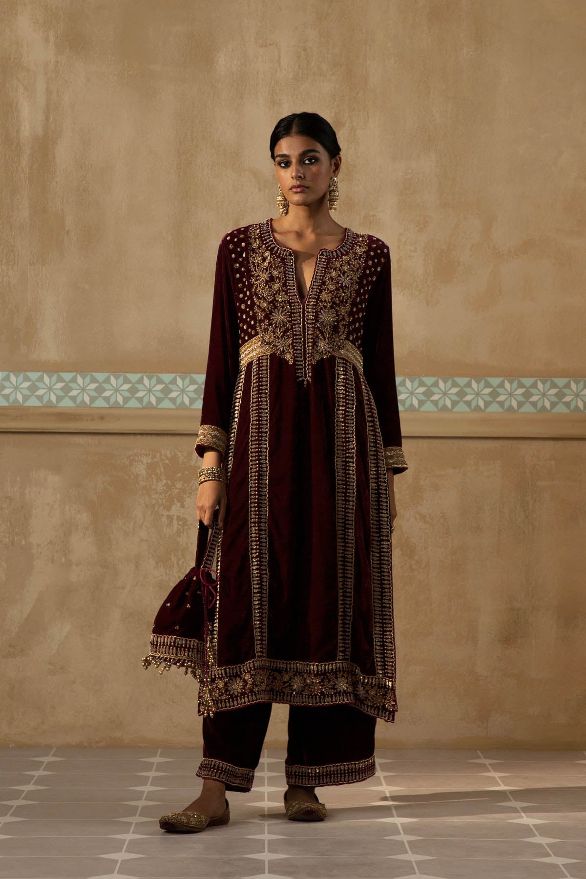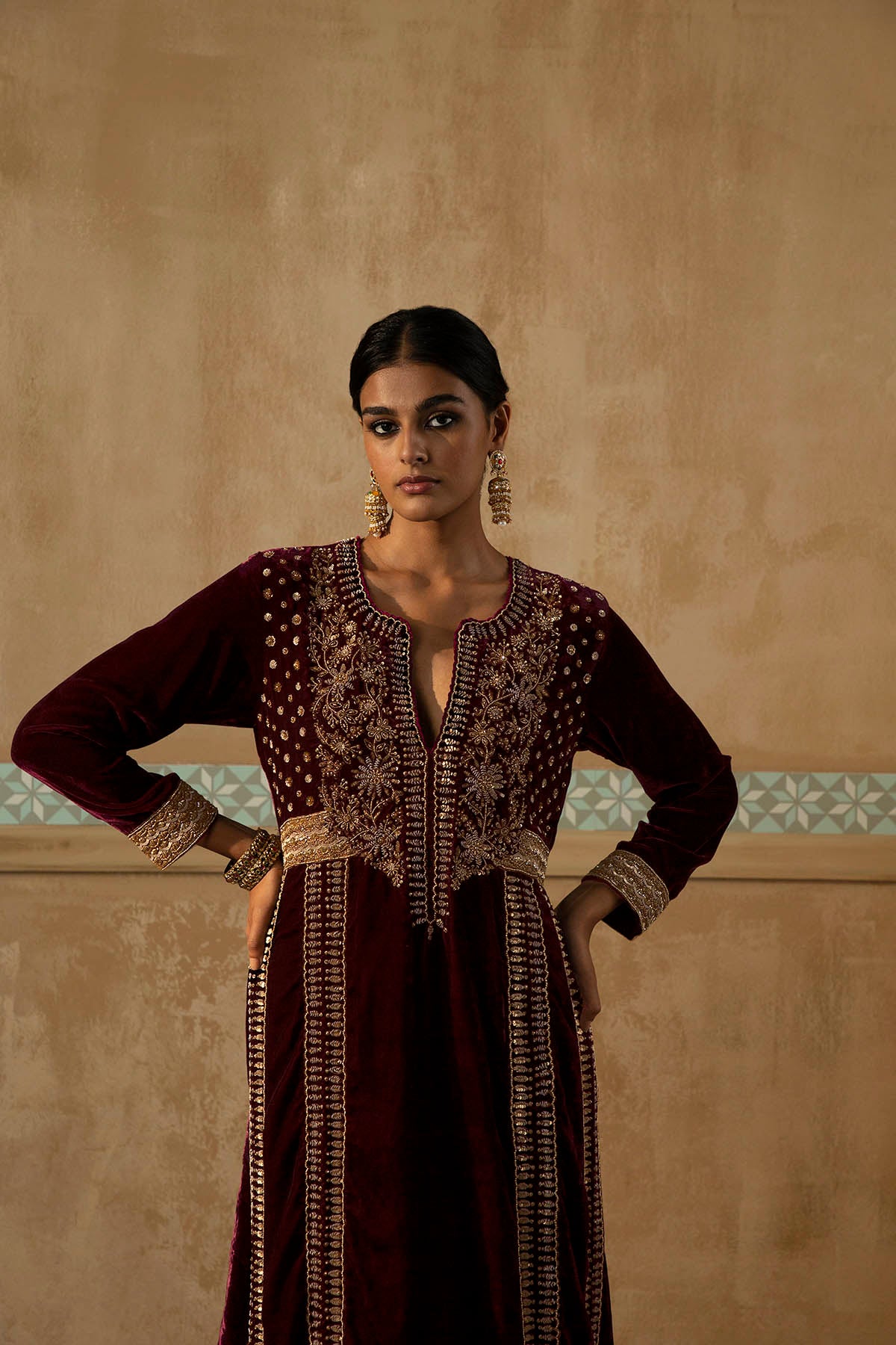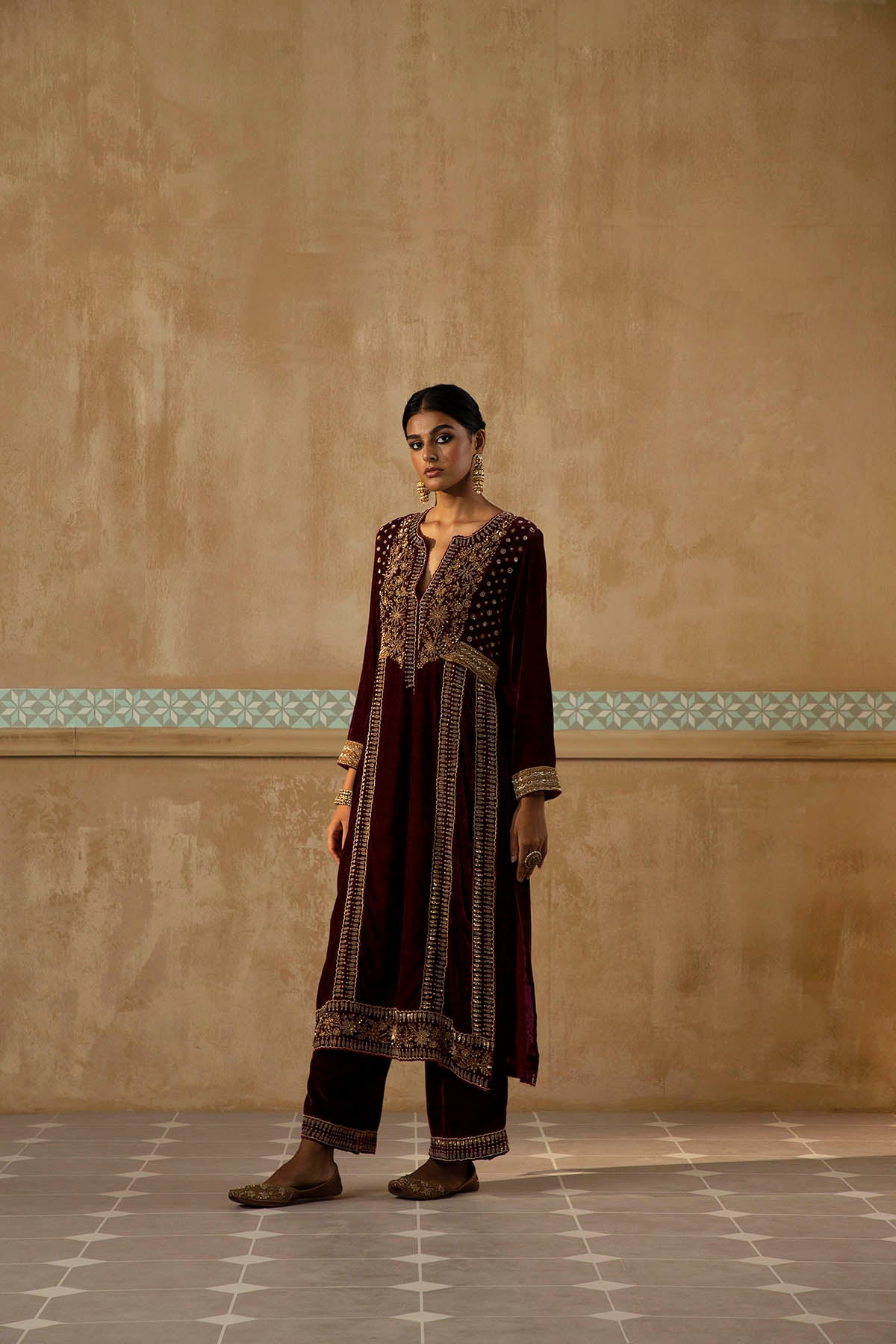 Borrowing from the royal robes of Mughal queens, this long mulberry kurta set is embroidered to perfection. The surface of the kurta is accentuated with aari and zardozi thread, sitara, bead and cutdana work while the relaxed cut makes it ideal for a festive dinner. A lesson in minimum input, maximum output.