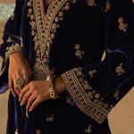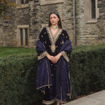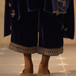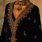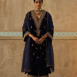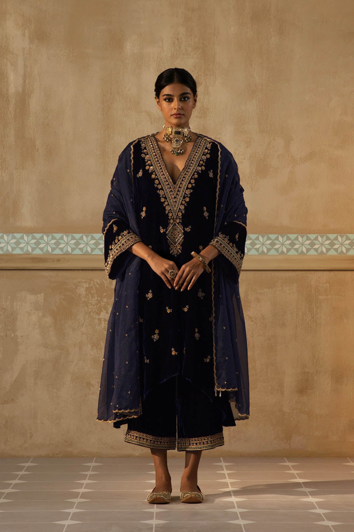 The perfect mix of decadence and simplicity — this navy kurta and palazzo set is embroidered intricately by hand with aari threadwork as the base and further highlighted with zari, bead and sitara work. The plunging Mughal neckline is juxtaposed with an intricately embroidered and delicately scalloped organza dupatta. Here is an ensemble that promises everasting elegance.
