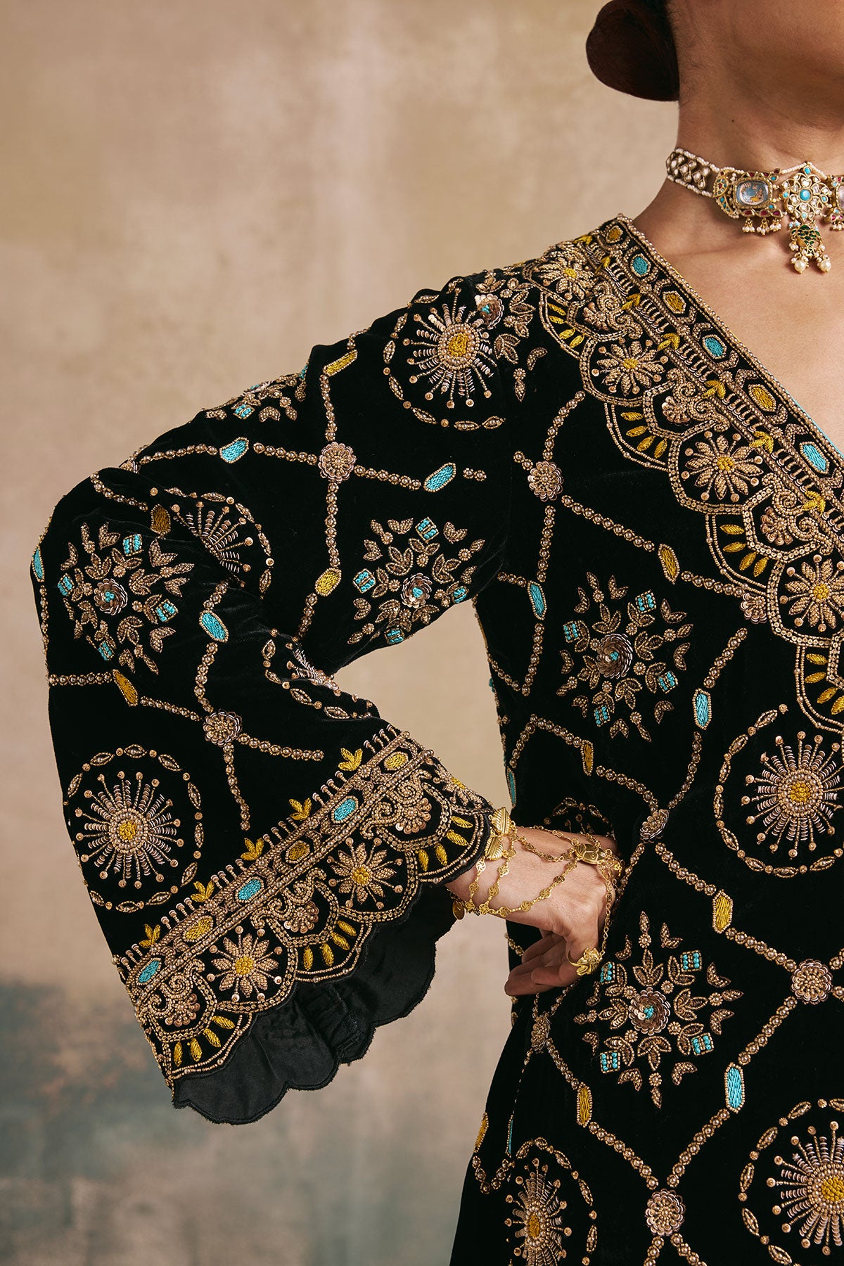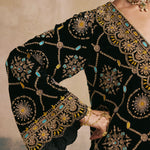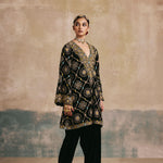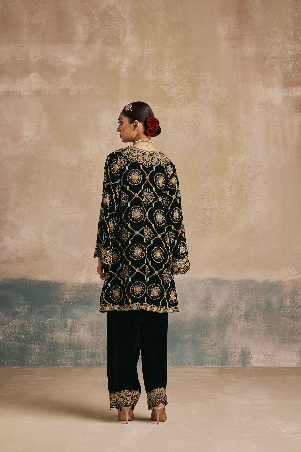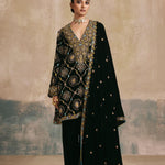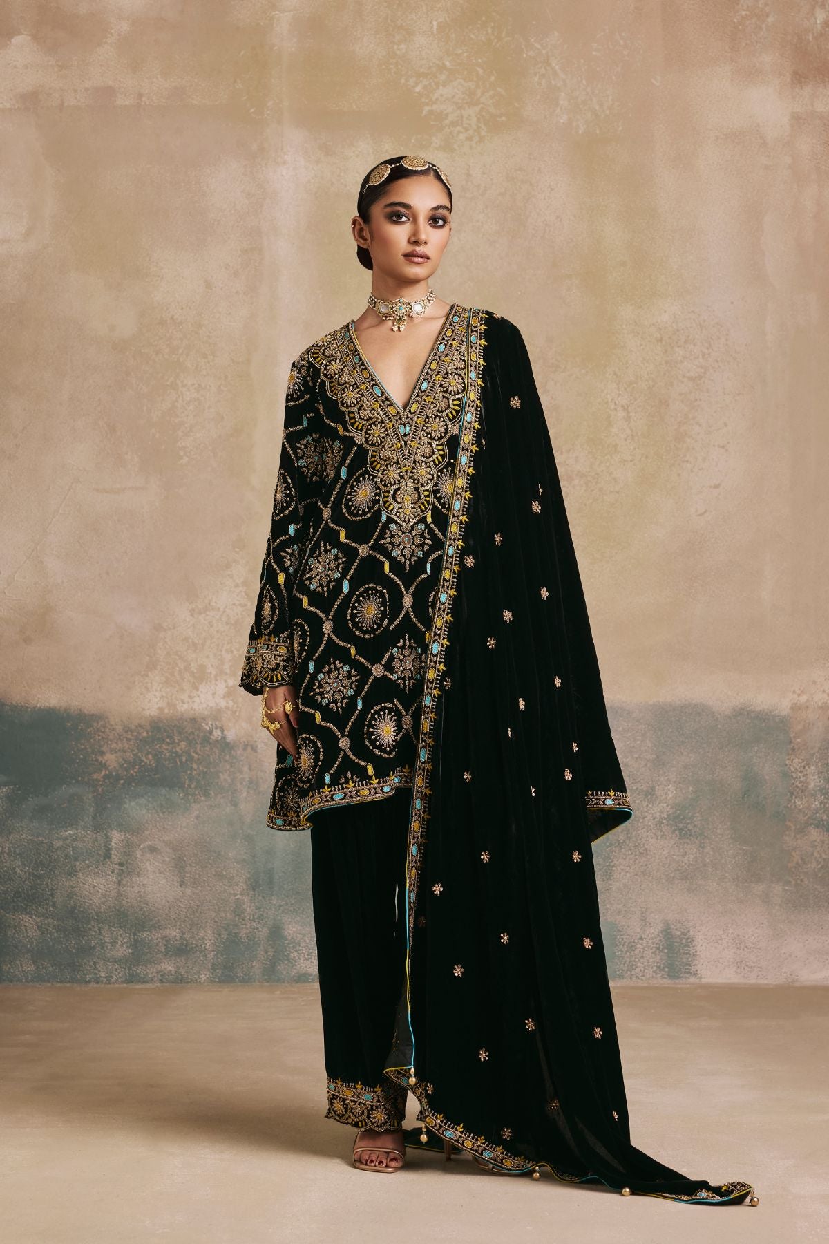 The Nilofer Kurta Set combines Mughal-inspired embroidery with a new-age silhouette—a short kurta and lounge pants that exude relaxed luxury. Finished with a velvet dupatta, it’s a seamless blend of tradition and modernity.