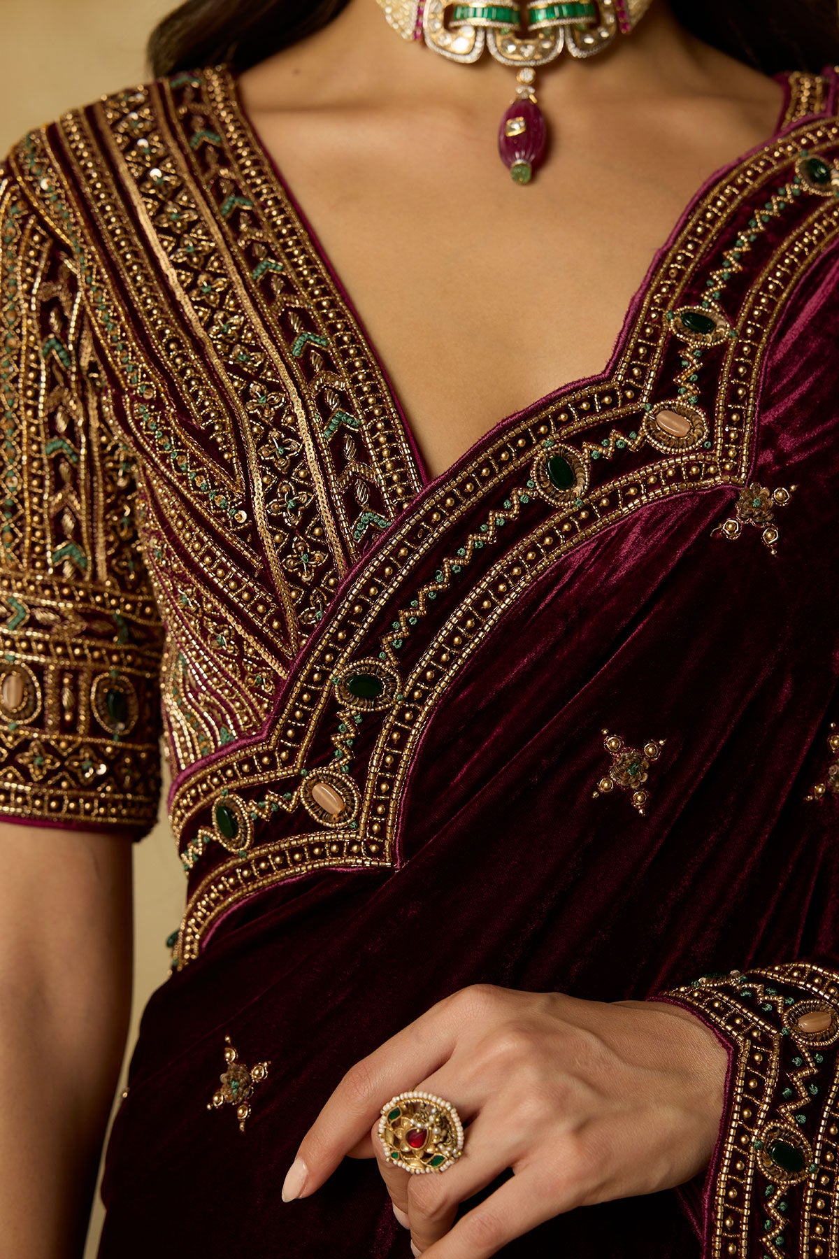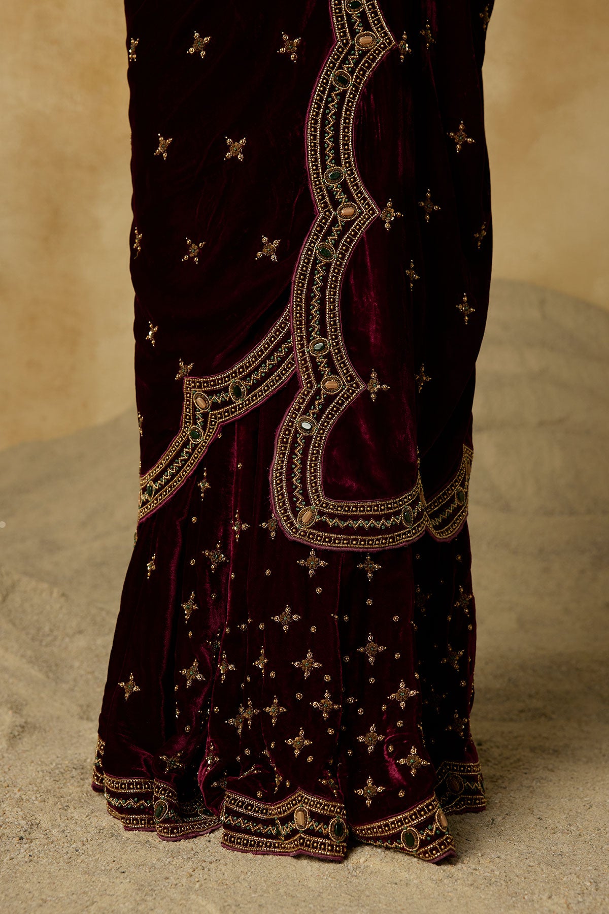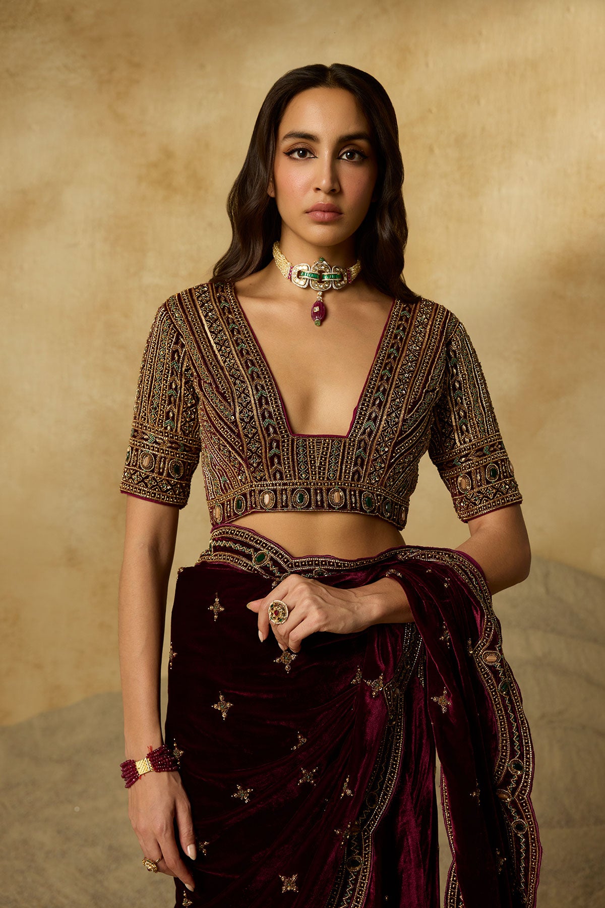 A pre-stitched velvet saree crafted to last generations. Its scalloped drape flows effortlessly, paired with an embellished zardozi blouse accented with contrasting gemstones—making it a timeless choice for intimate weddings and celebratory soirées.