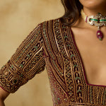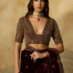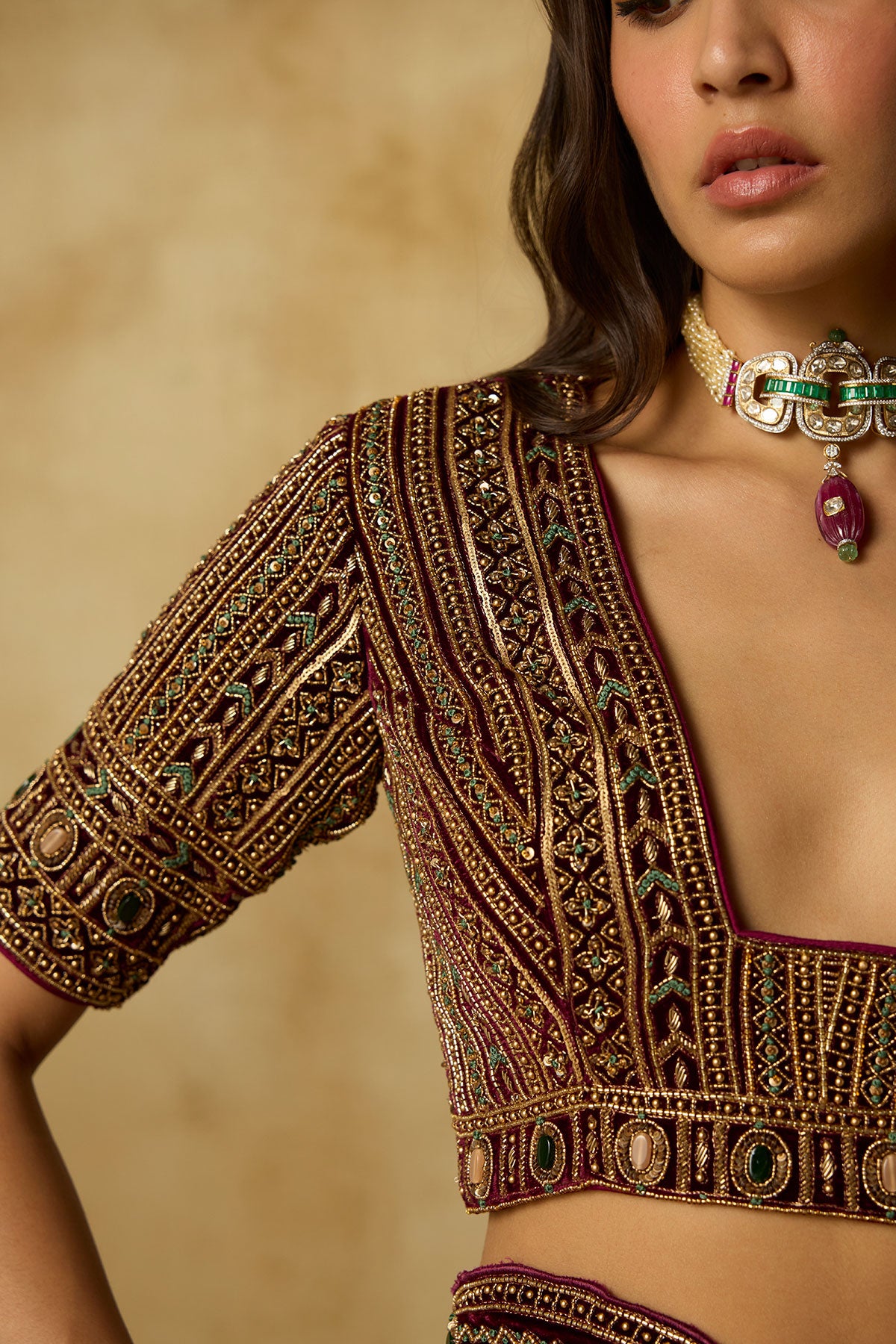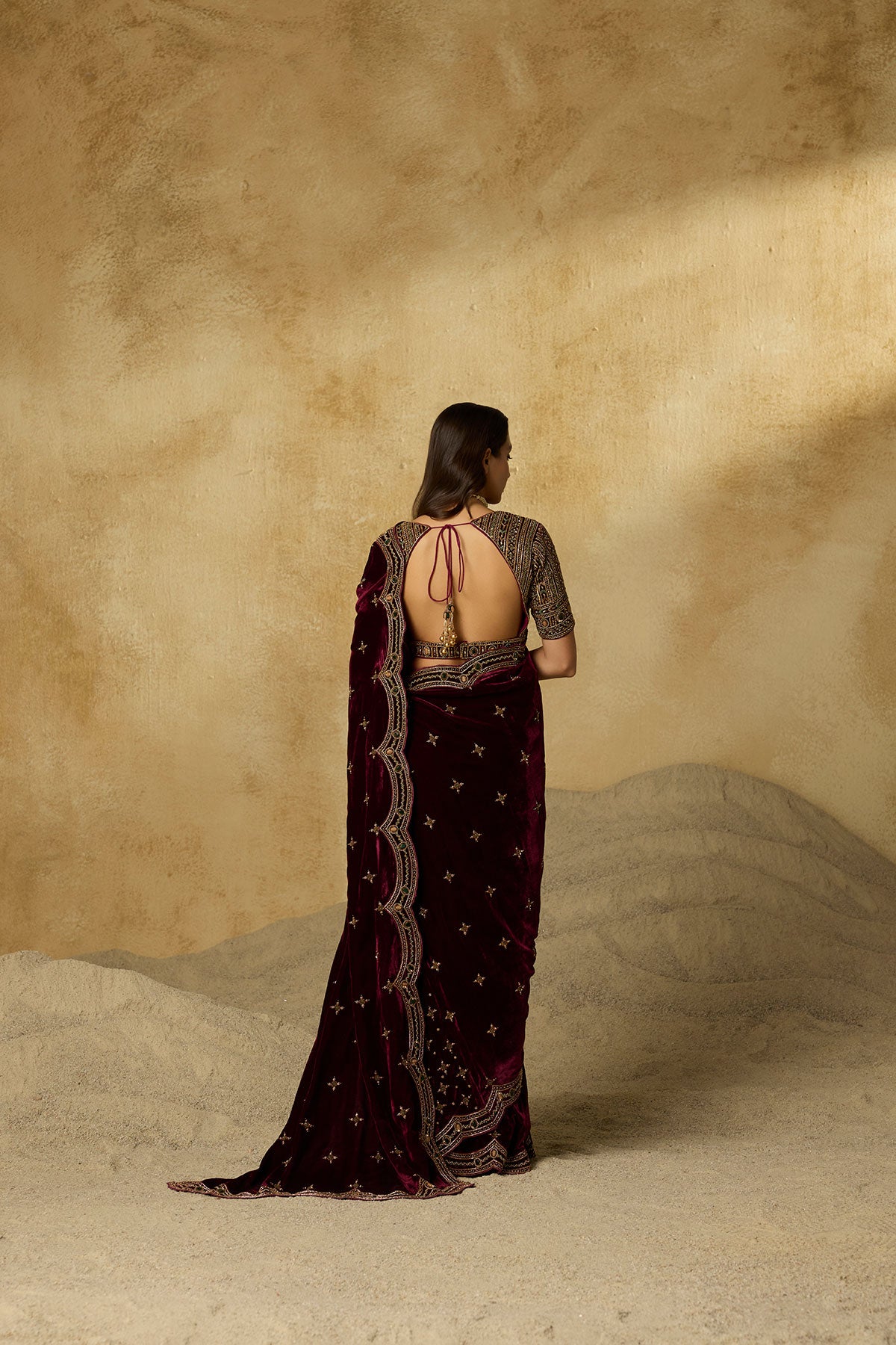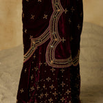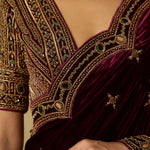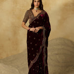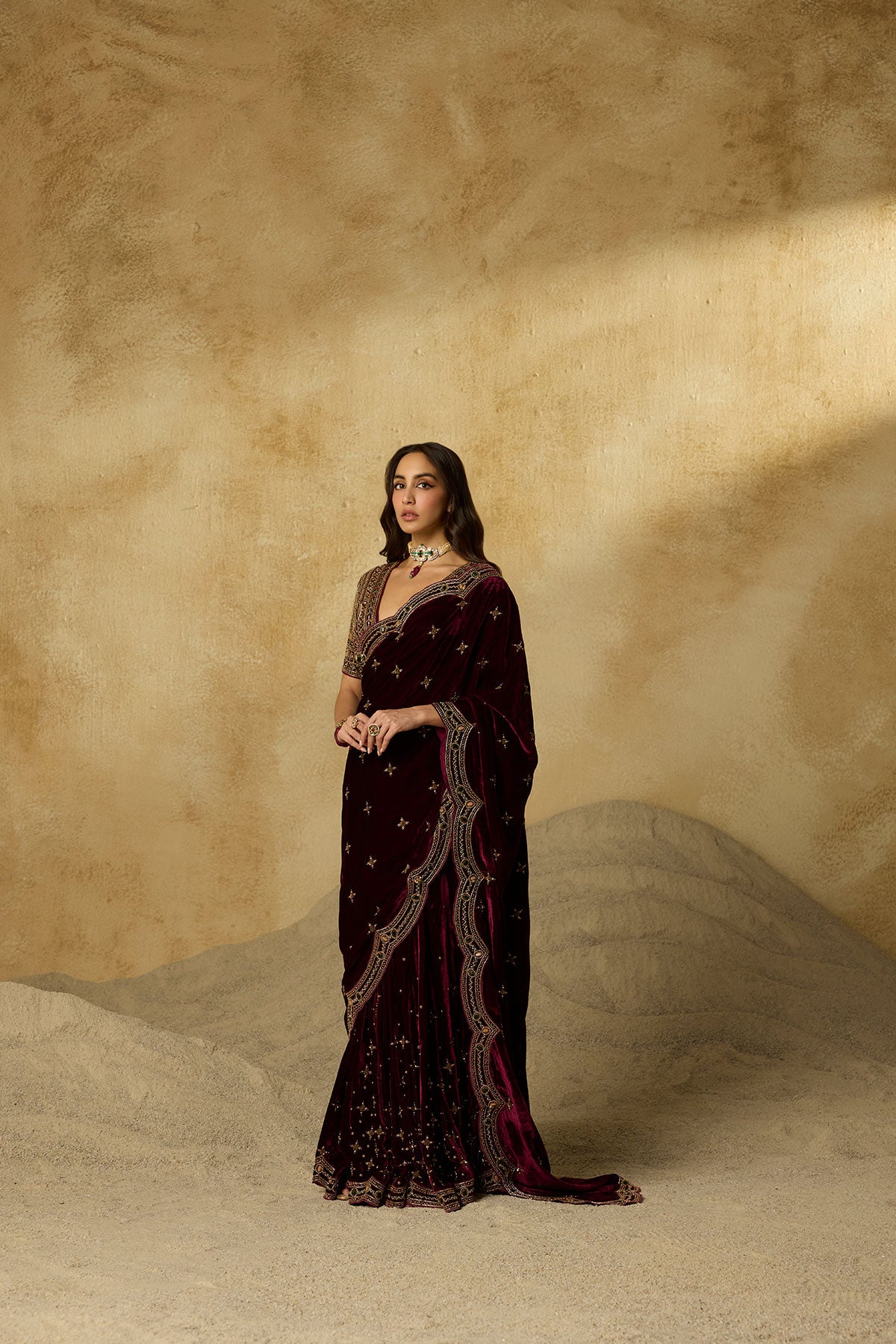 A pre-stitched velvet saree crafted to last generations. Its scalloped drape flows effortlessly, paired with an embellished zardozi blouse accented with contrasting gemstones—making it a timeless choice for intimate weddings and celebratory soirées.