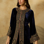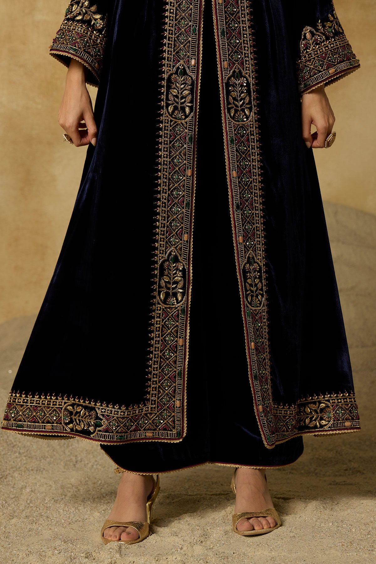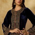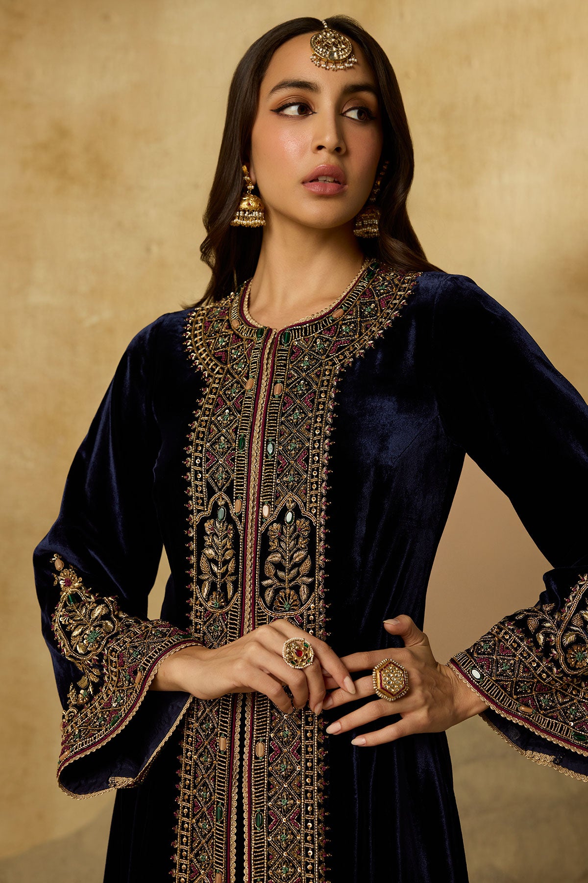 Crafted in navy blue silk velvet, this ankle length Anarkali is adorned with antique gold zardozi and aari embroidery and gemstone accents. Styled without a dupatta, it carries a rooted yet contemporary spirit—an heirloom-worthy trousseau piece for evenings steeped in tradition.