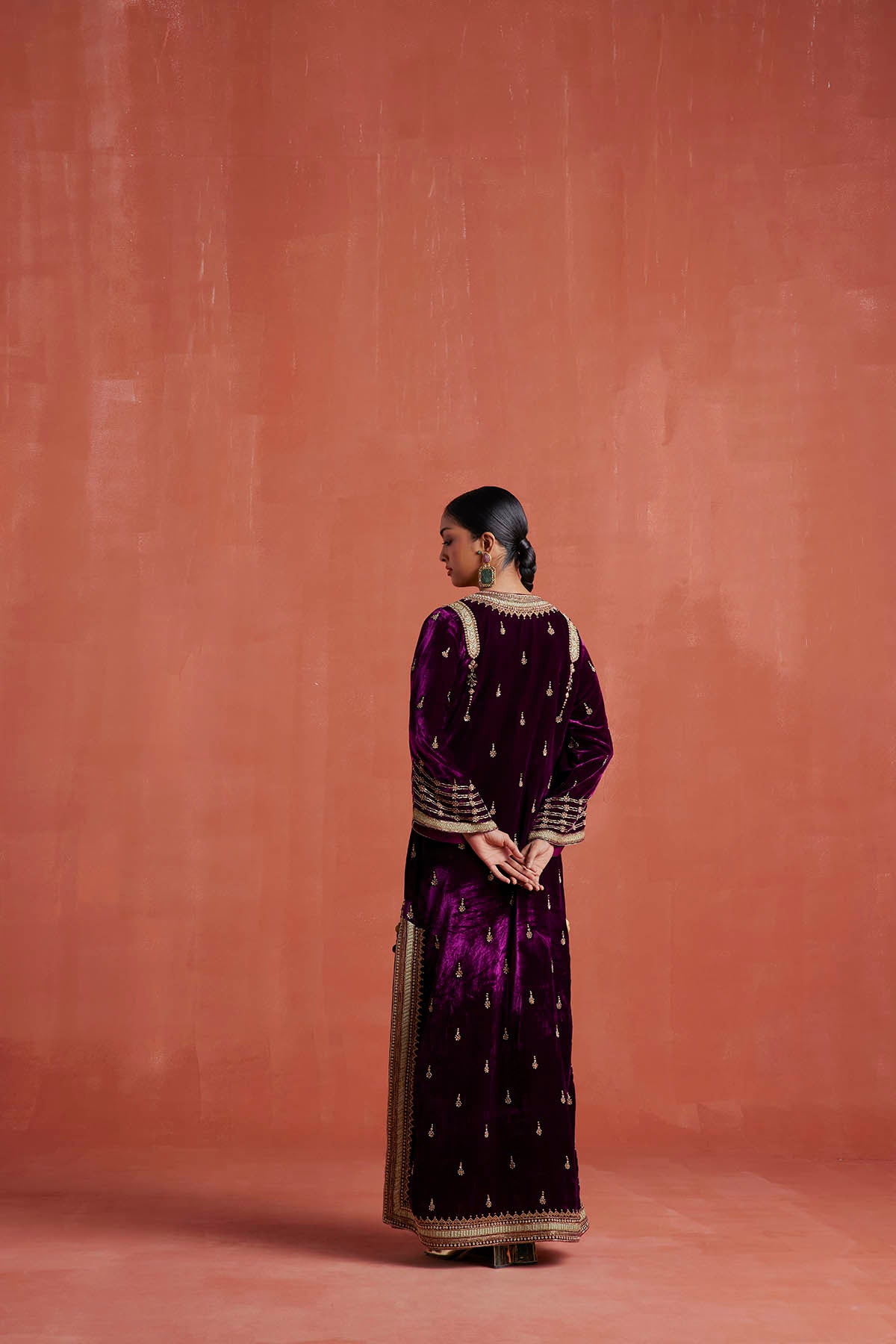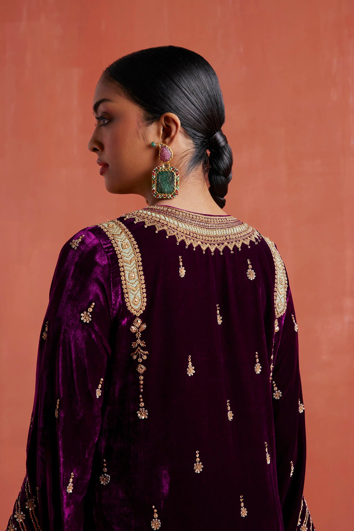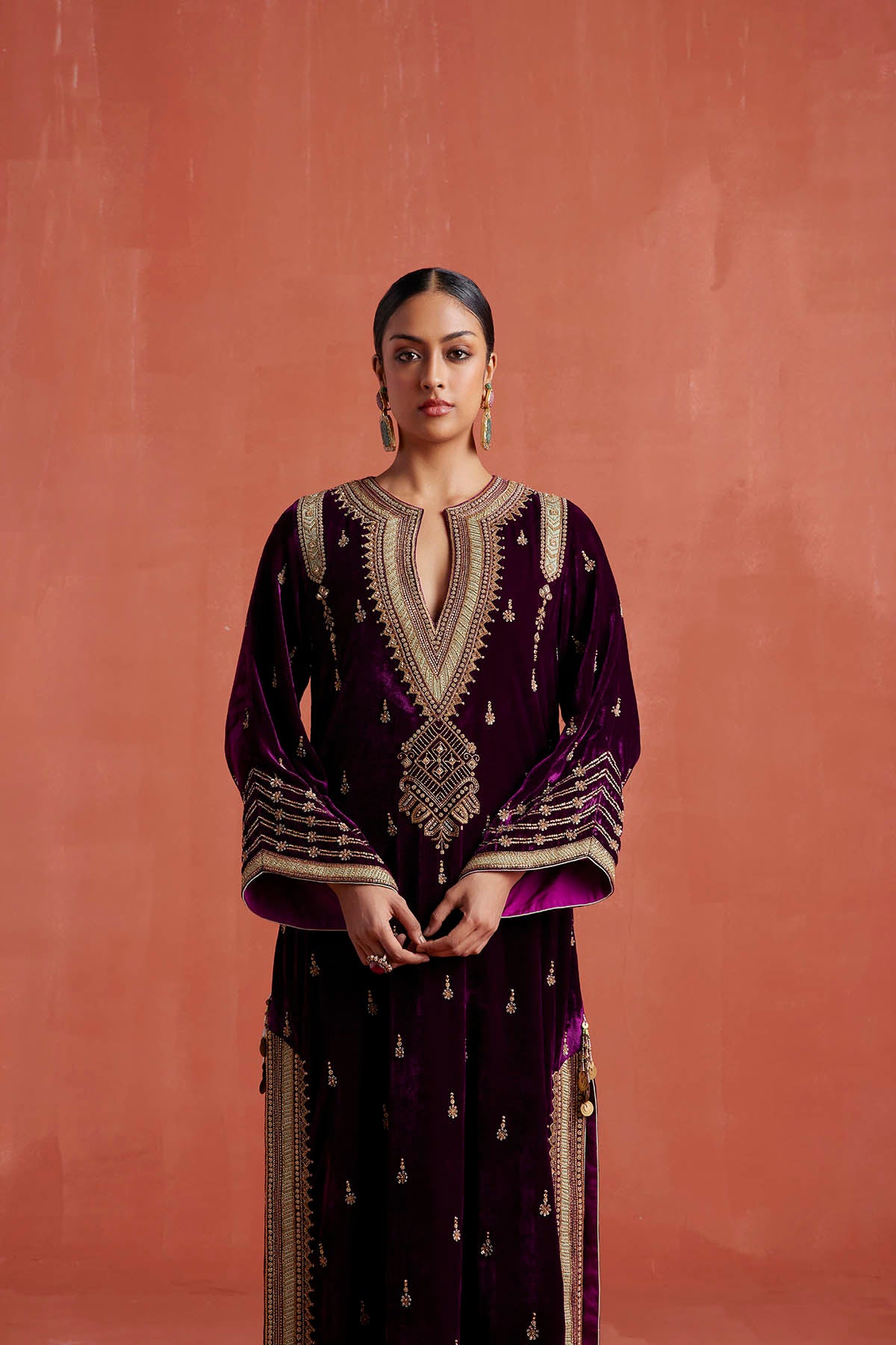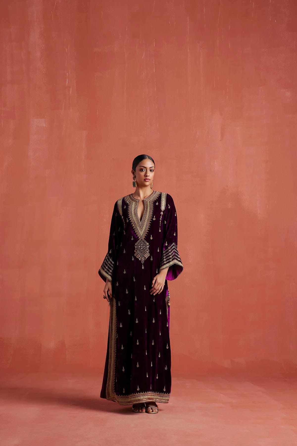 Plum silk velvet drapes down the shoulder to the ankle in this floor-skimming kaftan with a plunging neckline. An intricately embroidered yoke coupled with delicate motifs across the surface make this otherwise casual look go the extra mile.