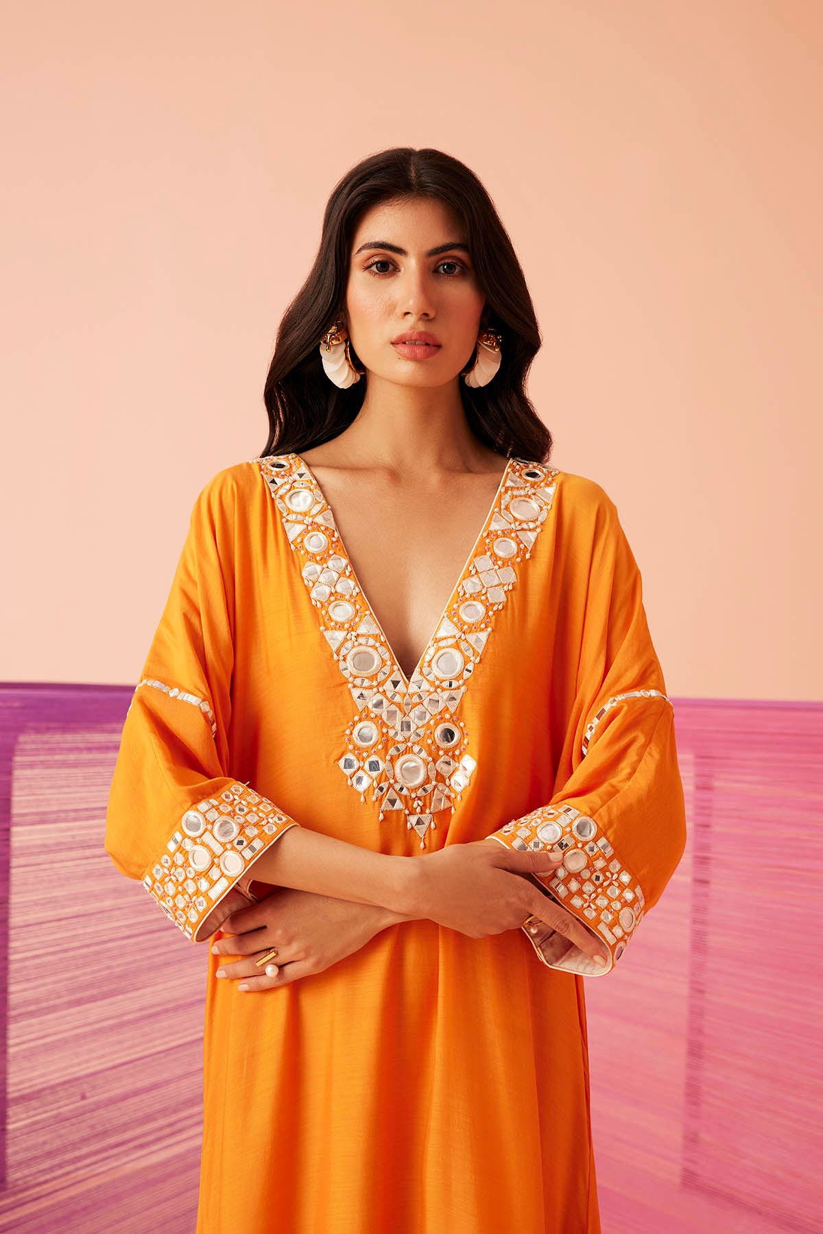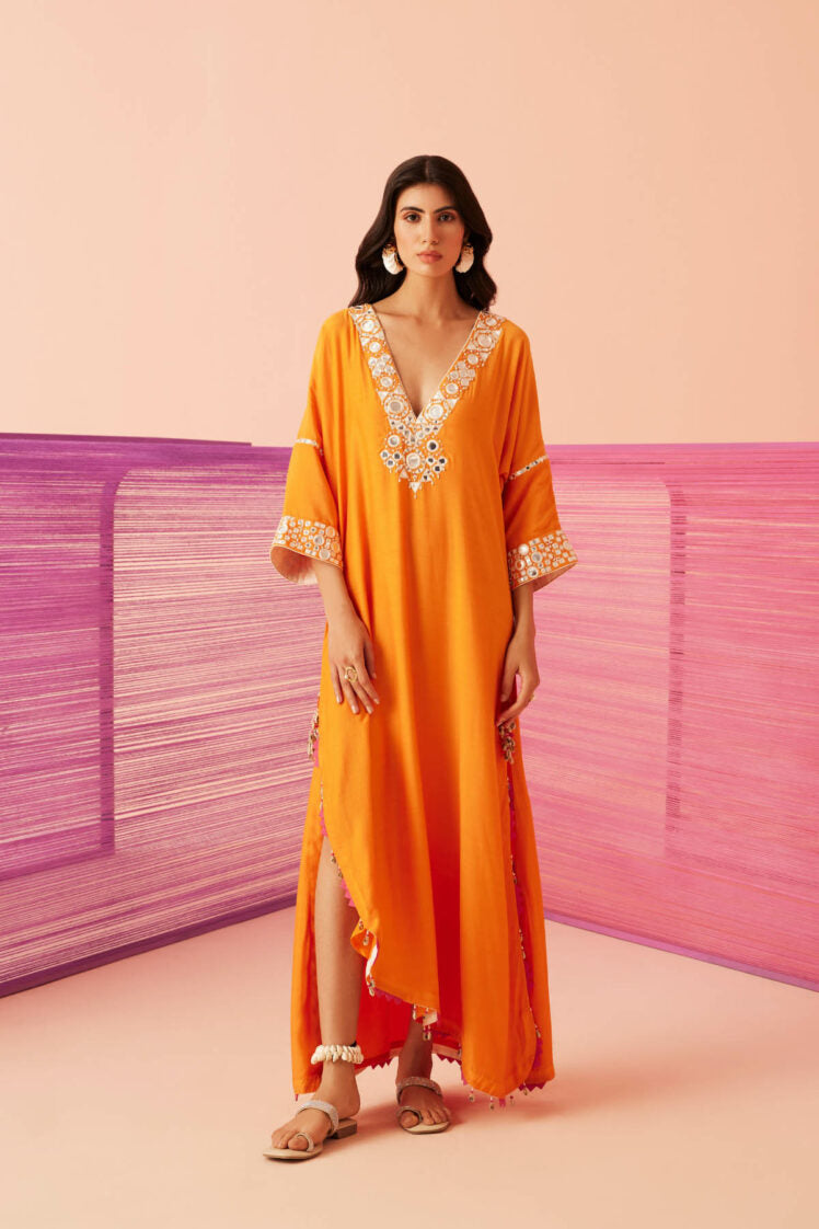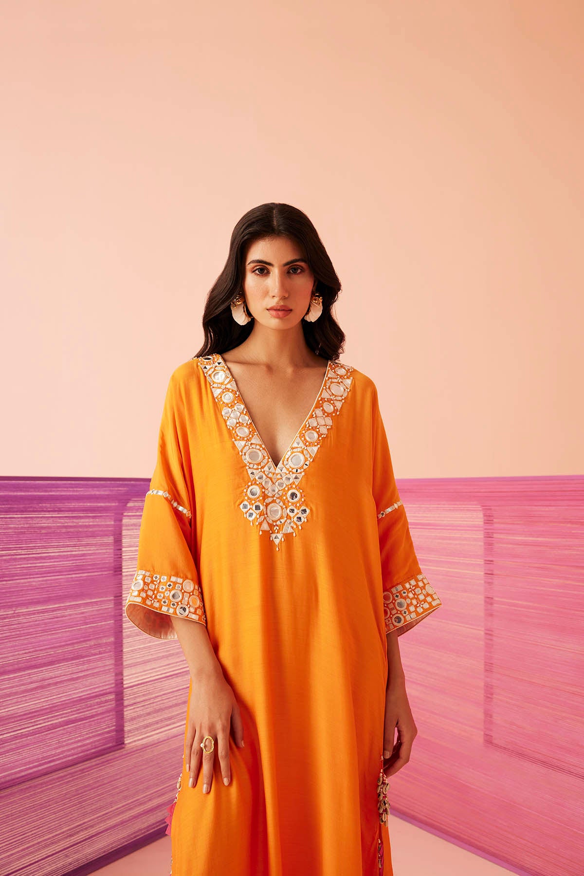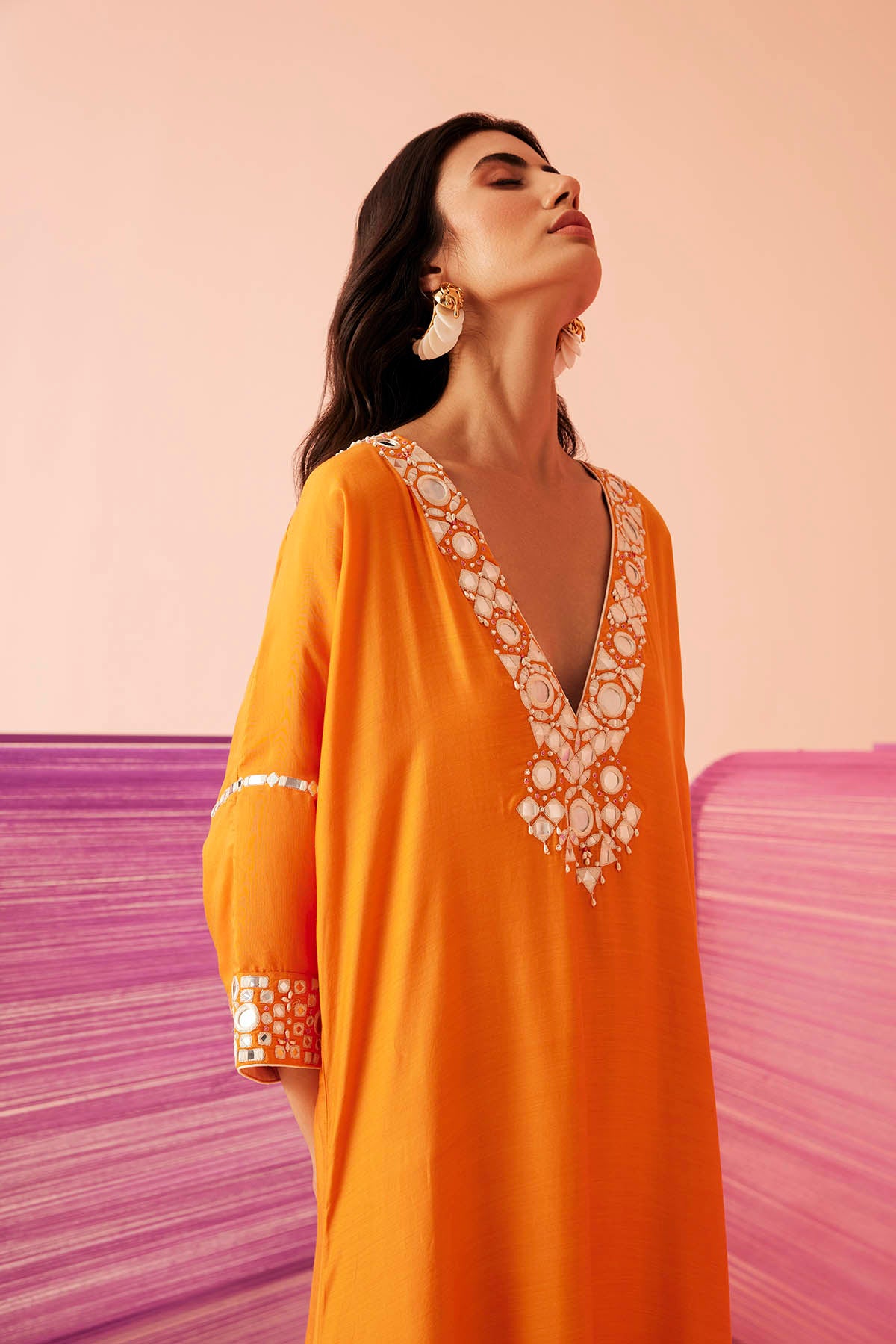 Get ready to turn heads in this gorgeous orange kaftan with intricate mirror and resham embroidery in elegant ivory. The plunging V neckline and playful tassels add a touch of drama, while the asymmetrical cut and side slit keep it modern. Mehendi or beach club? You can wear it to both!
