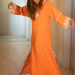 Get ready to turn heads in this gorgeous orange kaftan with intricate mirror and resham embroidery in elegant ivory. The plunging V neckline and playful tassels add a touch of drama, while the asymmetrical cut and side slit keep it modern. Mehendi or beach club? You can wear it to both!