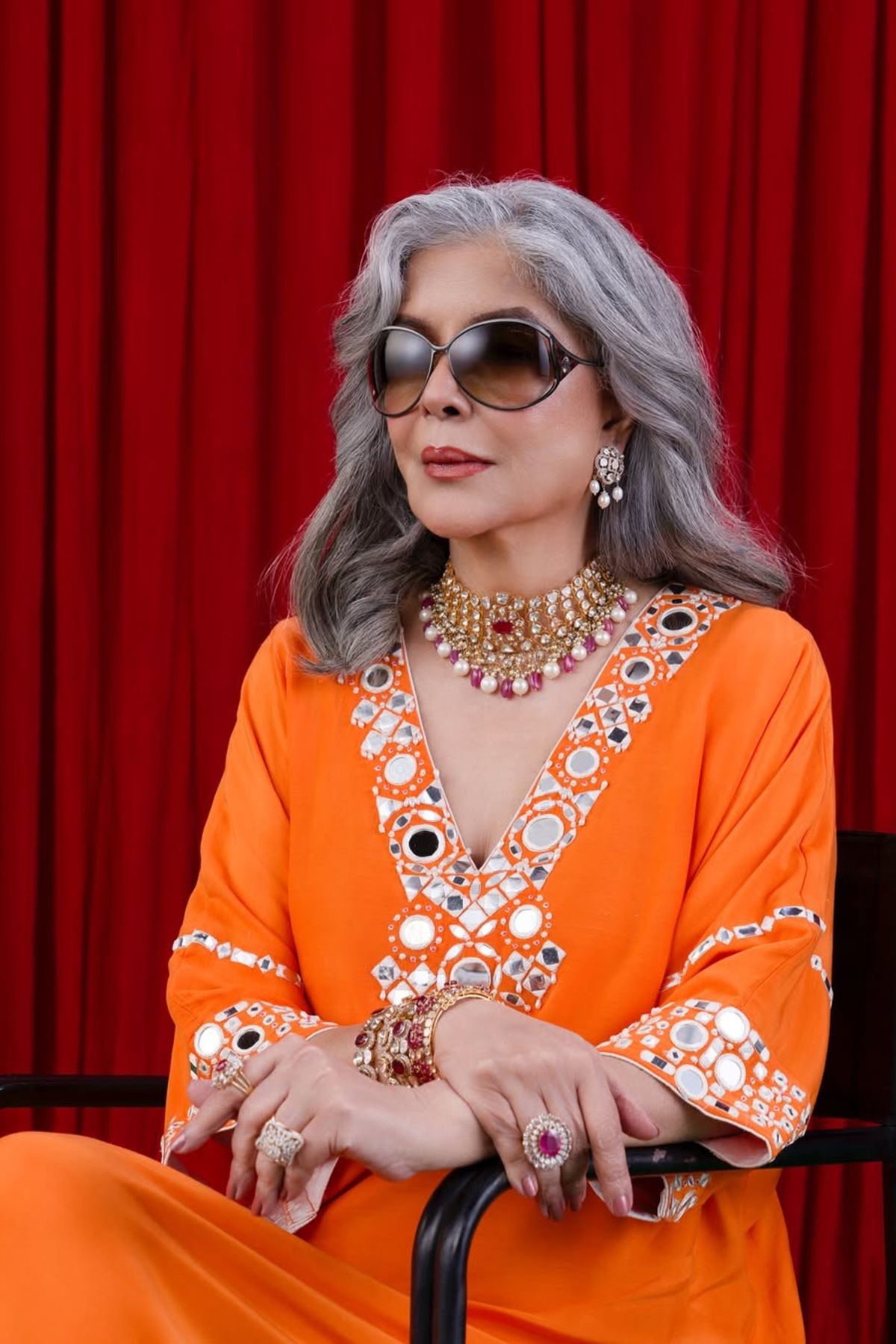 Get ready to turn heads in this gorgeous orange kaftan with intricate mirror and resham embroidery in elegant ivory. The plunging V neckline and playful tassels add a touch of drama, while the asymmetrical cut and side slit keep it modern. Mehendi or beach club? You can wear it to both!