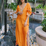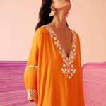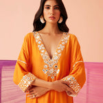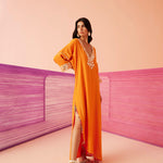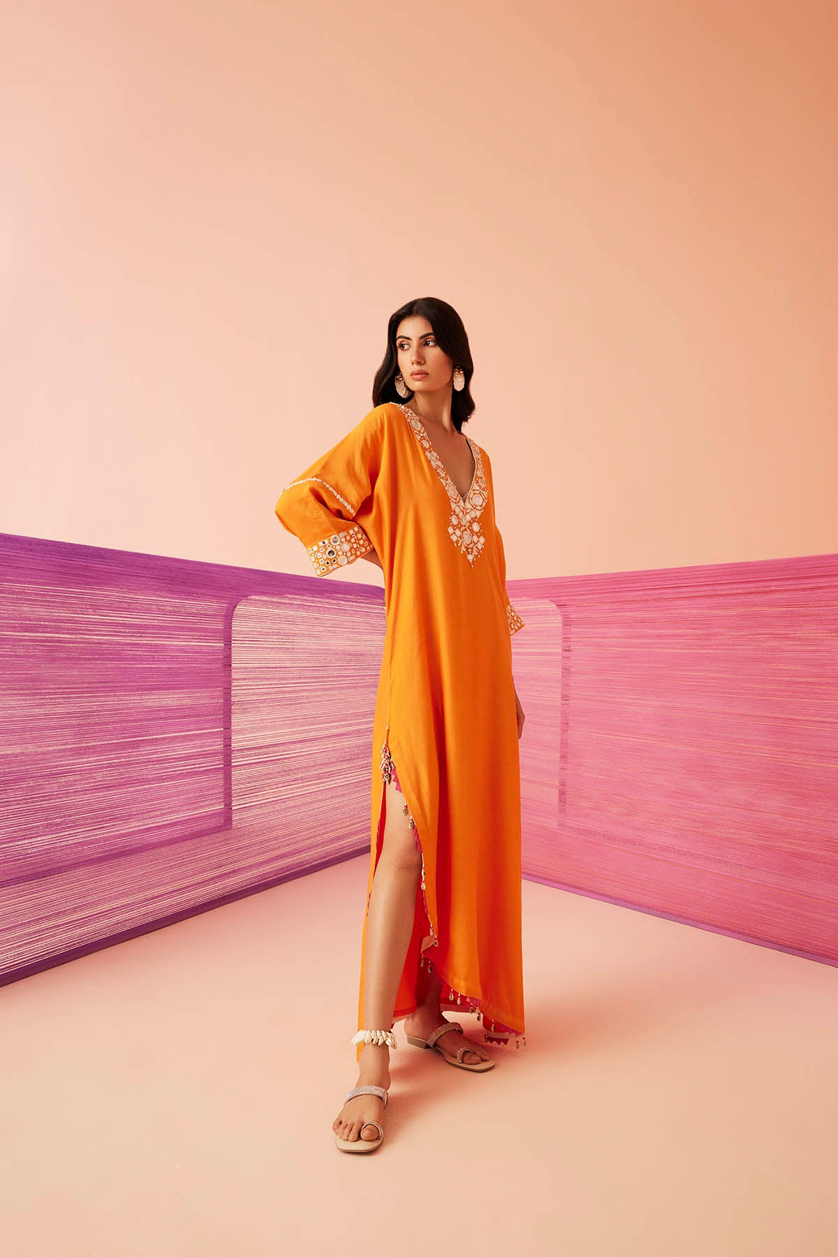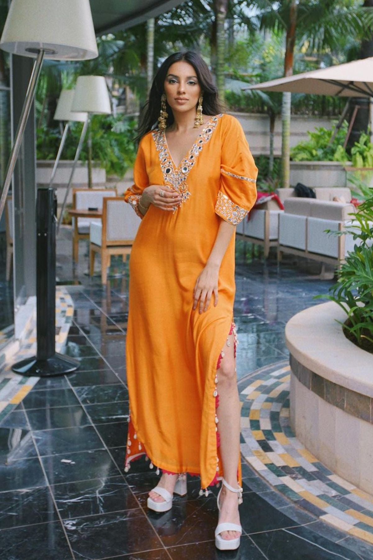 Get ready to turn heads in this gorgeous orange kaftan with intricate mirror and resham embroidery in elegant ivory. The plunging V neckline and playful tassels add a touch of drama, while the asymmetrical cut and side slit keep it modern. Mehendi or beach club? You can wear it to both!