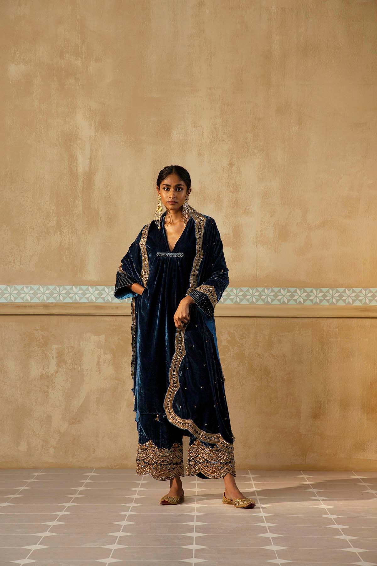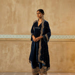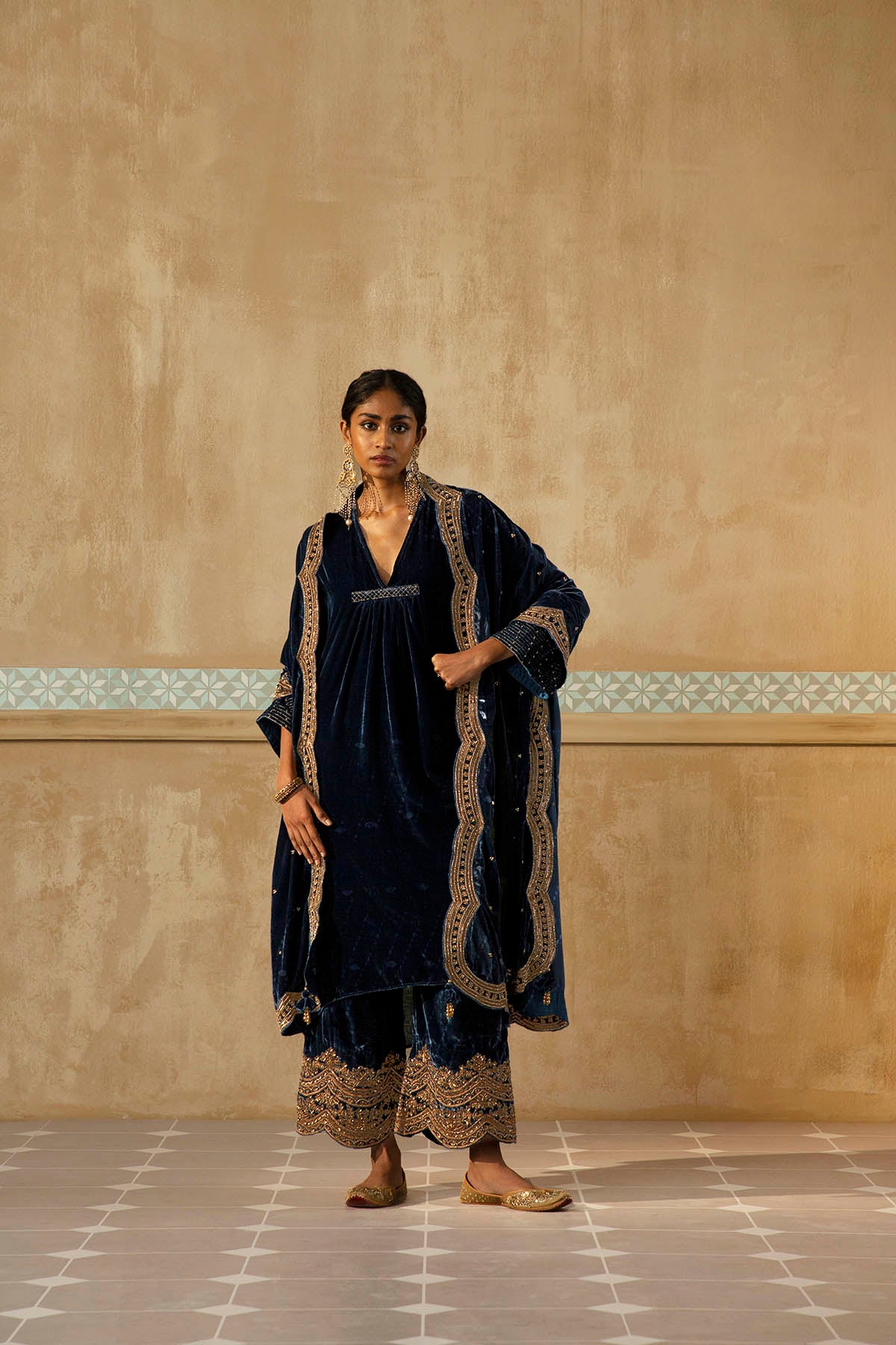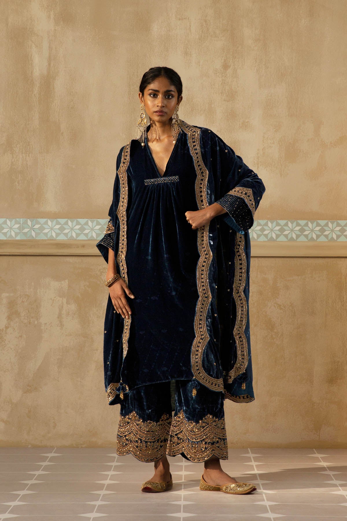 Something old, something new — this asymmetrical silk velvet kurta with bell sleeves and a plunging neckline is traditional yet modern. The silhouette is its standout feature. The drama has been reserved for the scalloped palazzos accentuated with aari, zardozi, thread, sitara, bead and cutdana work. Add the wide scalloped matching dupatta with sitara bootis for a traditional look or skip it for modern charm.