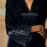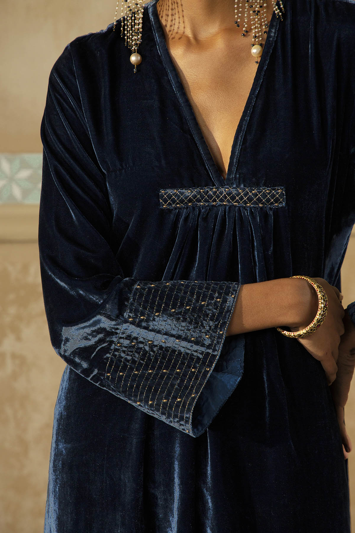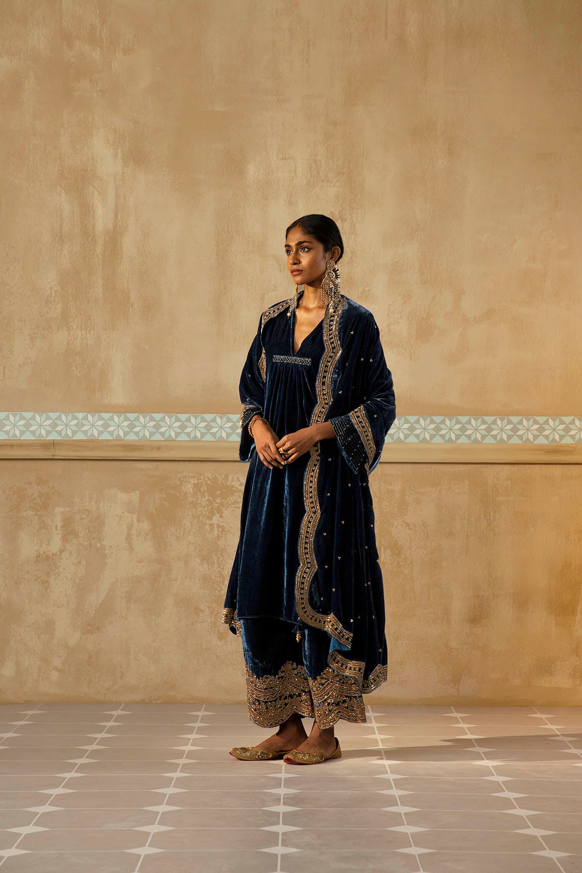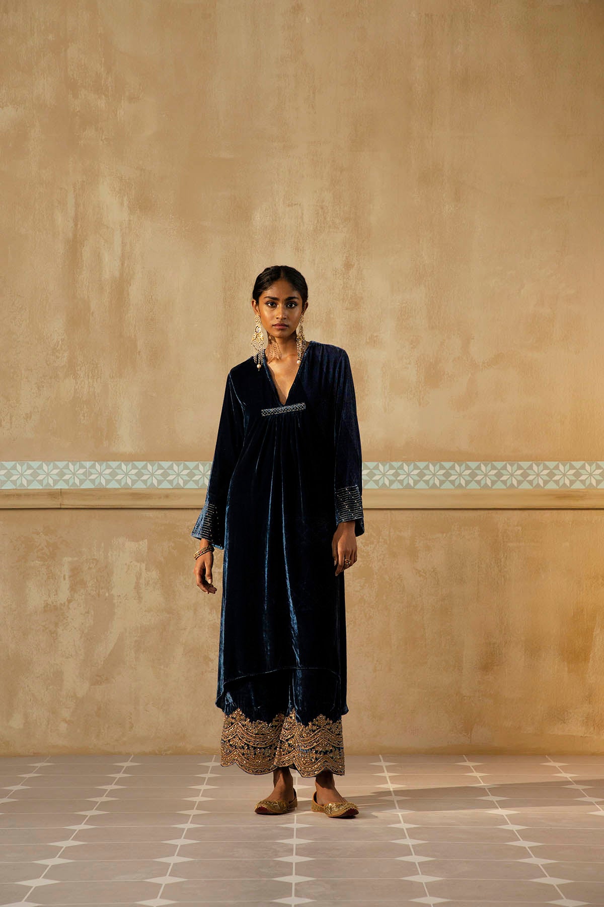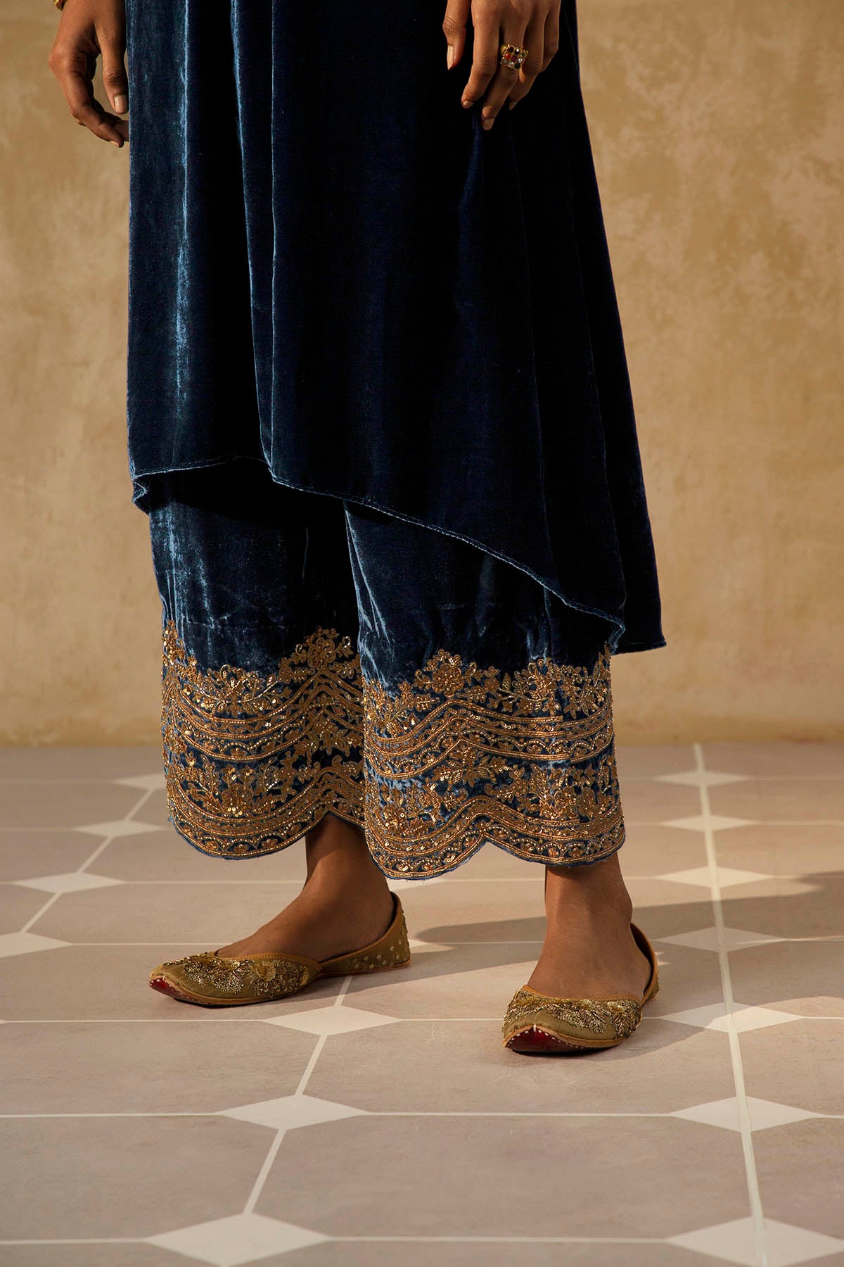 Something old, something new — this asymmetrical silk velvet kurta with bell sleeves and a plunging neckline is traditional yet modern. The silhouette is its standout feature. The drama has been reserved for the scalloped palazzos accentuated with aari, zardozi, thread, sitara, bead and cutdana work. Add the wide scalloped matching dupatta with sitara bootis for a traditional look or skip it for modern charm.