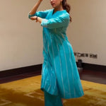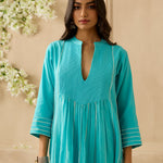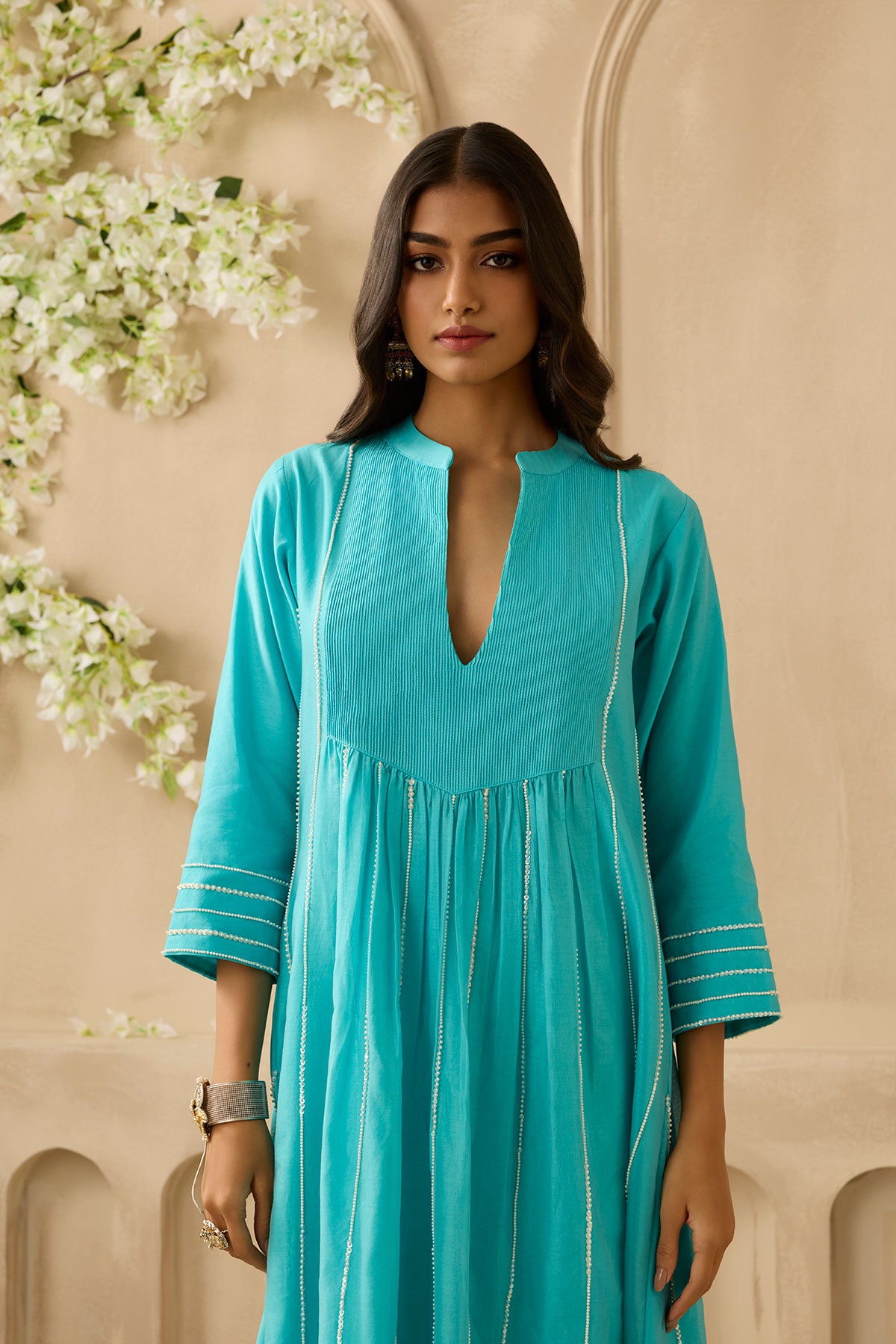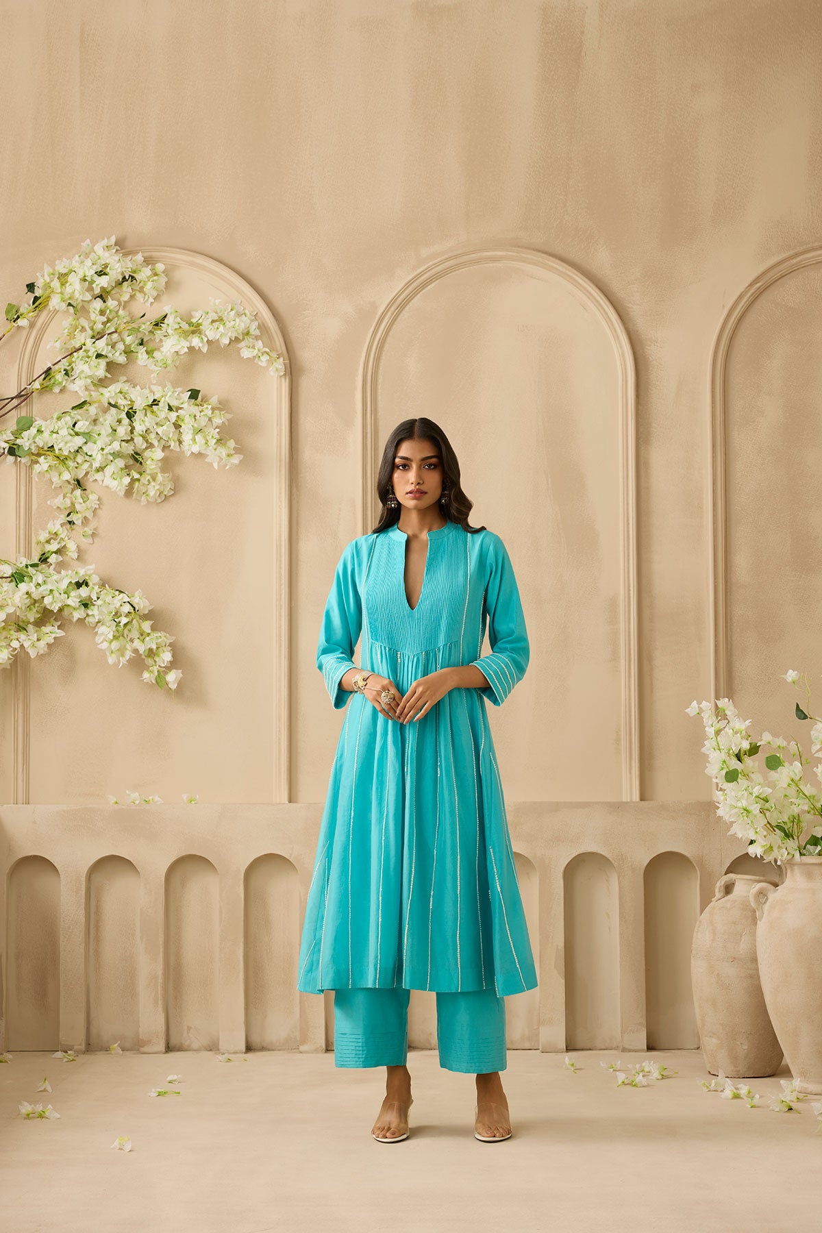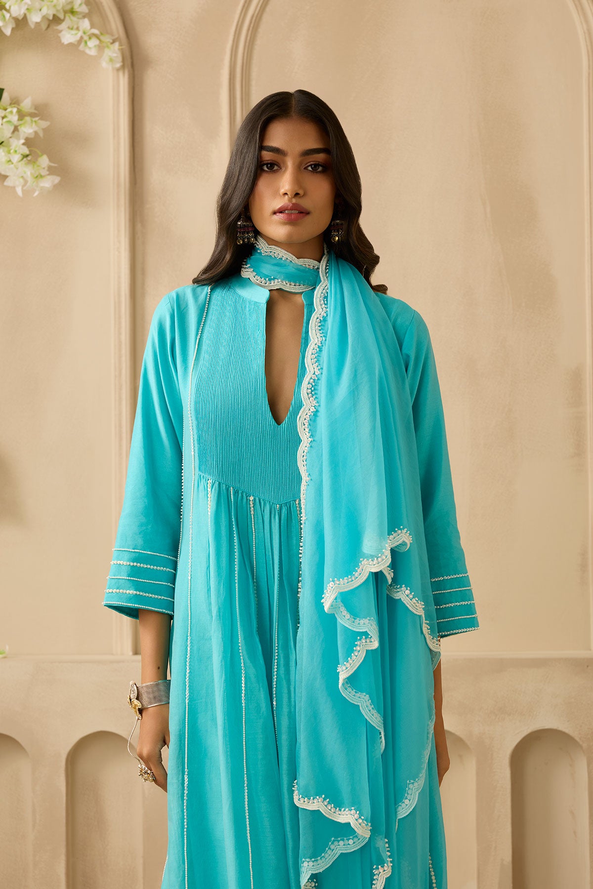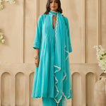 Our ferozi embroidered kurta set comes with wide-bottom palazzos (detailed at the hem), a flowy kurta that features intricate pearl embroidery along thin panels and a dreamy embroidered organza dupatta that is finished to perfection. Easy to dress up or down, this one caters to every mood.