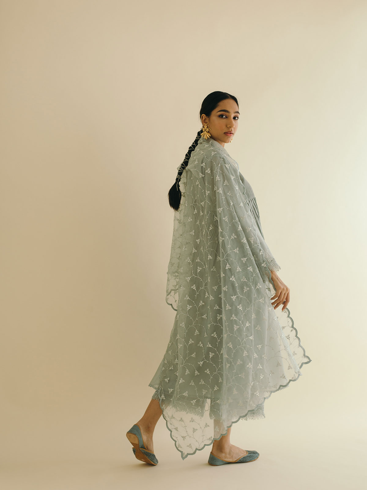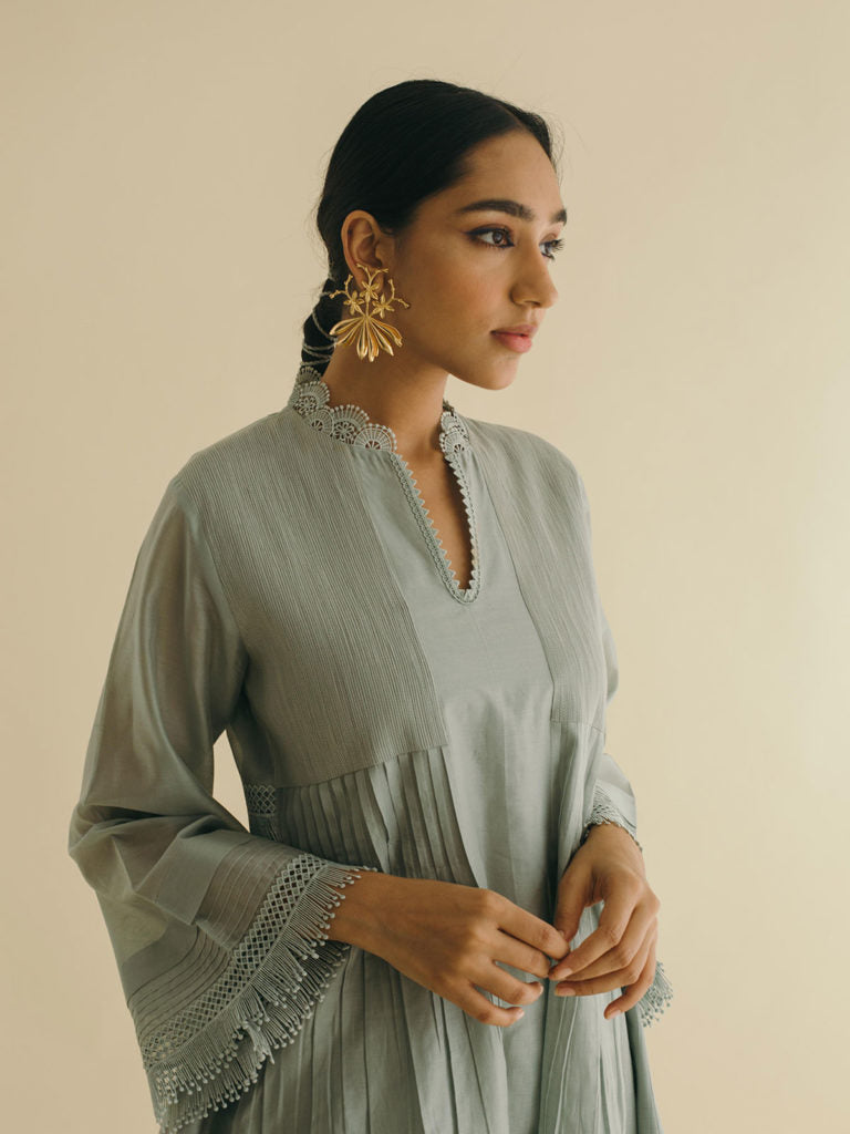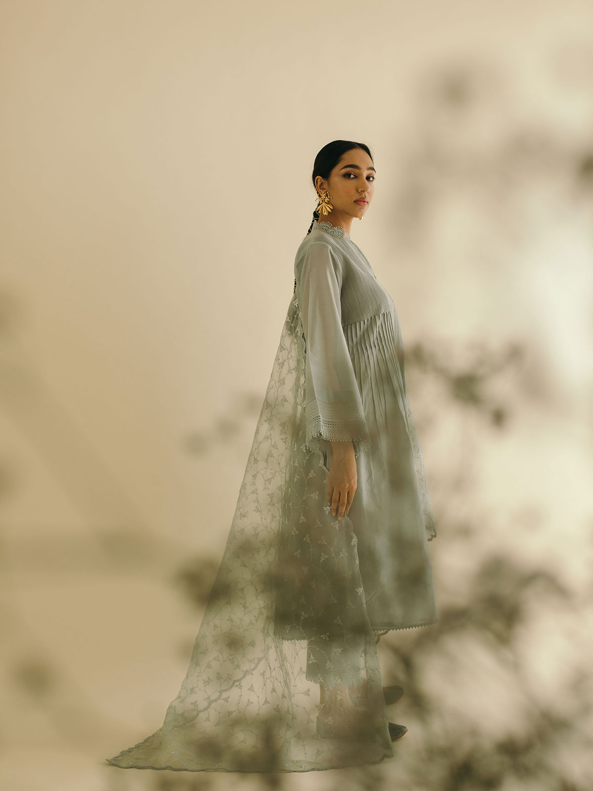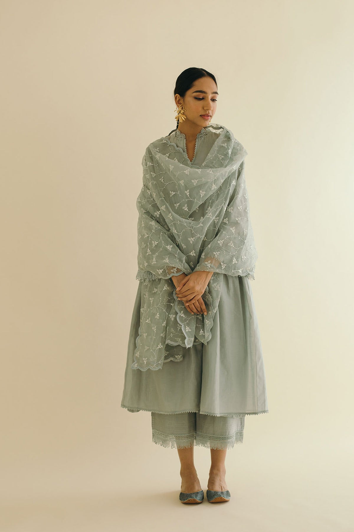 Purveyors of a ‘less is more’ aesthetic will be drawn to this dreamy sea-green kurta set. The flared sleeves add just the right amount of drama, and the lace detailing elevates this simple look. Paired here with our signature embroidered organza dupatta, this one’s a must have.