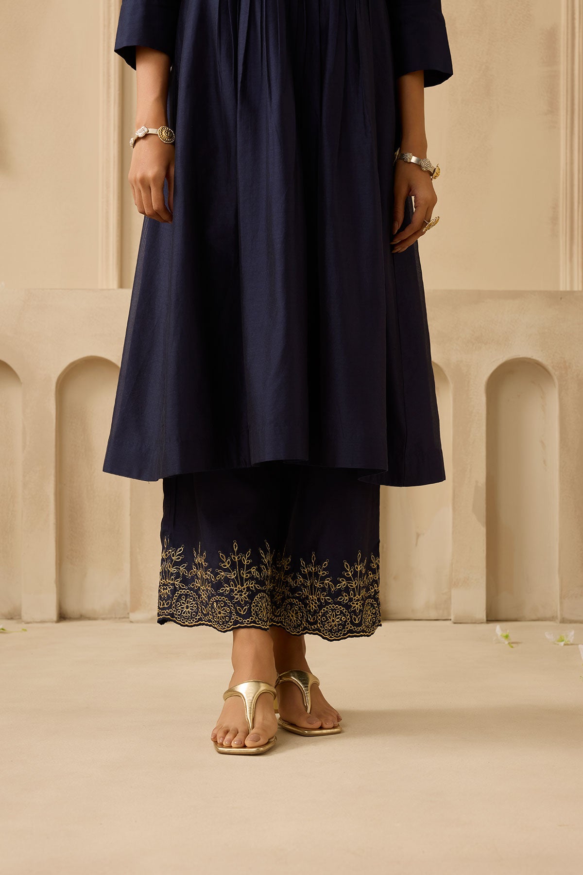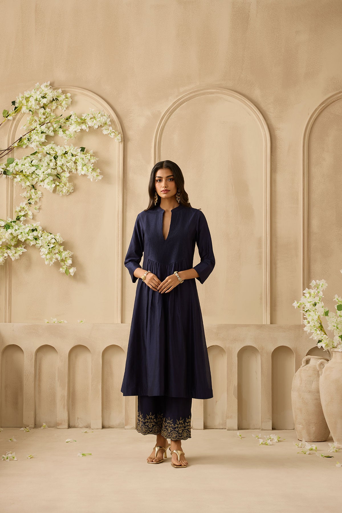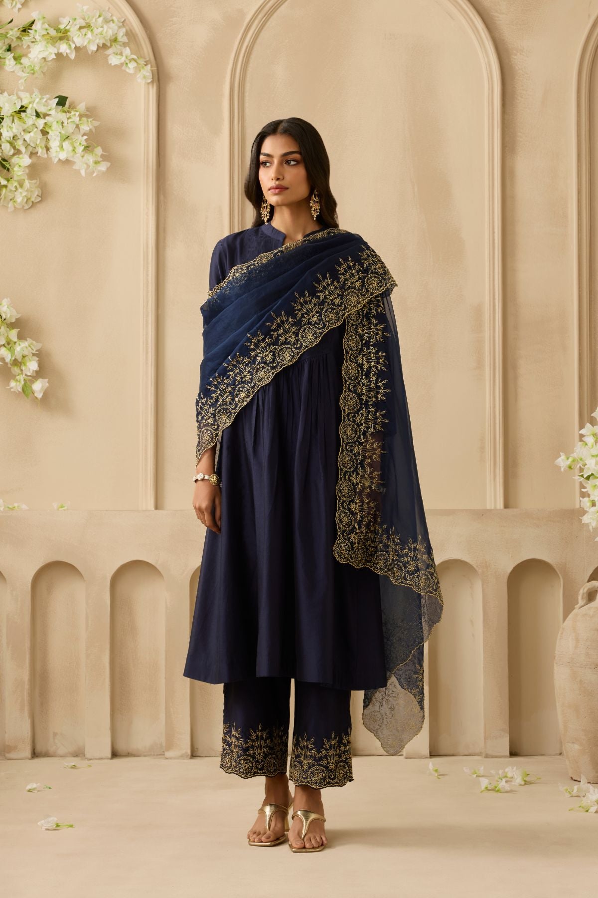 Our signature silk chanderi set comes with wide-bottomed pants that are scalloped and adorned with a thick band of pale gold zari embroidery. Paired here with our intricately pin-tucked yoke kurta and a gossammer organza dupatta that is edged on all sides with matching gold zari embroidery.