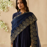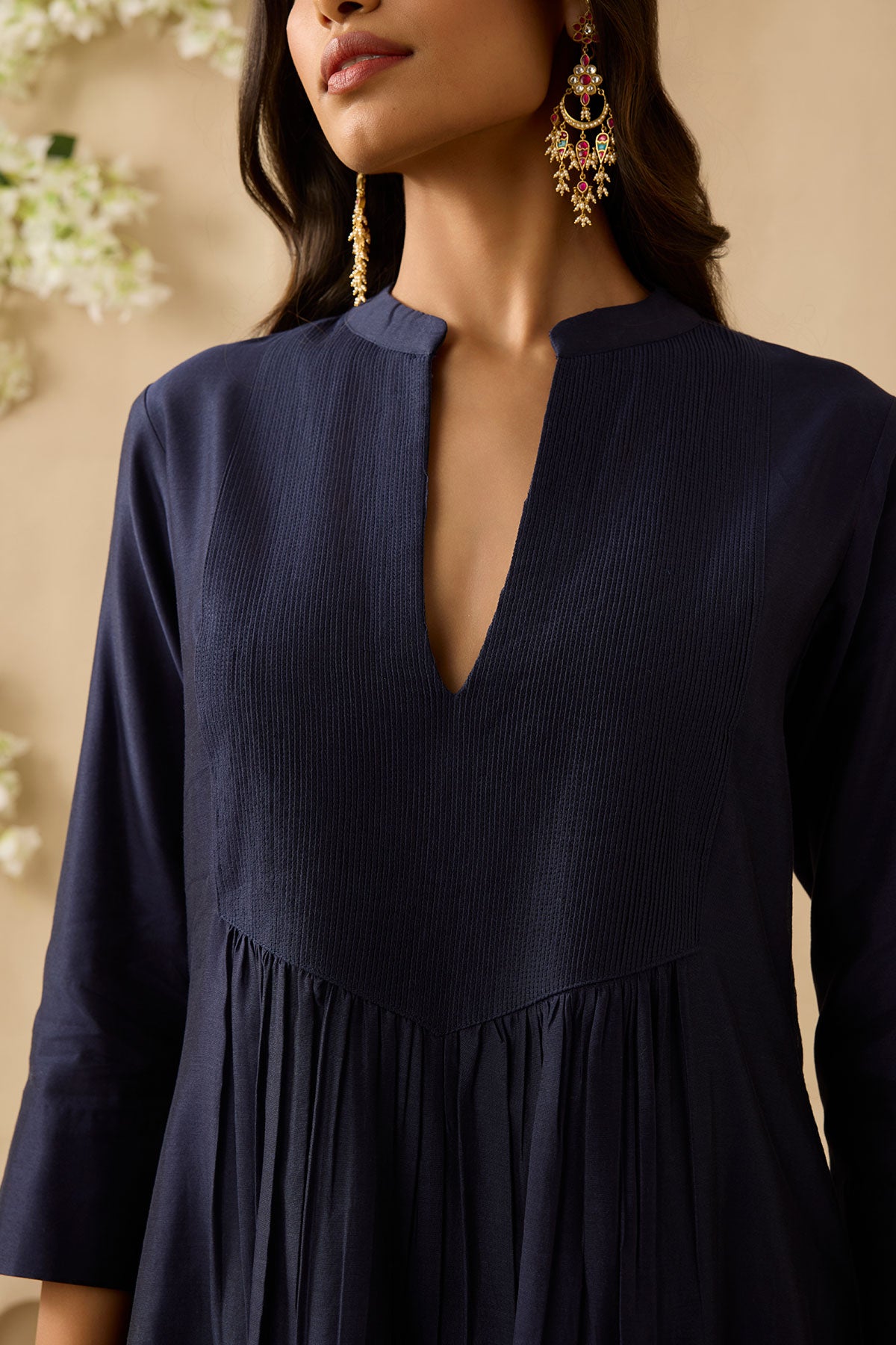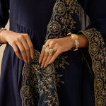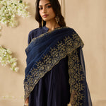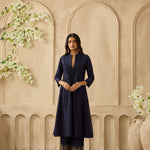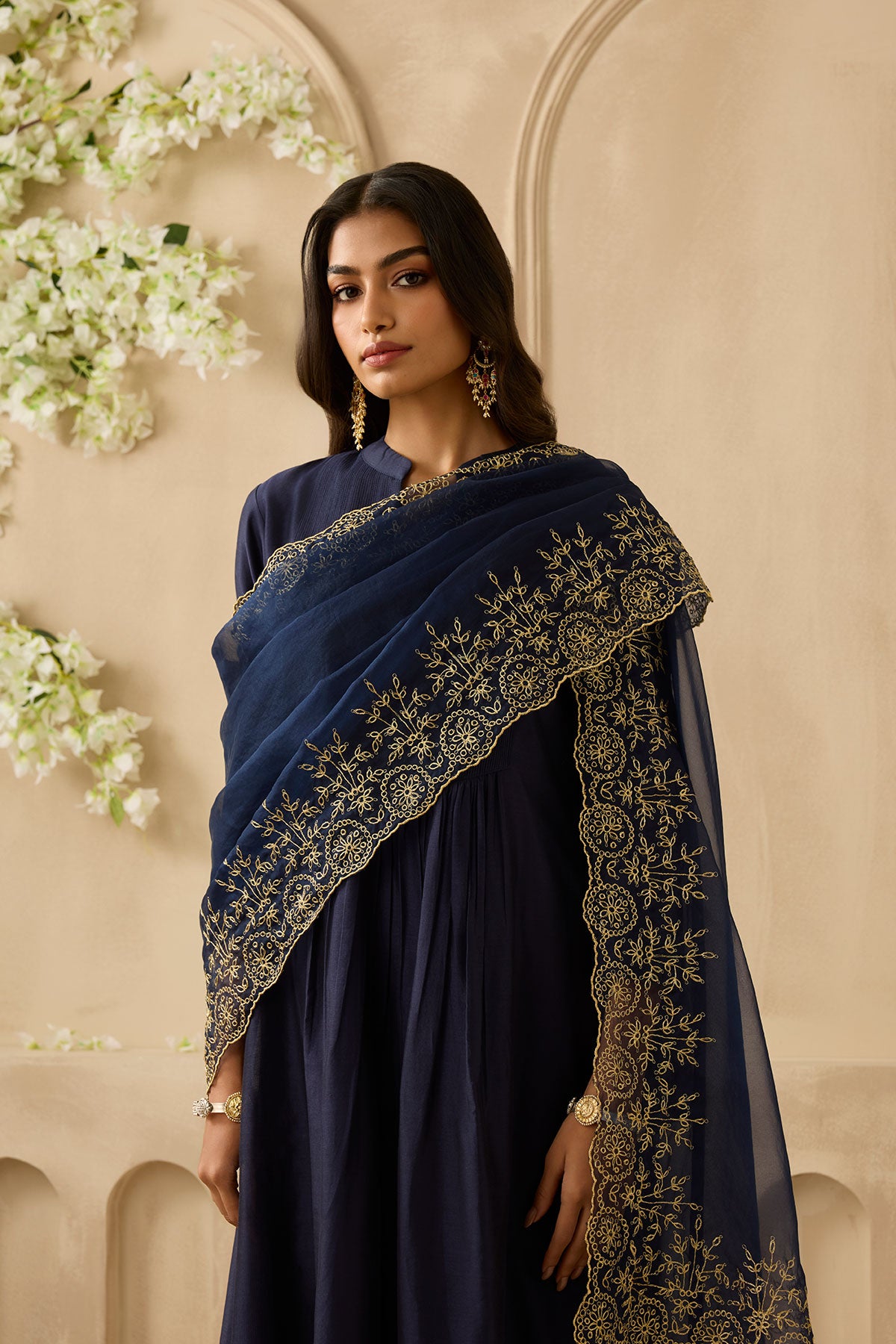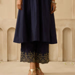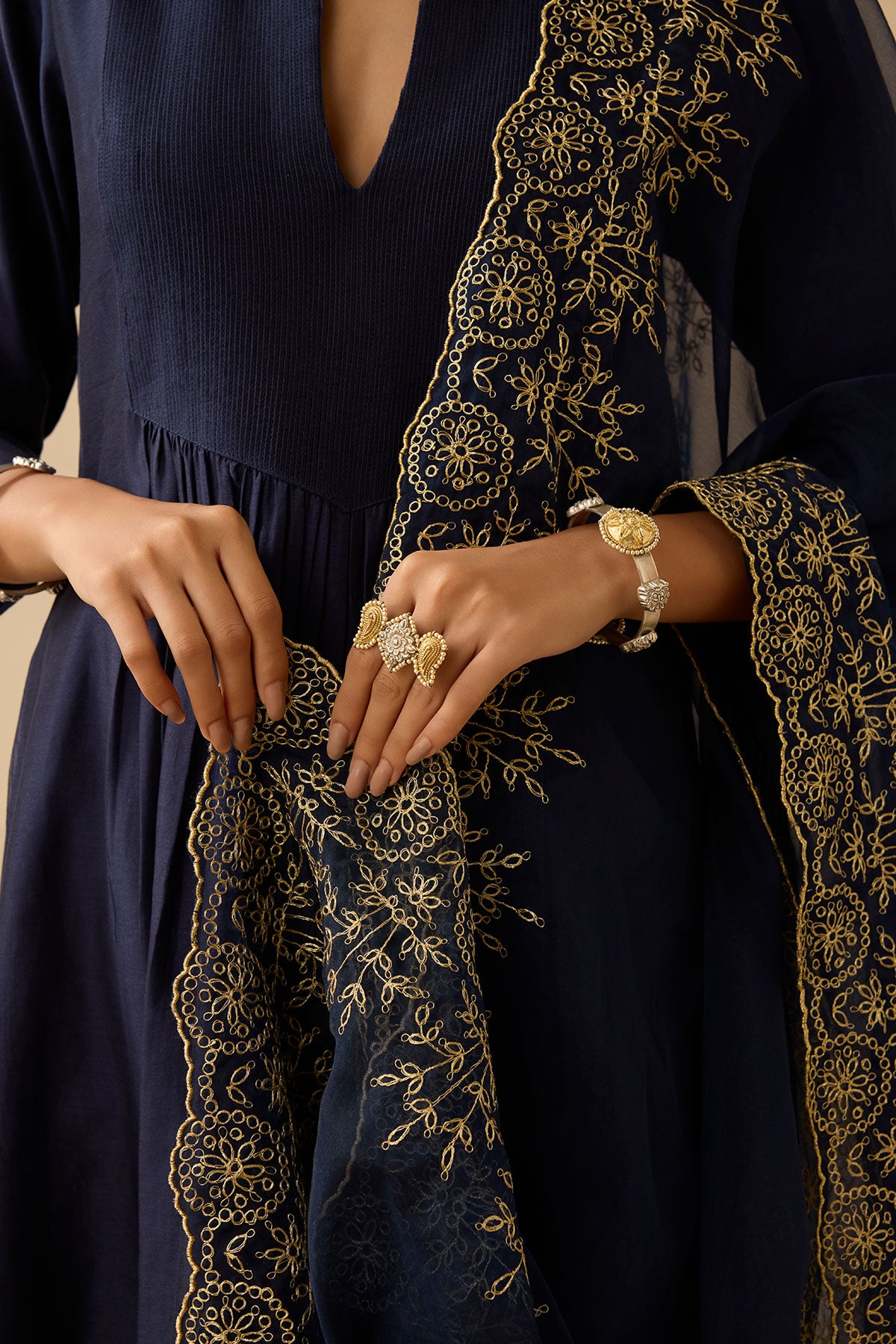 Our signature silk chanderi set comes with wide-bottomed pants that are scalloped and adorned with a thick band of pale gold zari embroidery. Paired here with our intricately pin-tucked yoke kurta and a gossammer organza dupatta that is edged on all sides with matching gold zari embroidery.
