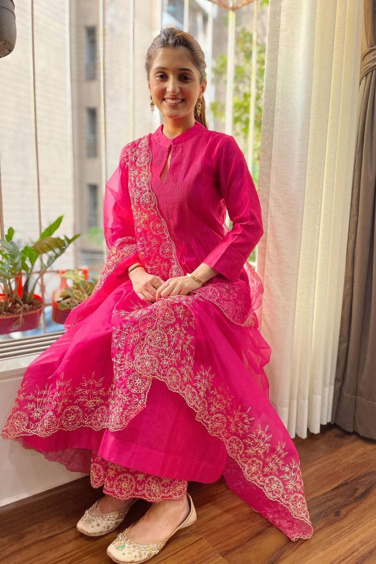Our crimson magenta silk chanderi set comes with wide-bottomed pants that are scalloped and adorned with a thick band of pale gold zari embroidery. Paired here with our intricately pin-tucked yoke kurta and a gossammer organza dupatta that is edged on all sides with matching zari embroidery.