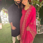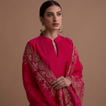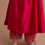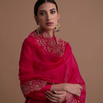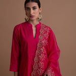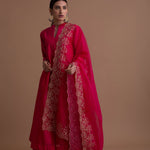 Our crimson magenta silk chanderi set comes with wide-bottomed pants that are scalloped and adorned with a thick band of pale gold zari embroidery. Paired here with our intricately pin-tucked yoke kurta and a gossammer organza dupatta that is edged on all sides with matching zari embroidery.