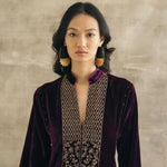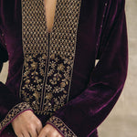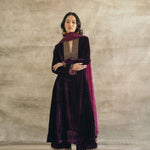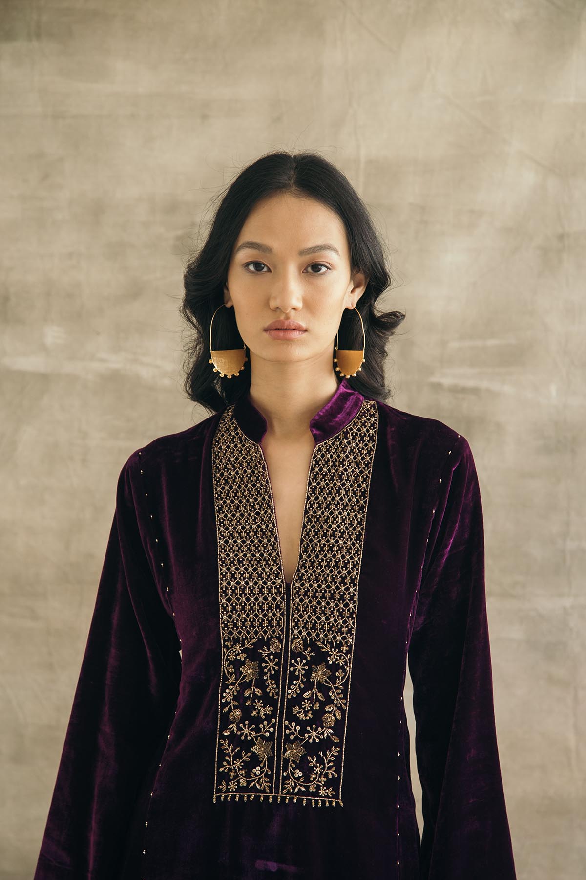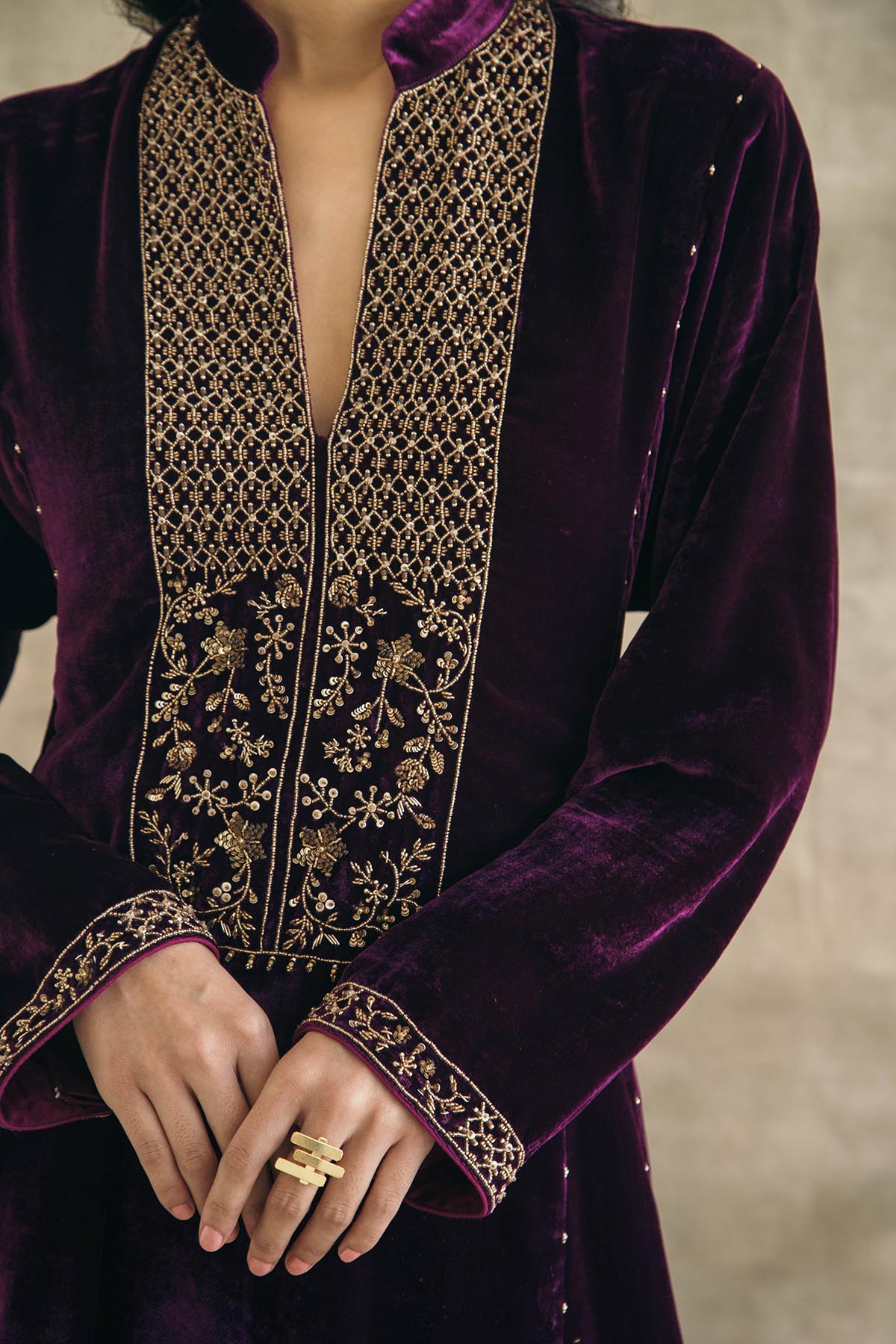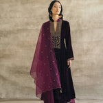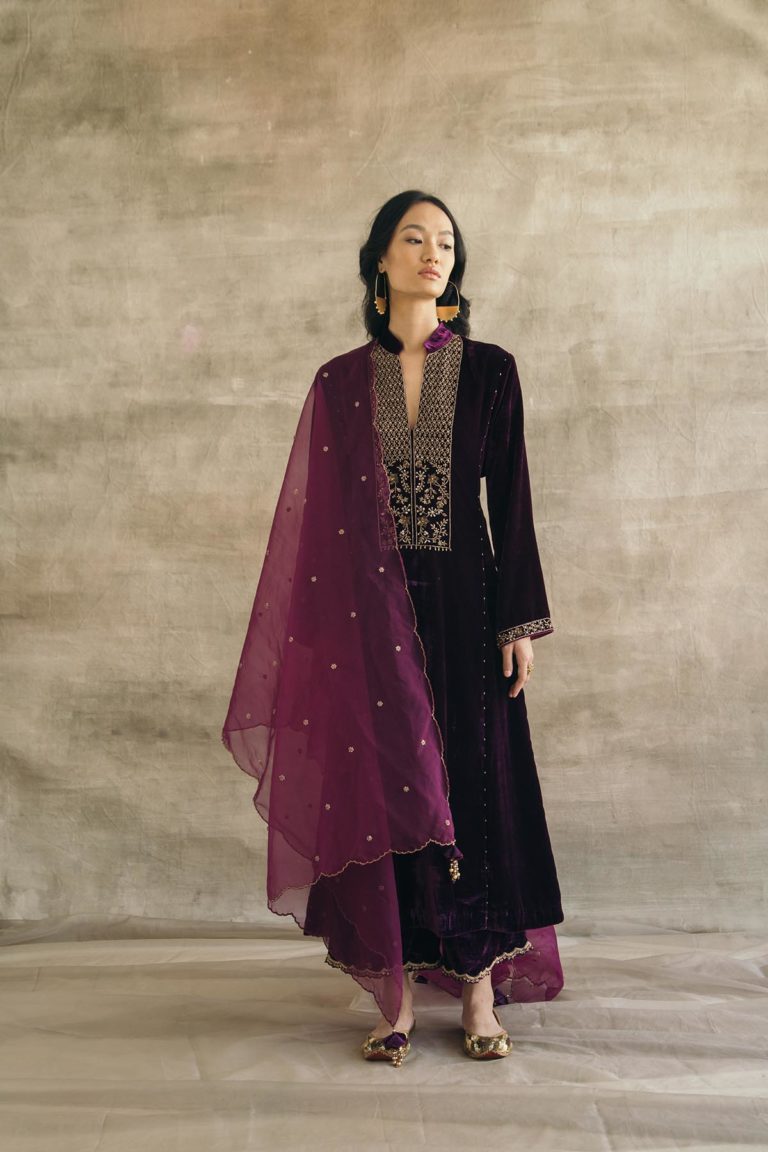 An extravanganza of organza and velvet — this kurta and palazzo set is all about polished perfection. Jewel-toned richness meets the subtle glint of aari, cutdana, sitara and zardozi work. The sheer organza drape is scalloped and beaded, also featuring sitara work. Antique gold jewellery and this set go hand in hand.