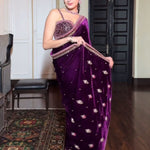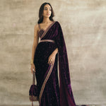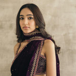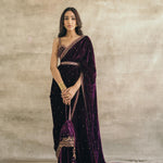 The sari that dreams are made of — nine yards of decadent silk velvet are adorned with hand embroidered thread, sitara, bead and cutdana work on the borders. The bustier style blouse with naka tiki jaal work adds a touch of modernity to the otherwise retro sari.