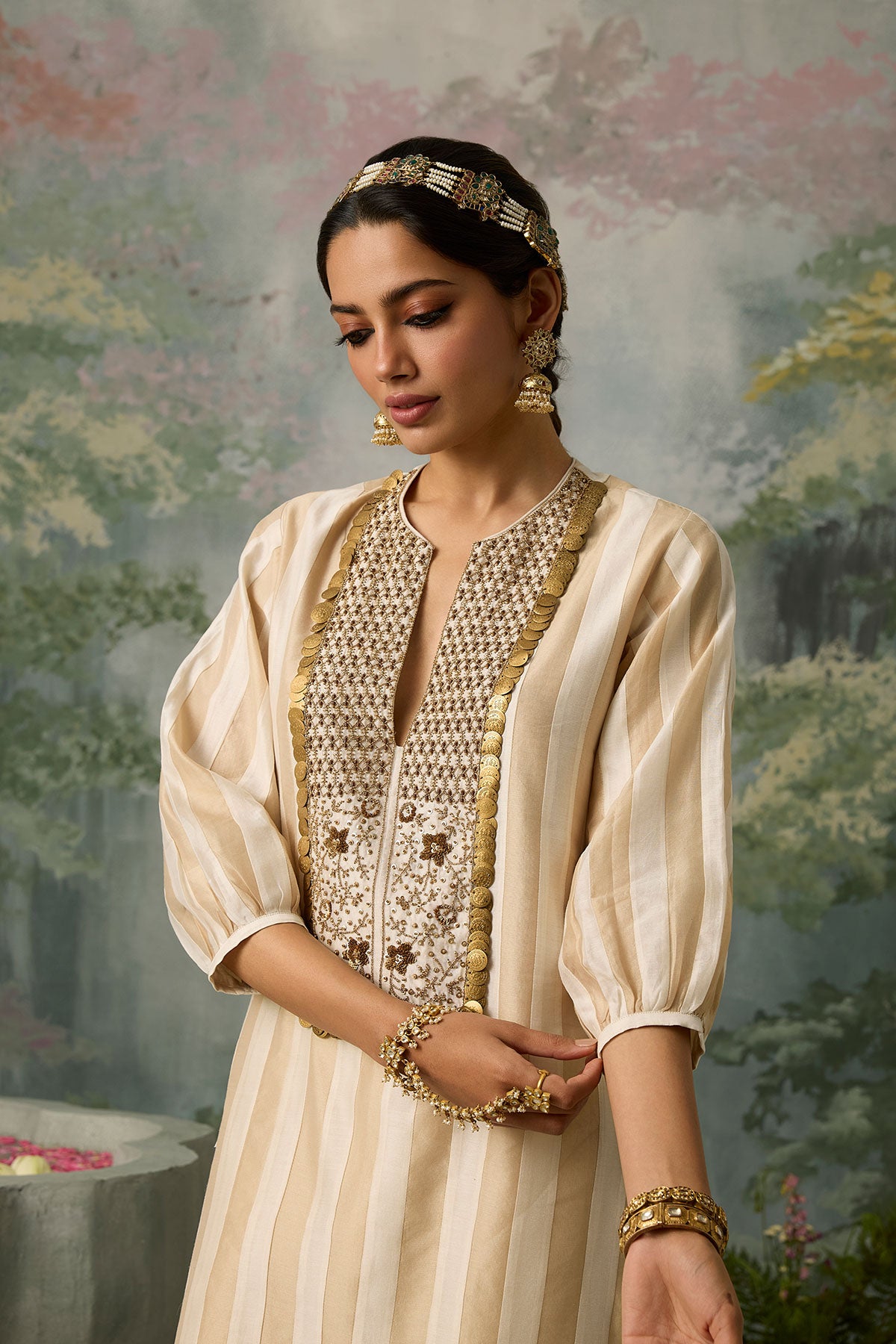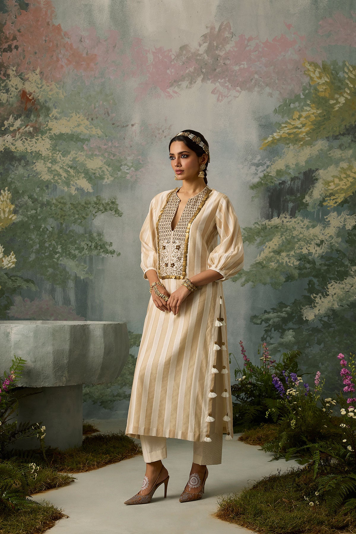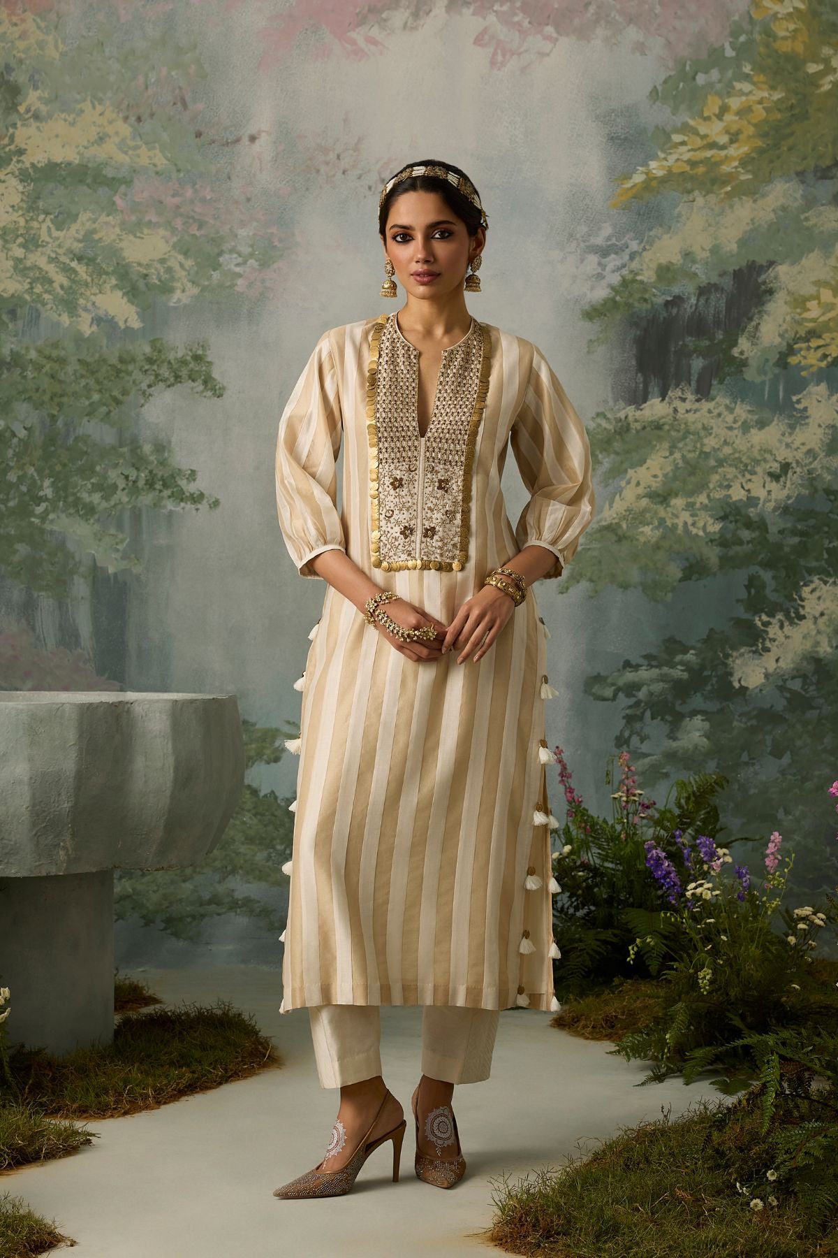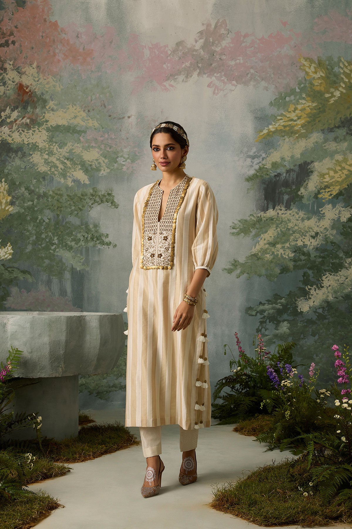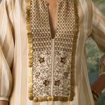 This ensemble proves that fashion and comfort aren’t mutually exclusive. The embroidered yoke draws the eye, while the ivory and dark beige striped base adds a touch of whimsy to an effortlessly versatile silhouette.