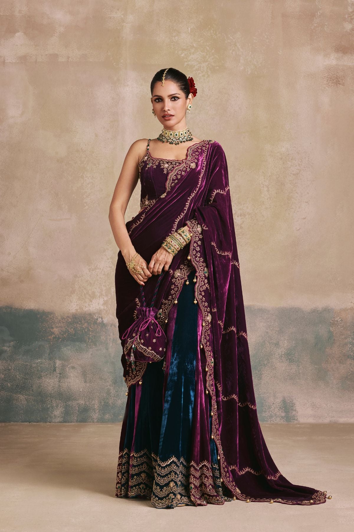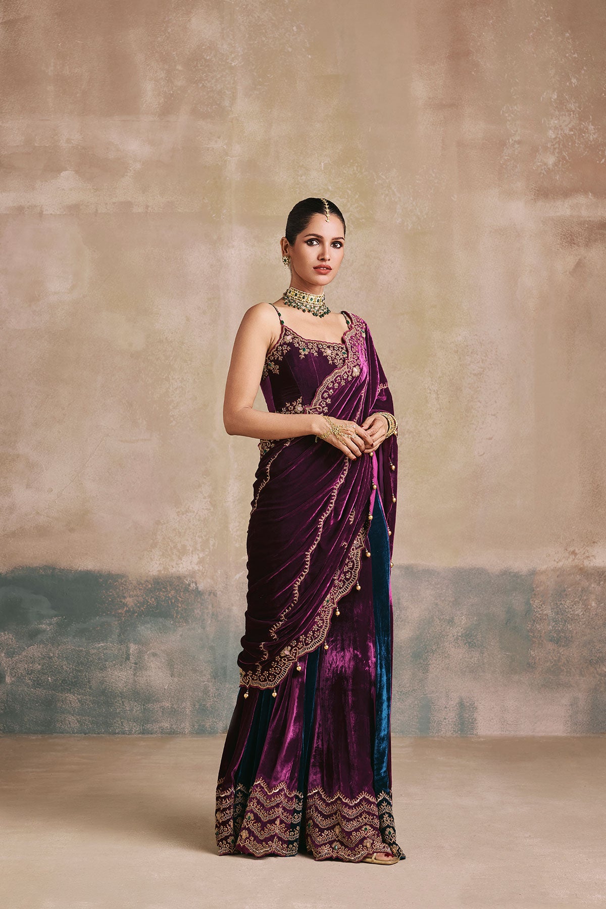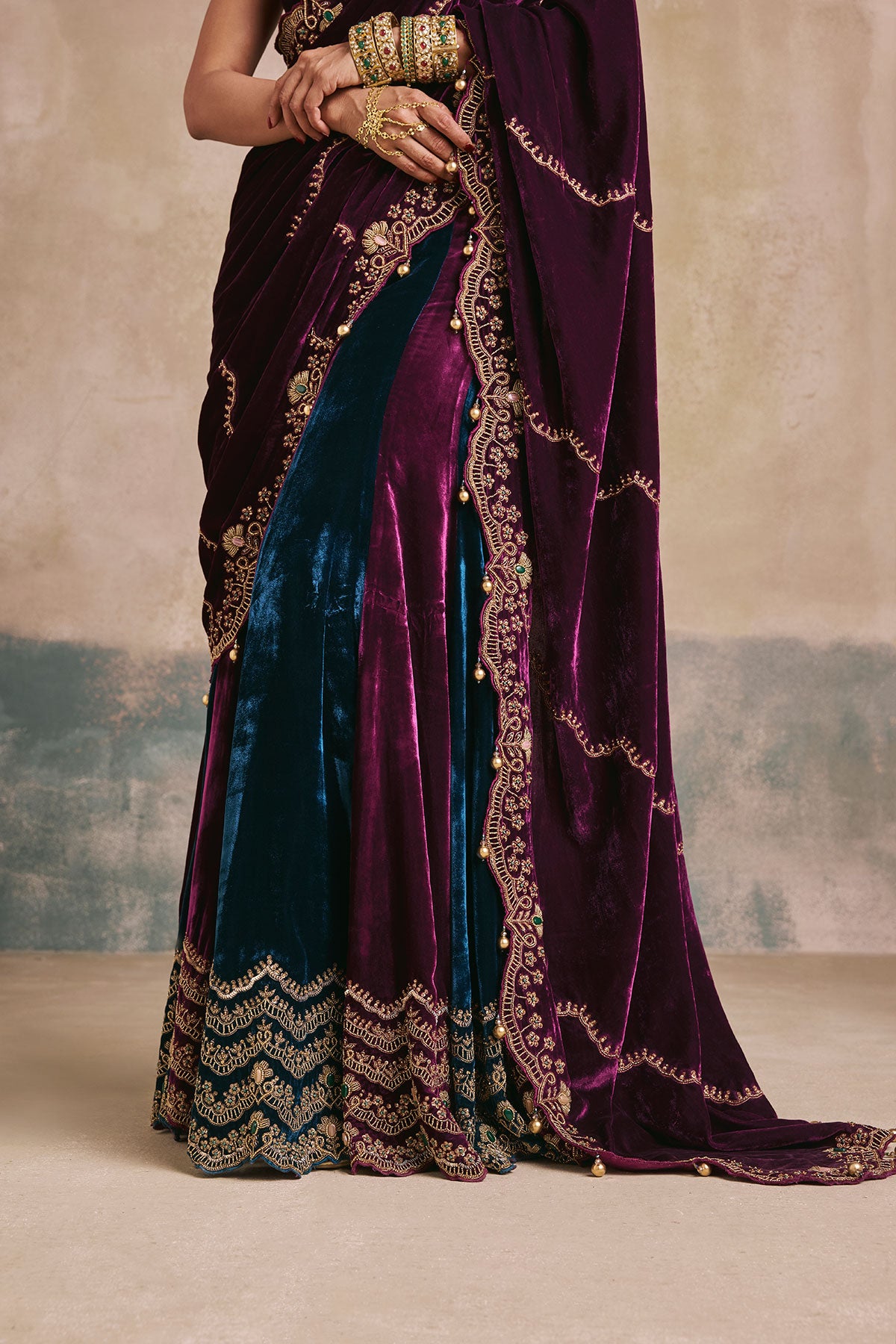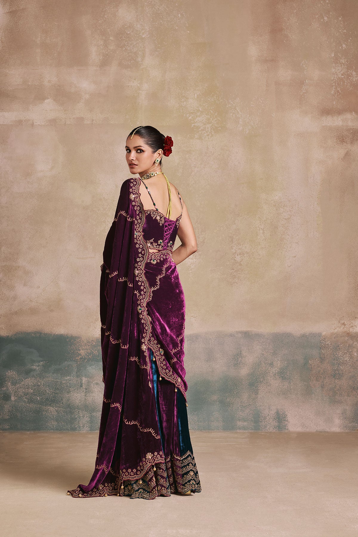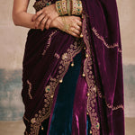 Crafted in two-tone plum and peacock blue silk velvet, this ensemble features a corset-style blouse, intricate embroidery, and a statement draped silhouette. A modern heirloom, perfect for the woman who commands attention.