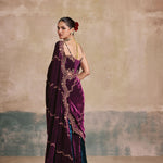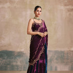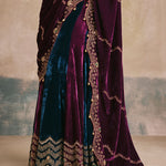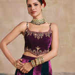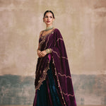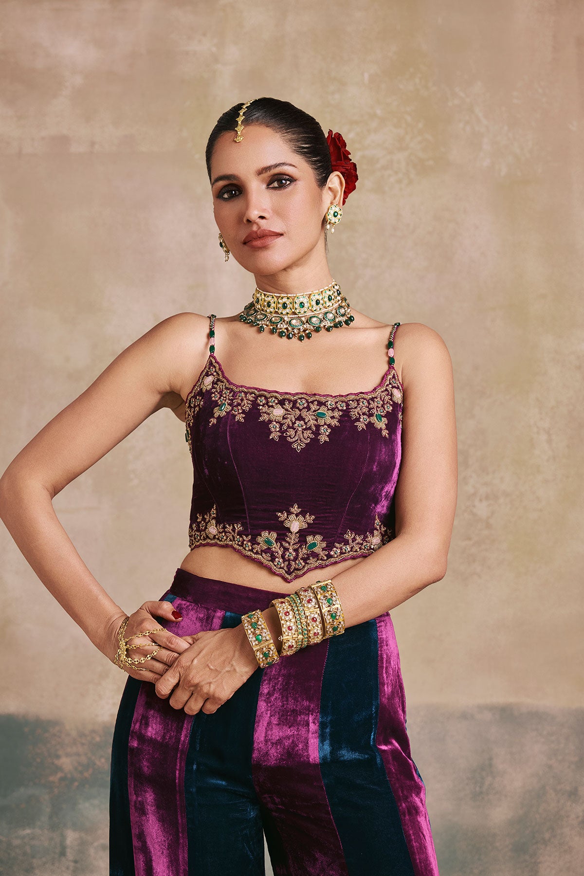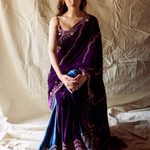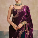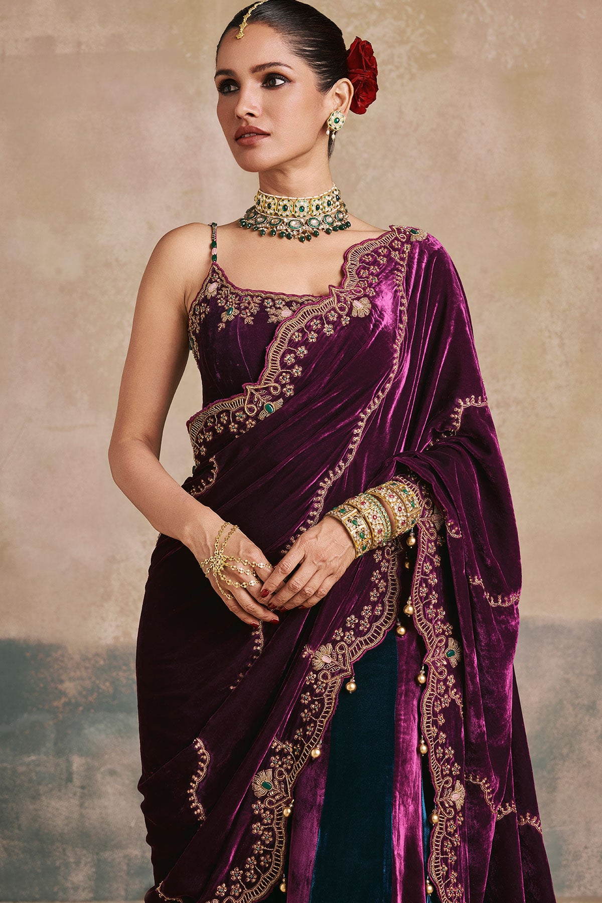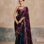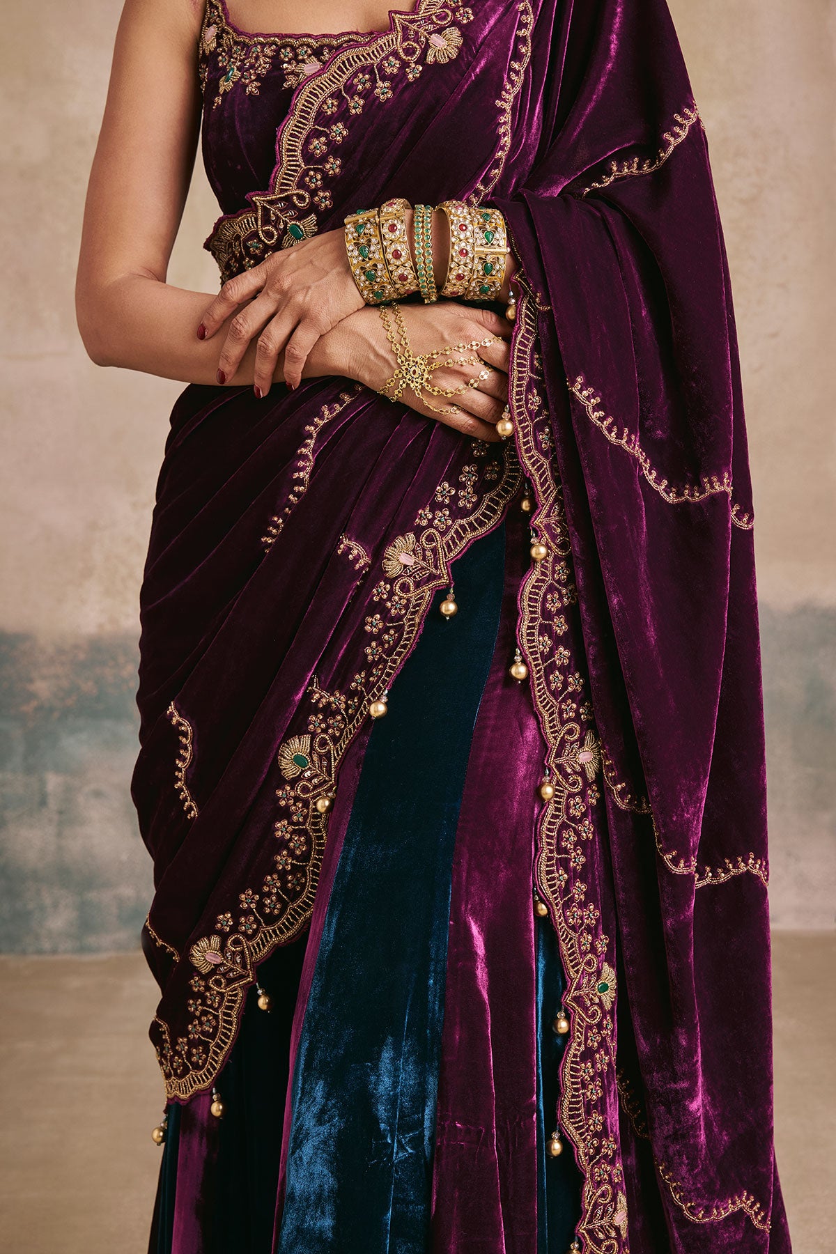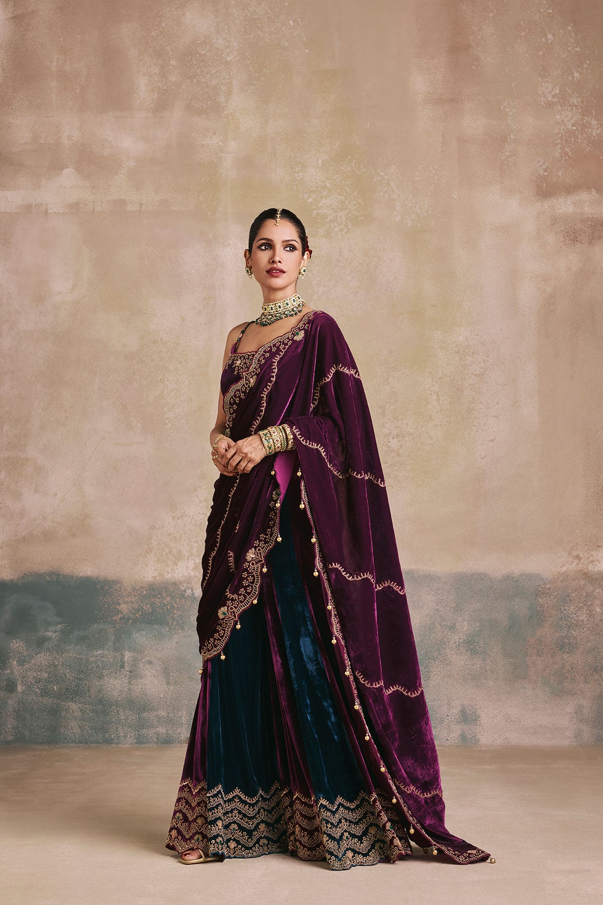 Crafted in two-tone plum and peacock blue silk velvet, this ensemble features a corset-style blouse, intricate embroidery, and a statement draped silhouette. A modern heirloom, perfect for the woman who commands attention.