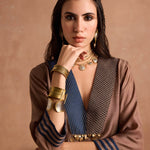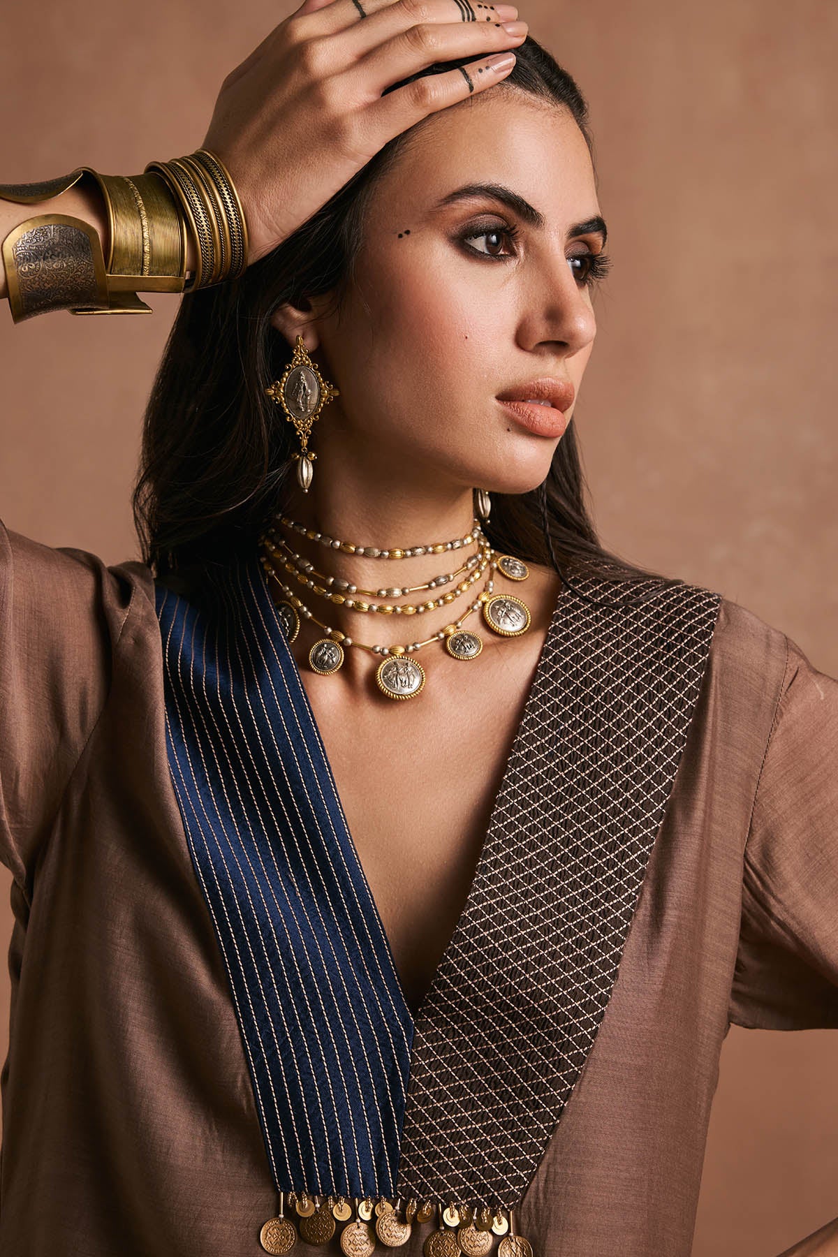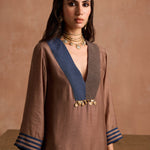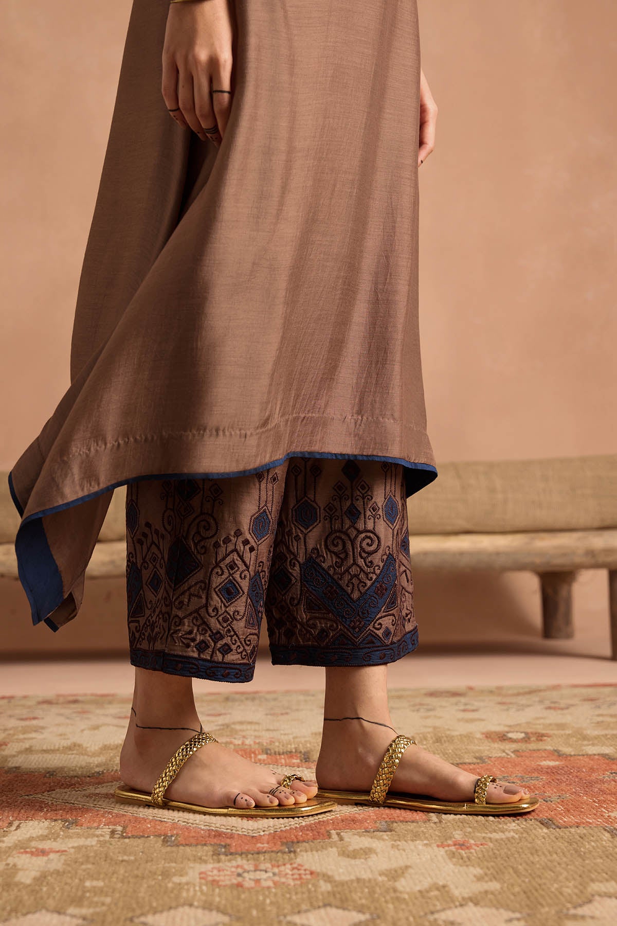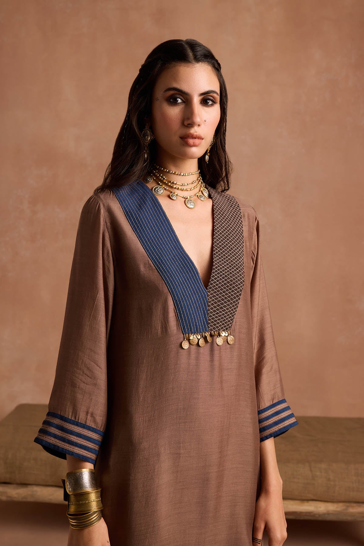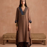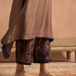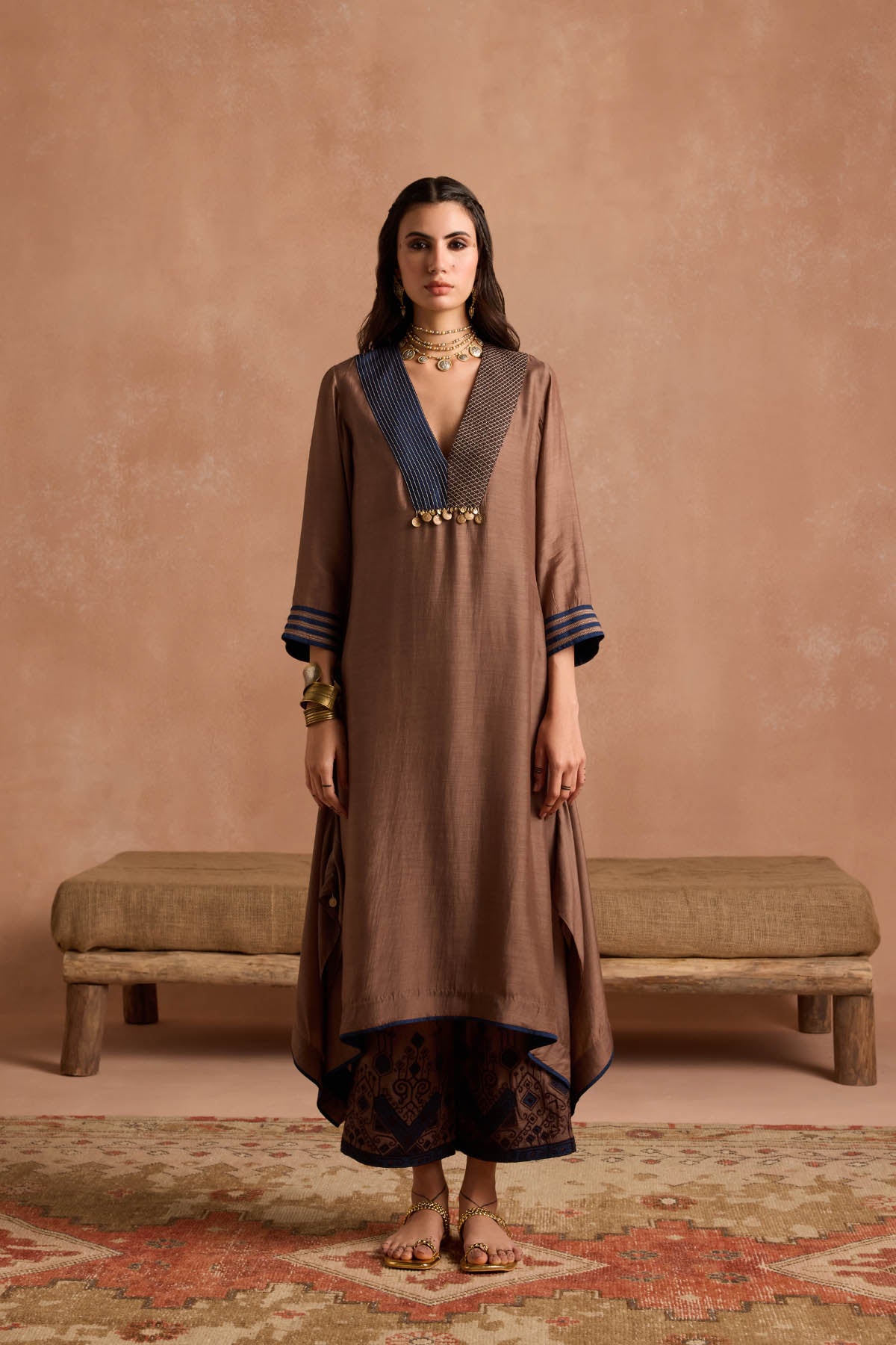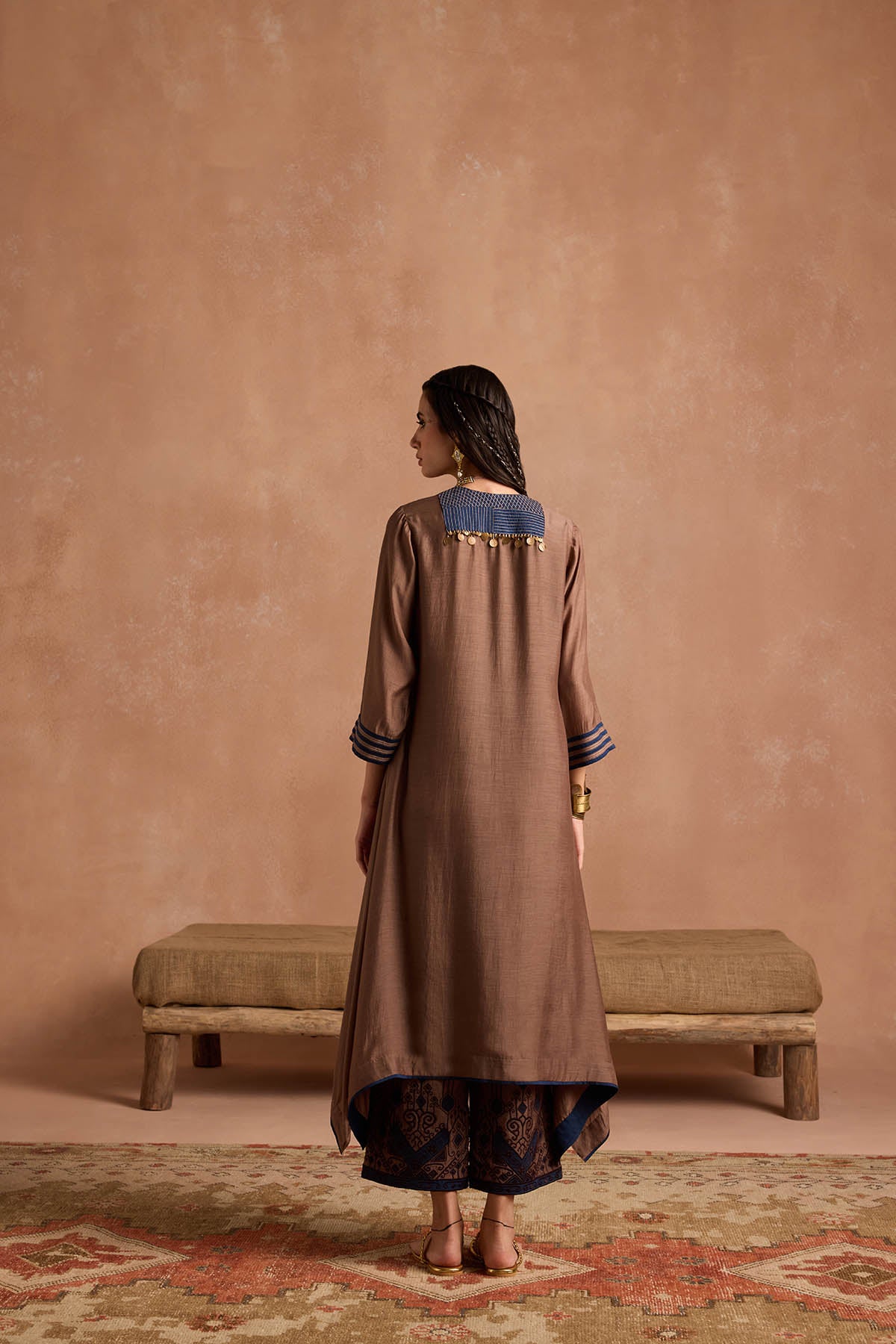 Introducing our Coffee Abstract Hemline Kurta Set, a fusion of modern design and traditional elegance. The rich coffee color is complemented by contrast navy thread embroidery on the palazzos while coin hangings along the yoke lend a playful touch. The abstract waterfall hemline is the standout feature of this set.
