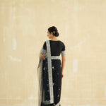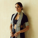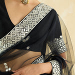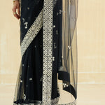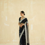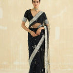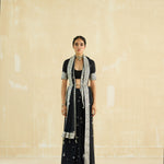 Every wardrobe needs a black saree—and this one’s made to be worn on repeat. Crafted in sheer net and embroidered with gota patti and delicate beadwork, it brings a modern edge to traditional craft. The silk chanderi blouse is pared back, with just a hint of matching embroidery on the sleeves.