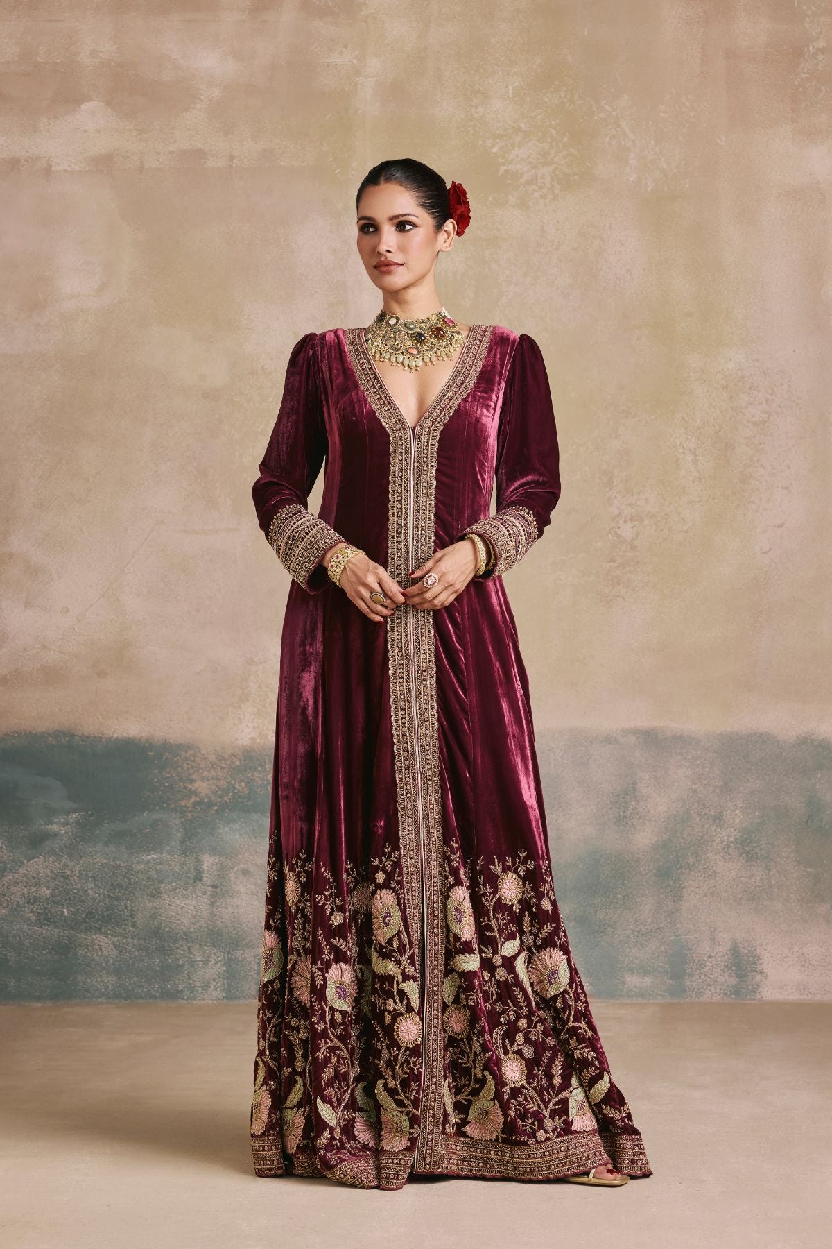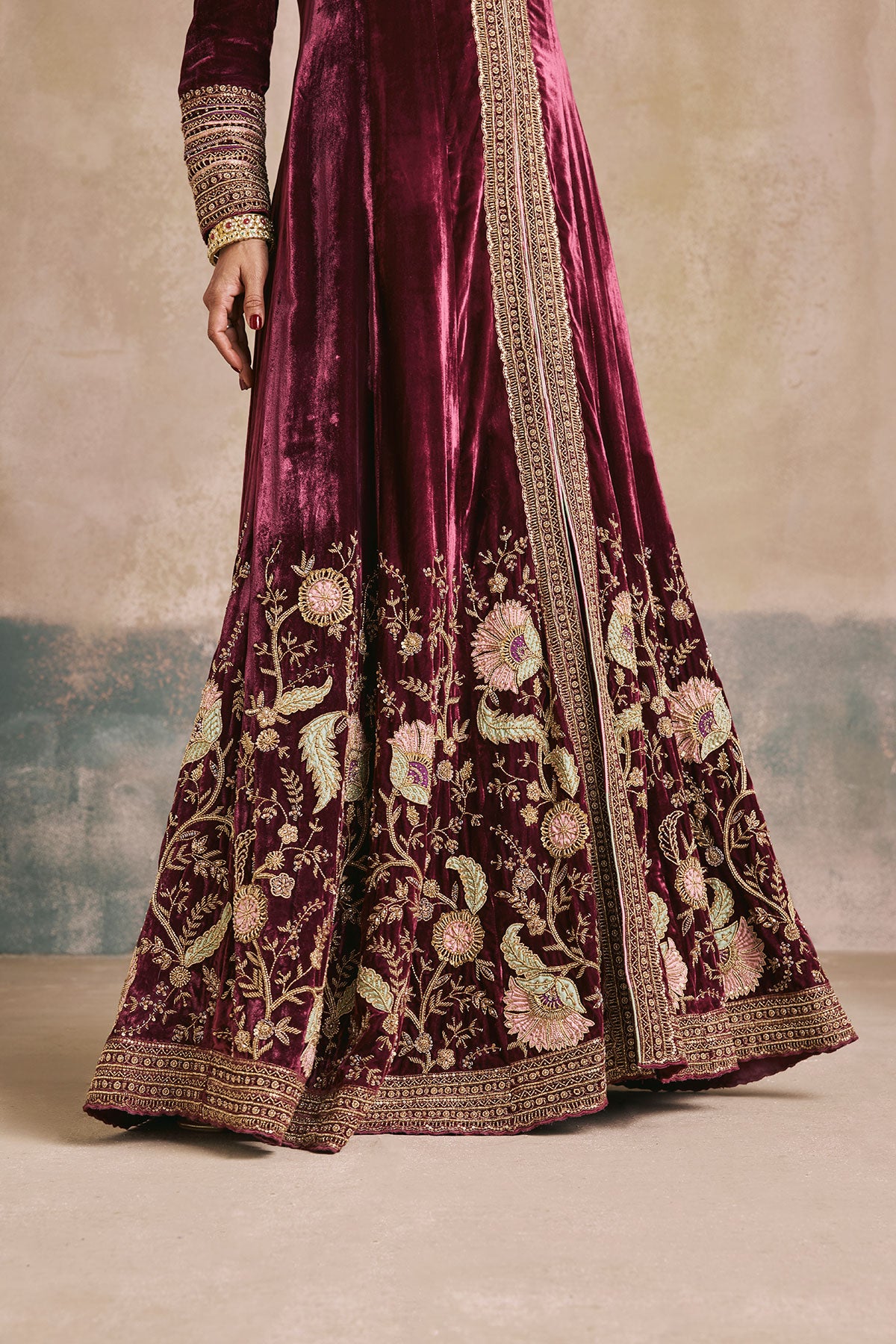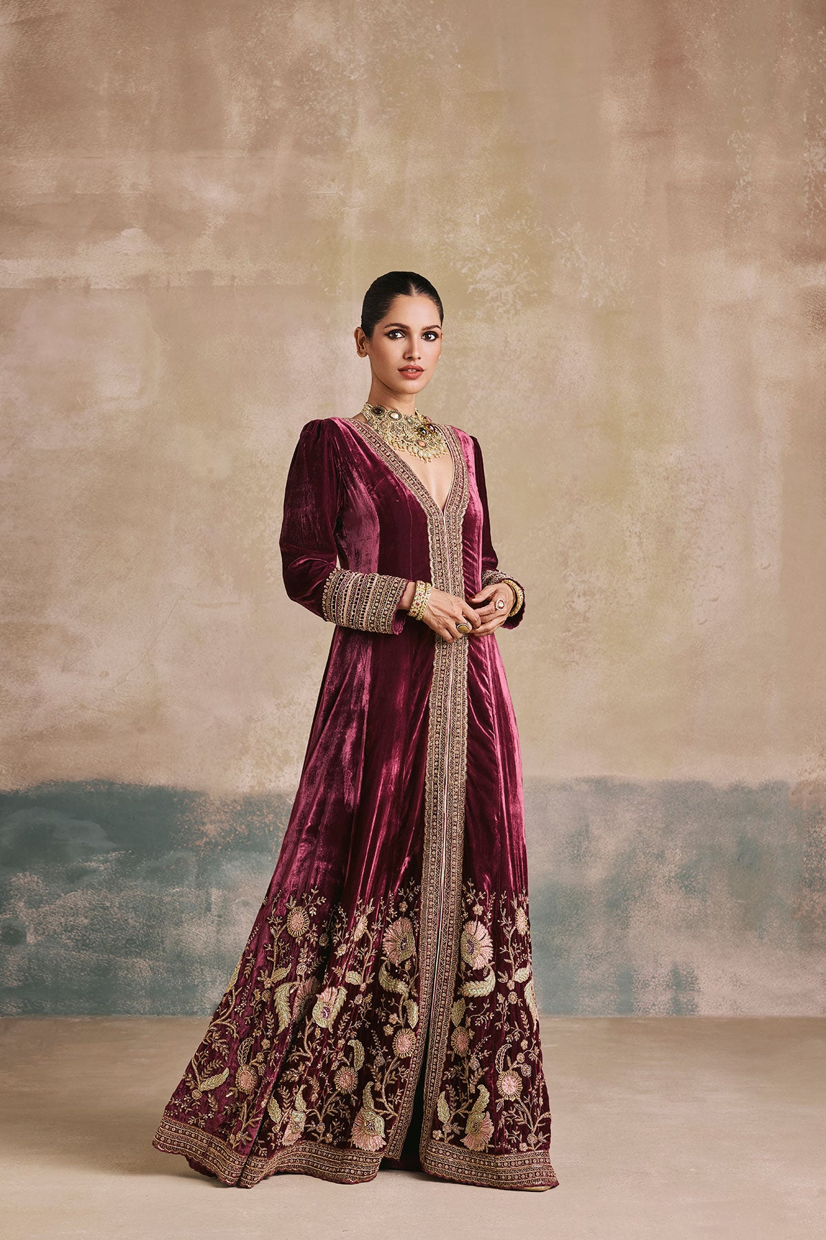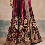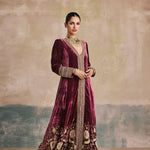 Step back in time – We’ve taken a regal silhouette from the Mughal era and kept its sanctity intact with our wine silk velvet anarkali. Antique gold aari and zardozi work dress the neckline and hem, while the use of beads and sequins enhance the royal undertones of this piece. We’ve styled it without a dupatta to marry the age old with the contemporary.