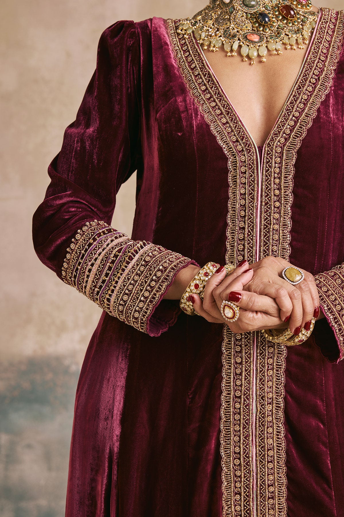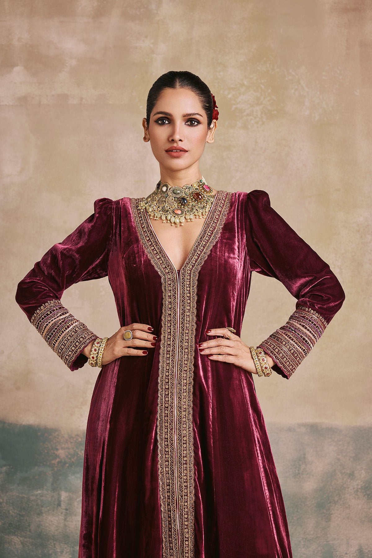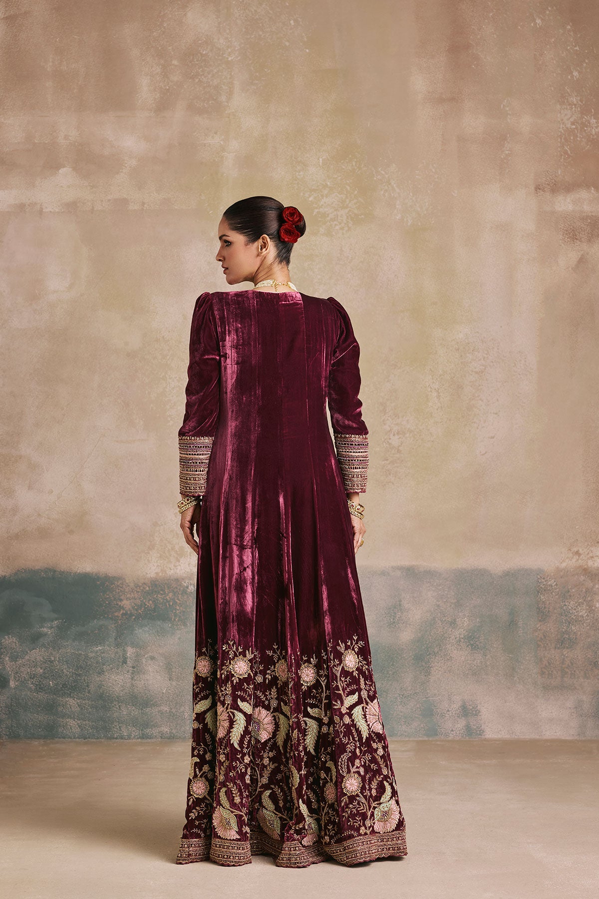 Step back in time – We’ve taken a regal silhouette from the Mughal era and kept its sanctity intact with our wine silk velvet anarkali. Antique gold aari and zardozi work dress the neckline and hem, while the use of beads and sequins enhance the royal undertones of this piece. We’ve styled it without a dupatta to marry the age old with the contemporary.