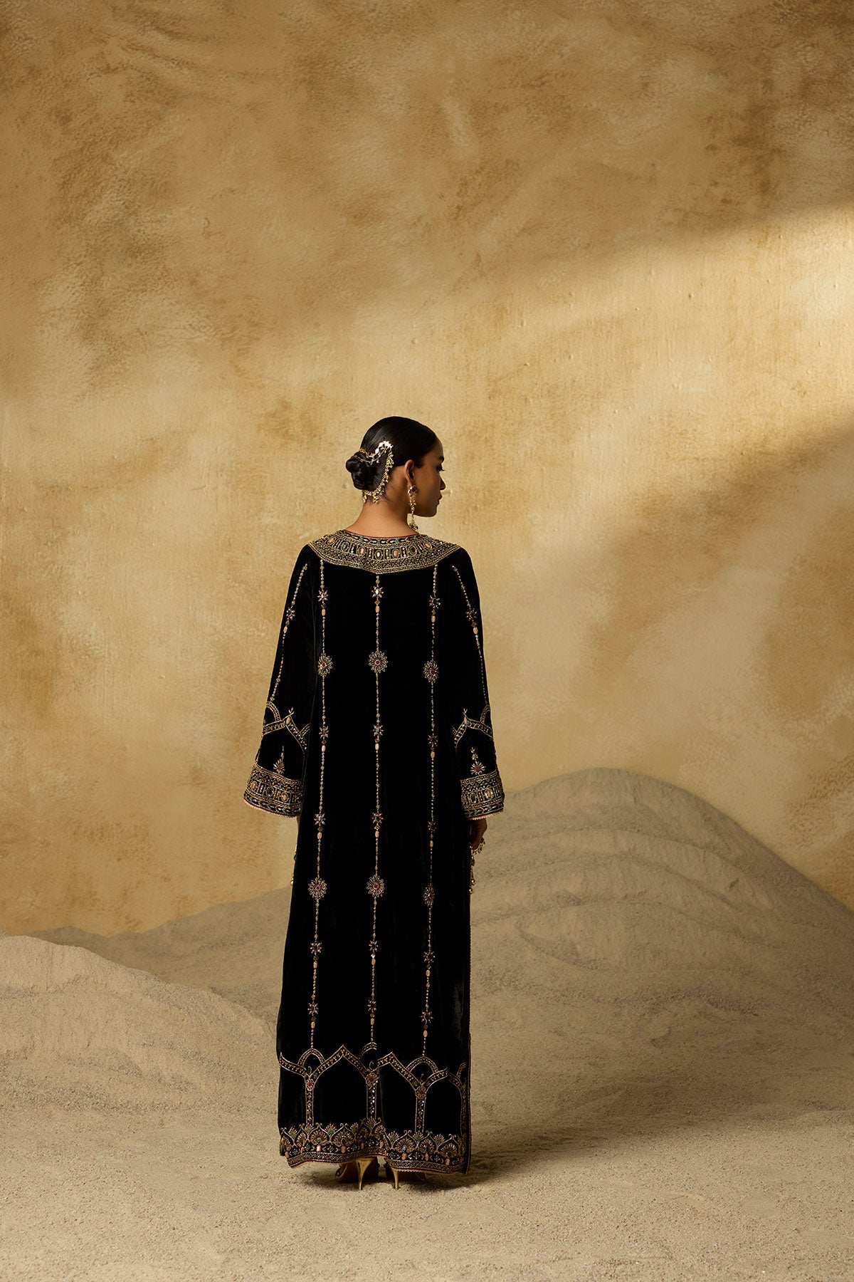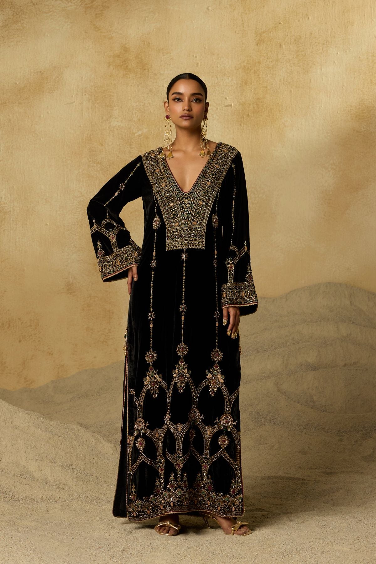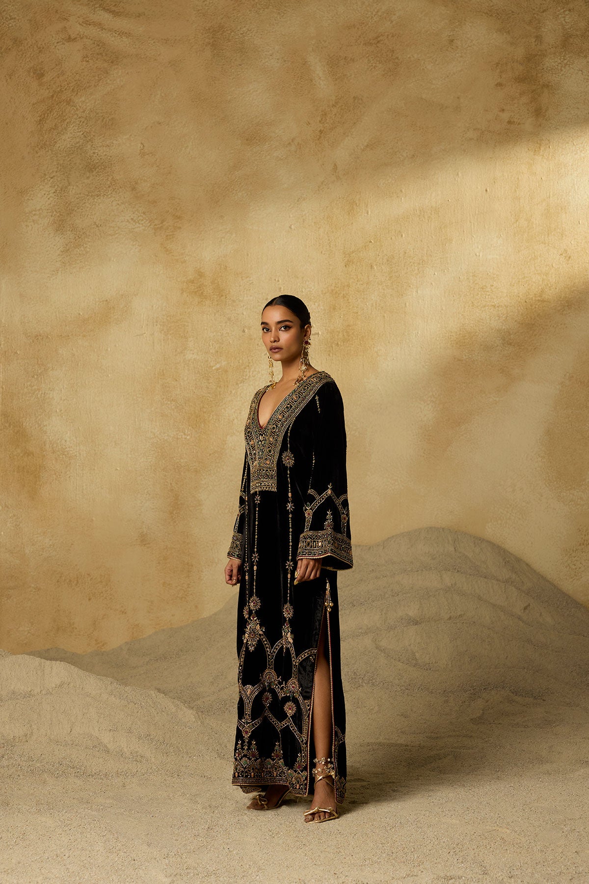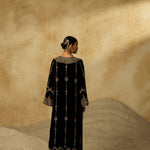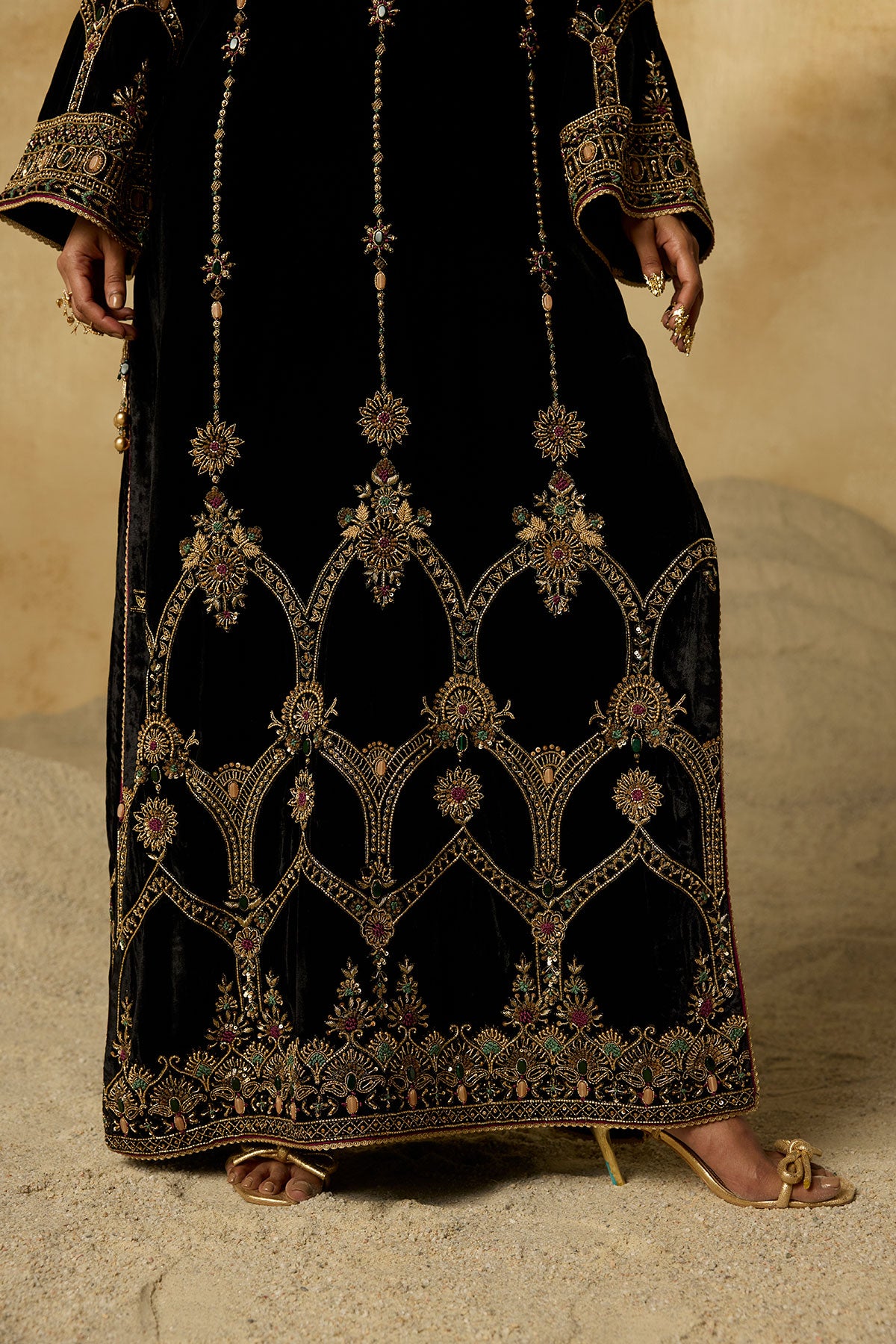 A silk velvet kaftan designed to move seamlessly from intimate gatherings to grand soirées. Antique gold handwork, dotted with gemstones, highlights geometric motifs, while bell sleeves lend fluid, sculptural elegance to the silhouette.