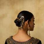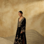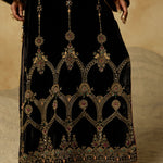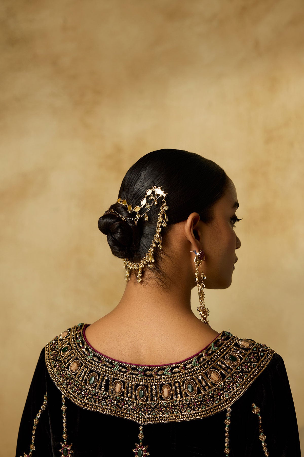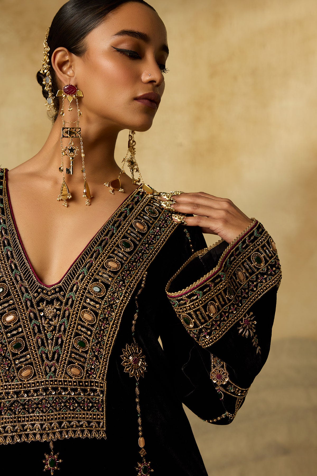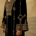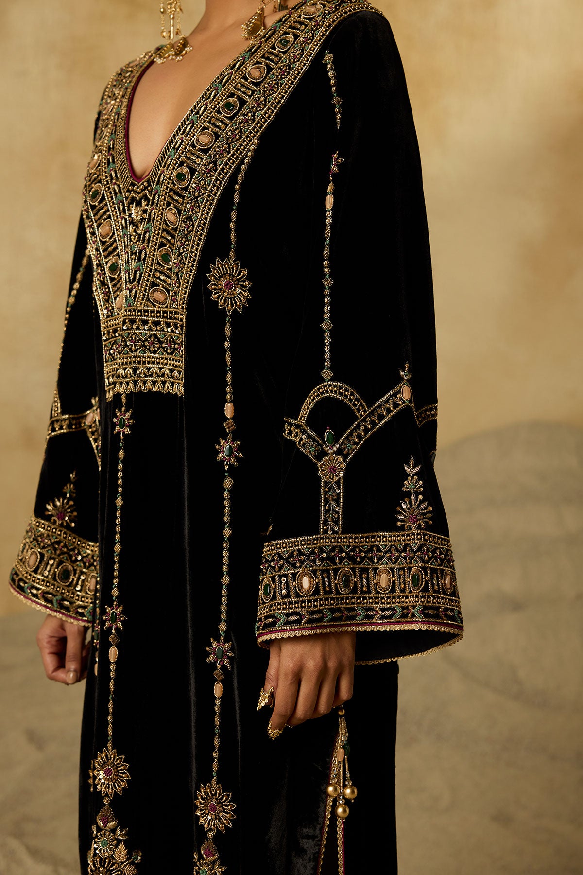 A silk velvet kaftan designed to move seamlessly from intimate gatherings to grand soirées. Antique gold handwork, dotted with gemstones, highlights geometric motifs, while bell sleeves lend fluid, sculptural elegance to the silhouette.