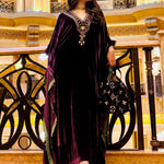 Wine silk velvet drapes down the shoulder to the ankle in this floor-skimming kaftan with a plunging neckline and contrast silk panel hemming the inside. An intricately embroidered yoke is what makes this otherwise casual look go the extra mile.