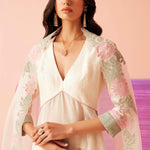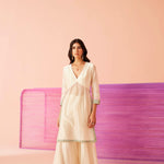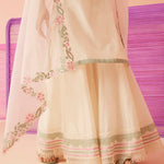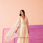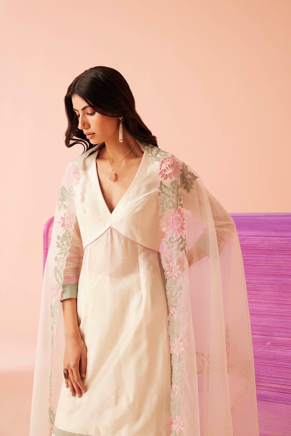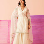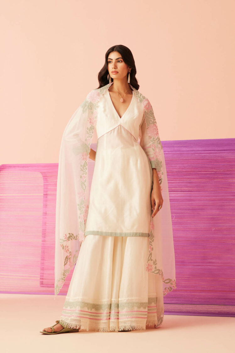 This ivory kurta set is the epitome of summer elegance. The intricate detailing of the sea green striped patches and laces on the kurta and gharara create a playful yet sophisticated look. The organza dupatta, featuring delicate floral embroidery in shades of rose pink and sea green, adds a touch of romanticism to the overall ensemble.