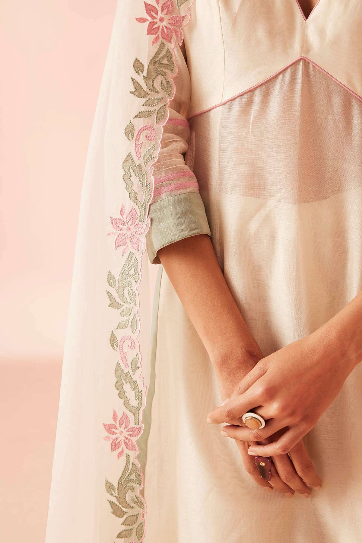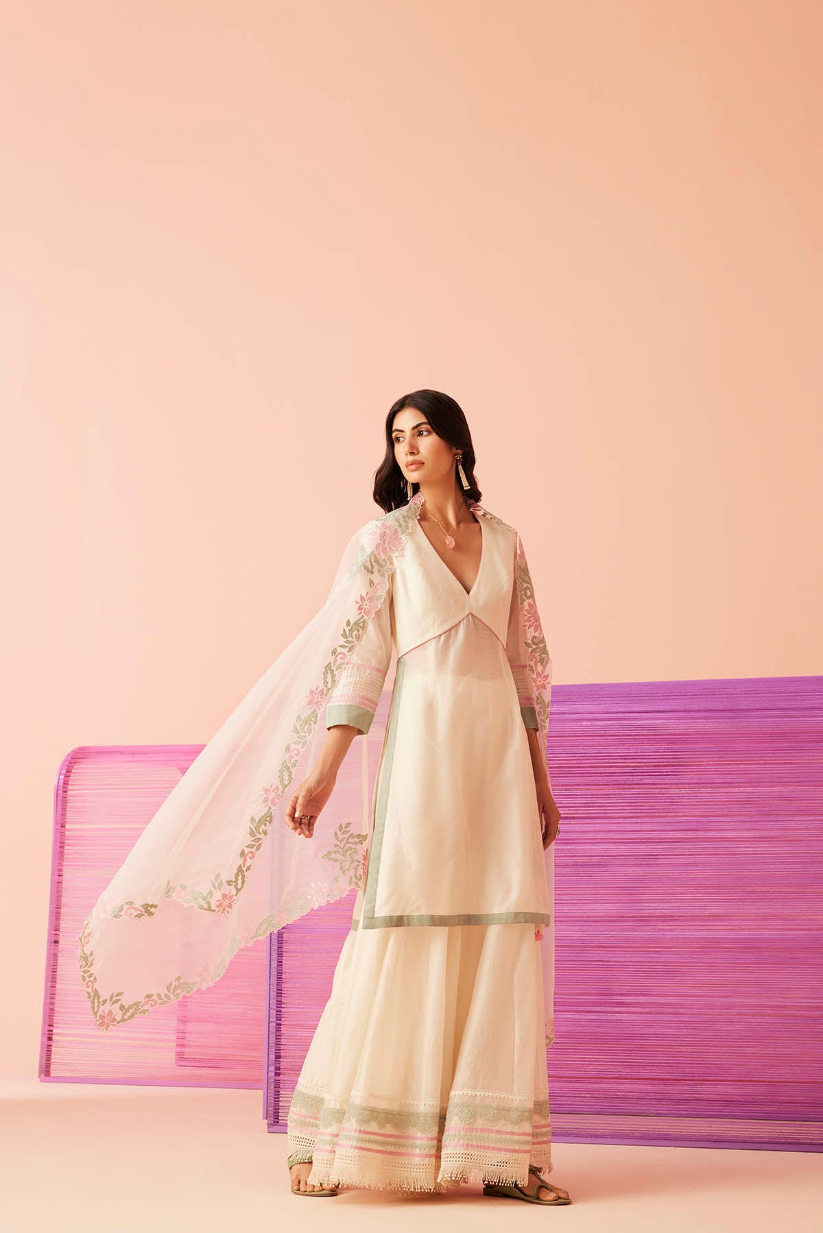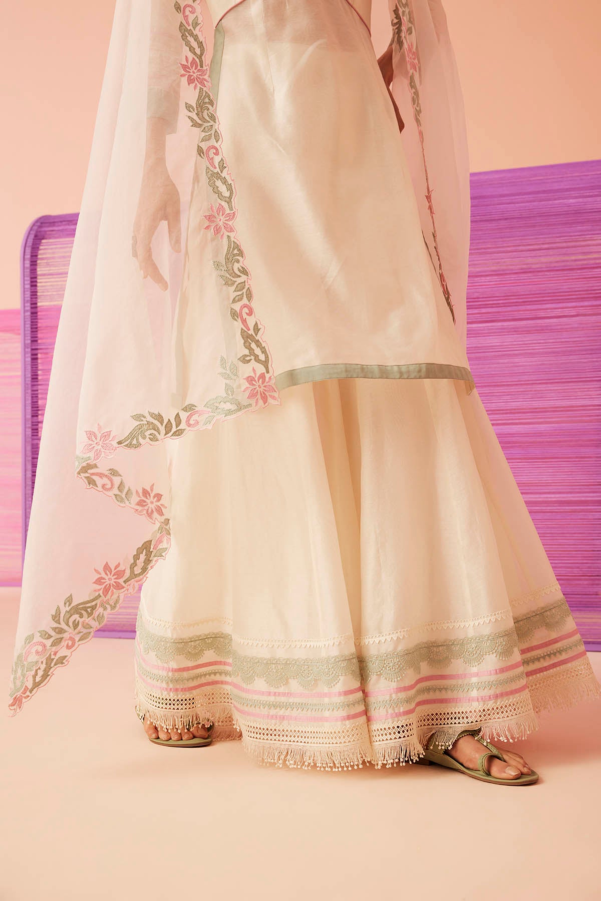 This ivory kurta set is the epitome of summer elegance. The intricate detailing of the sea green striped patches and laces on the kurta and gharara create a playful yet sophisticated look. The organza dupatta, featuring delicate floral embroidery in shades of rose pink and sea green, adds a touch of romanticism to the overall ensemble.